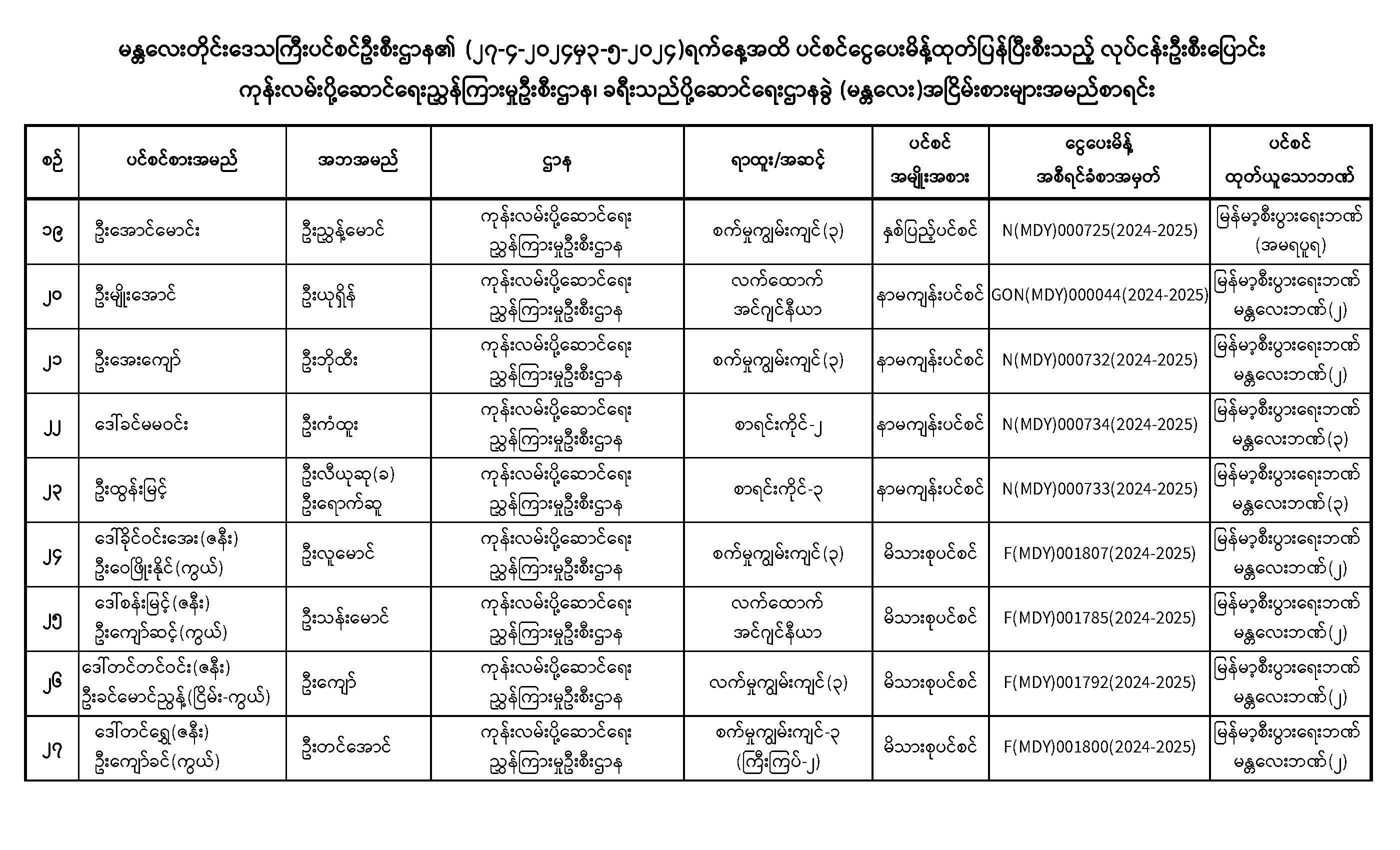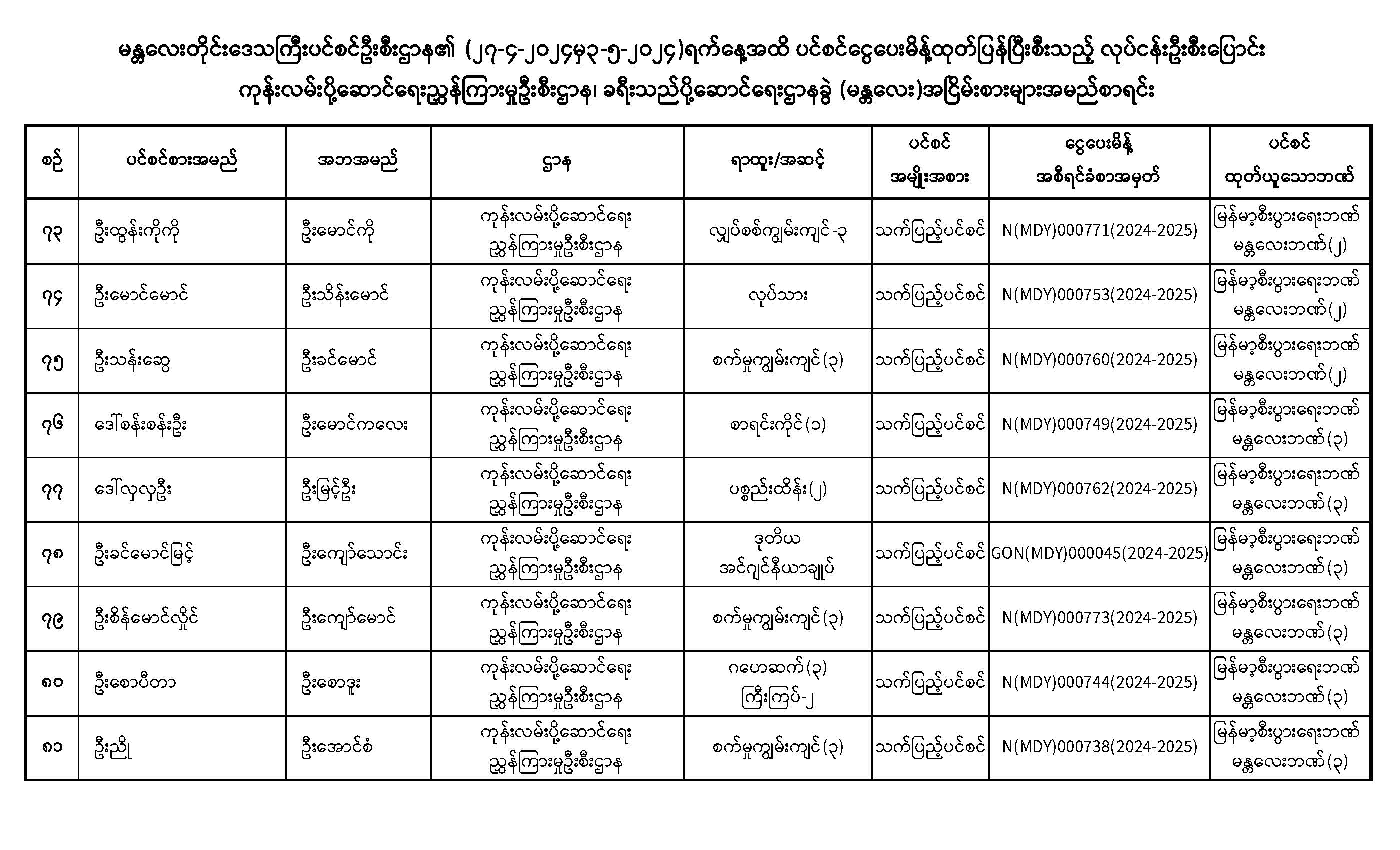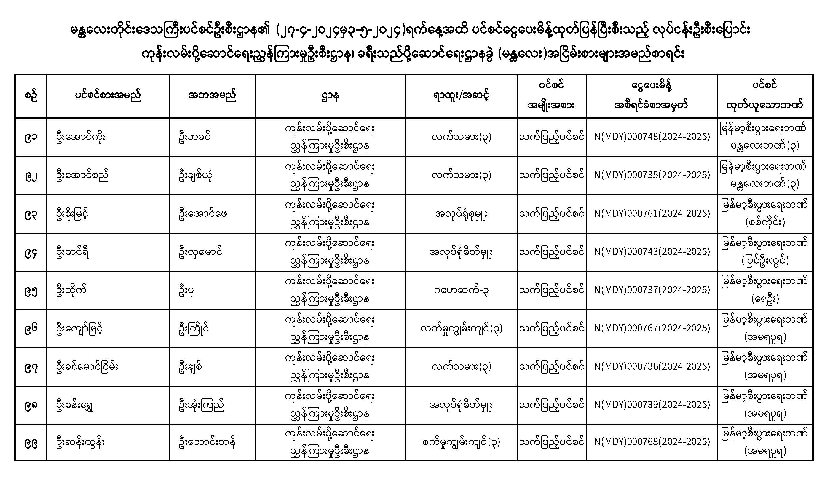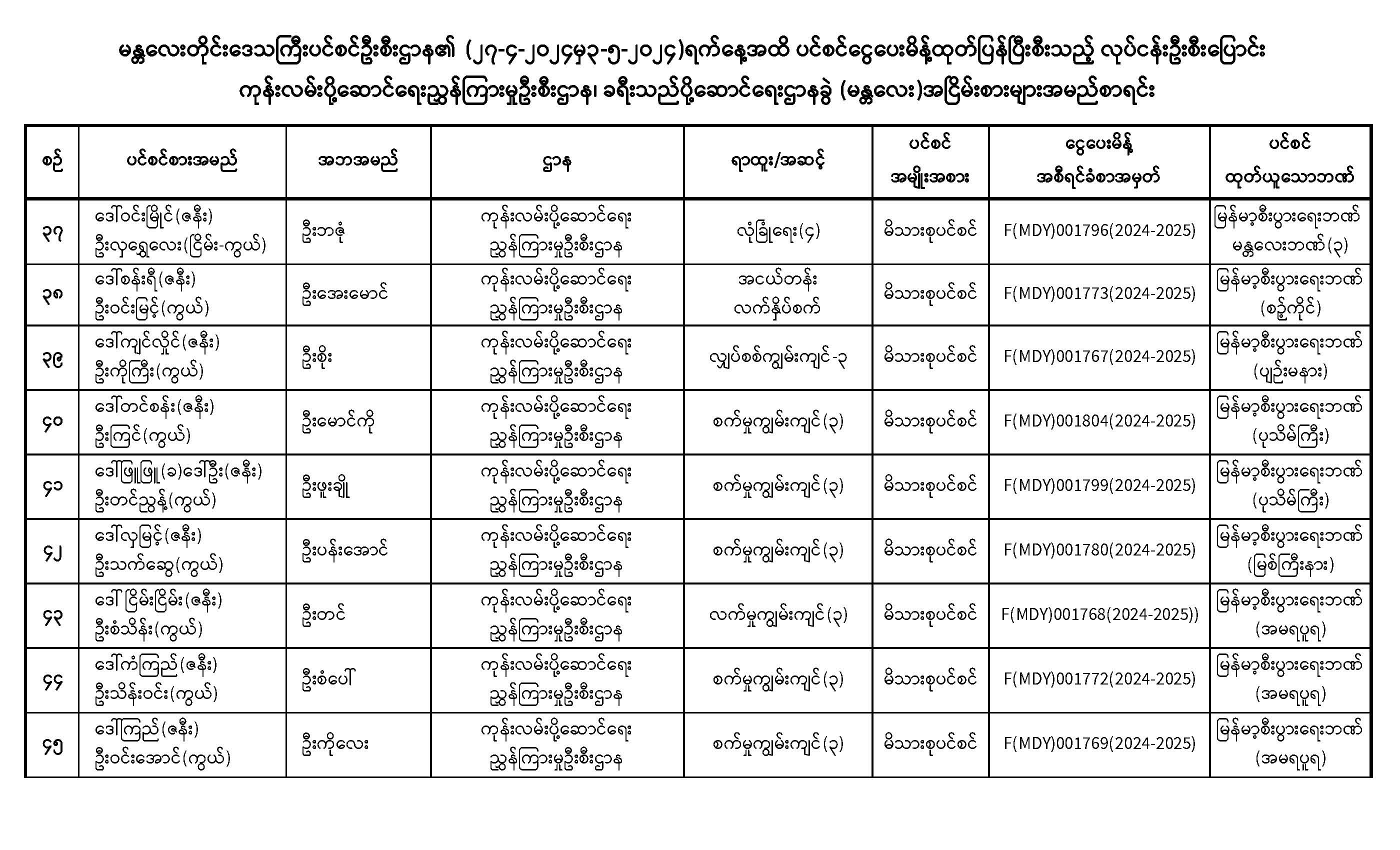 ပင်စင်ဦးစီးဌာန၊ မန္တလေးတိုင်းဒေသကြီးဦးစီးမှူးရုံး၏ လုပ်ငန်းမှ ဦးစီးပြောင်း ငွေပေးမိန့်ထုတ်ပြန်မှုစာရင်း (၂၇-၄-၂၀၂၄ မှ ၃-၅-၂၀၂၄)