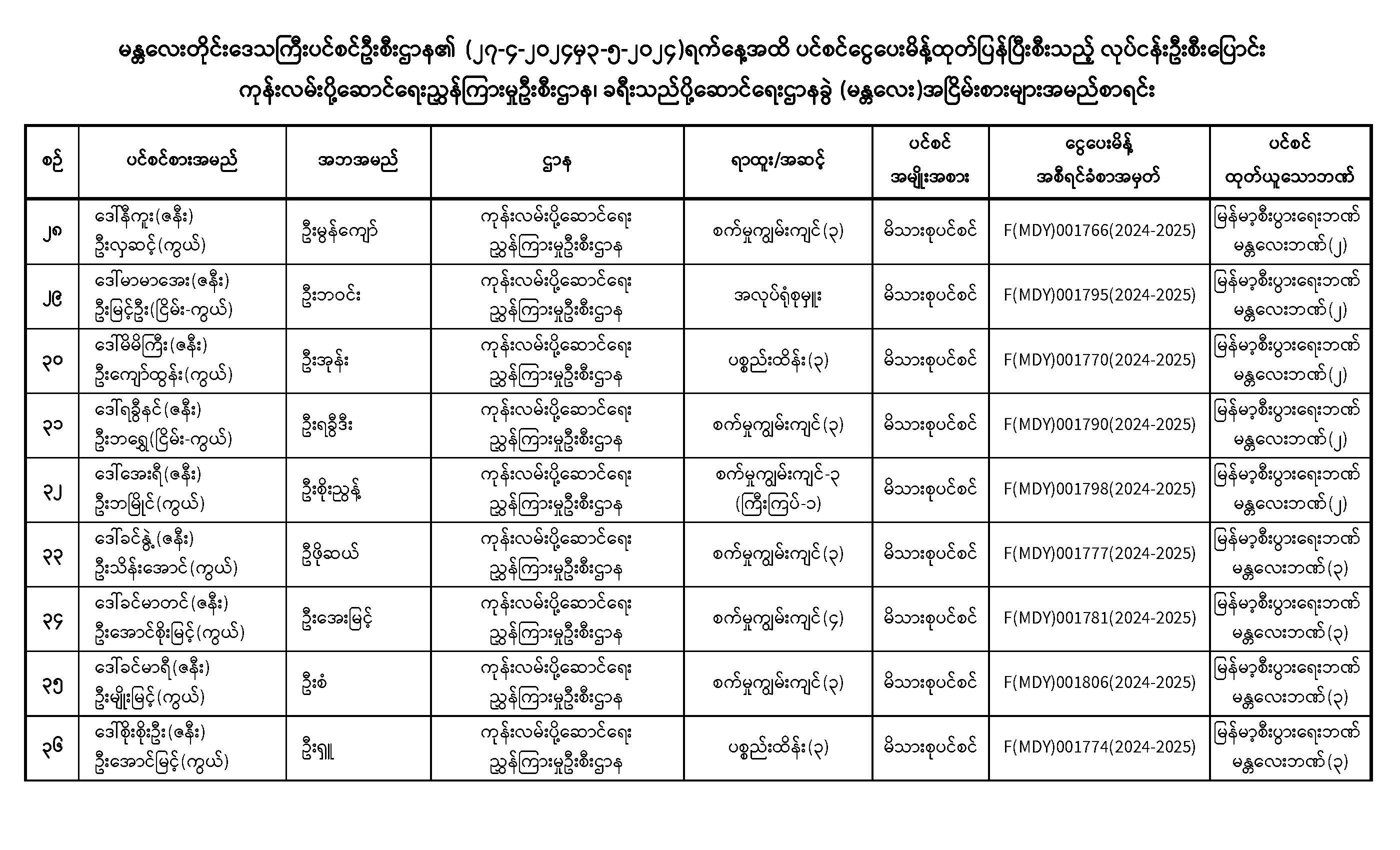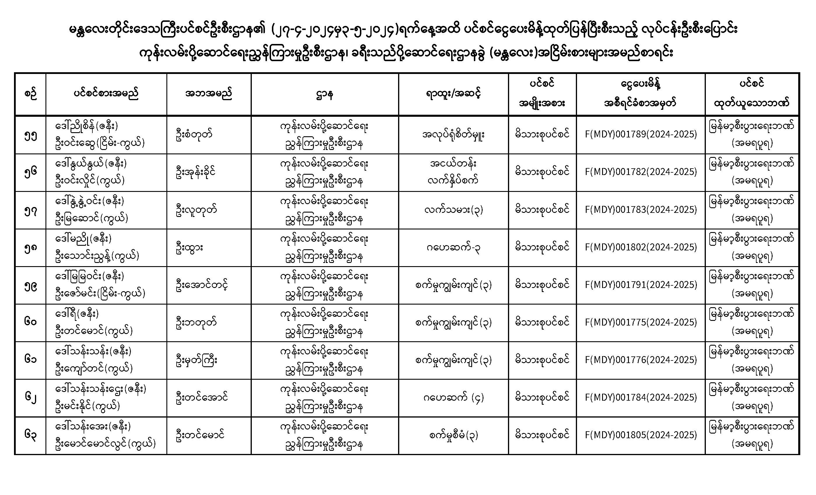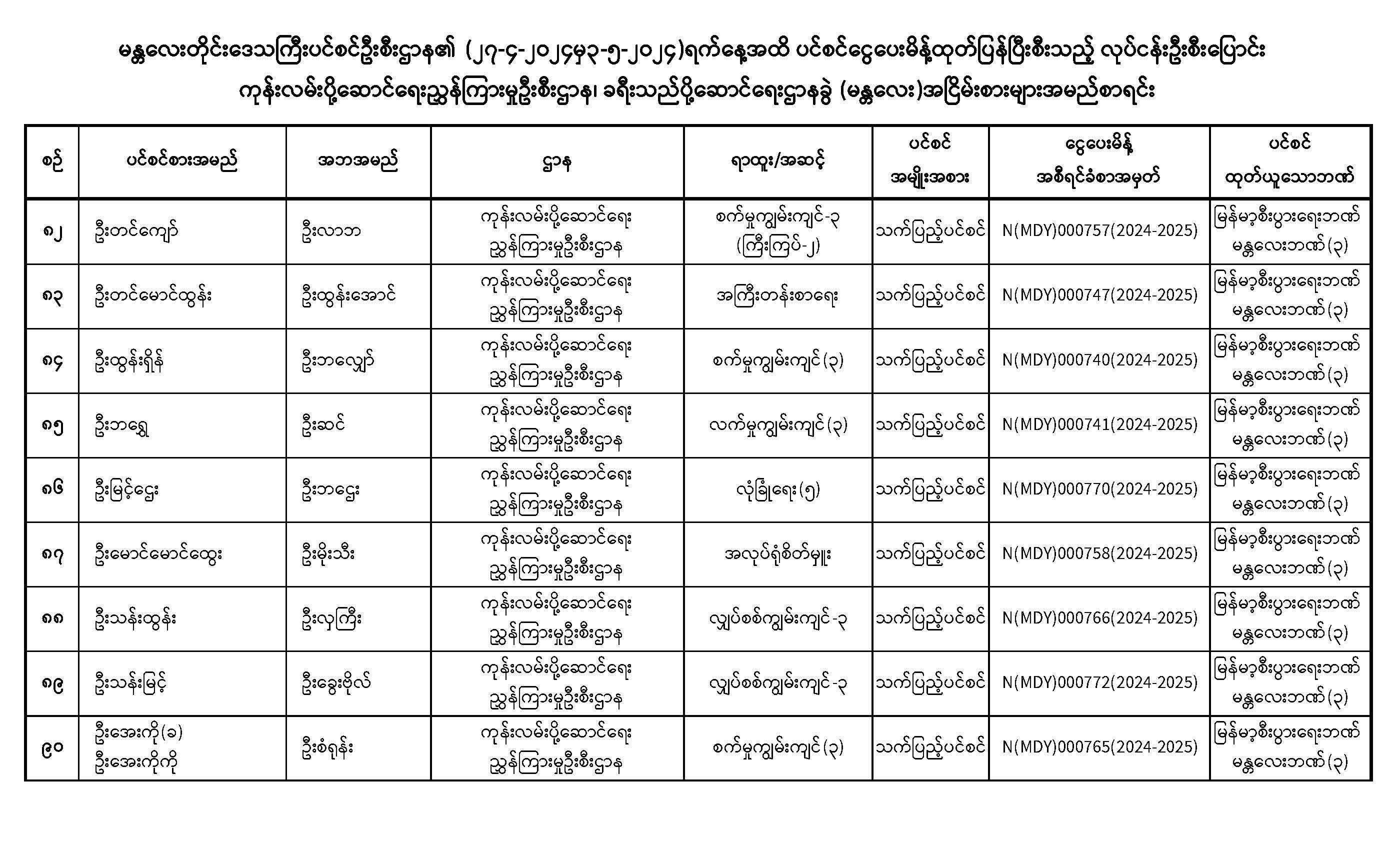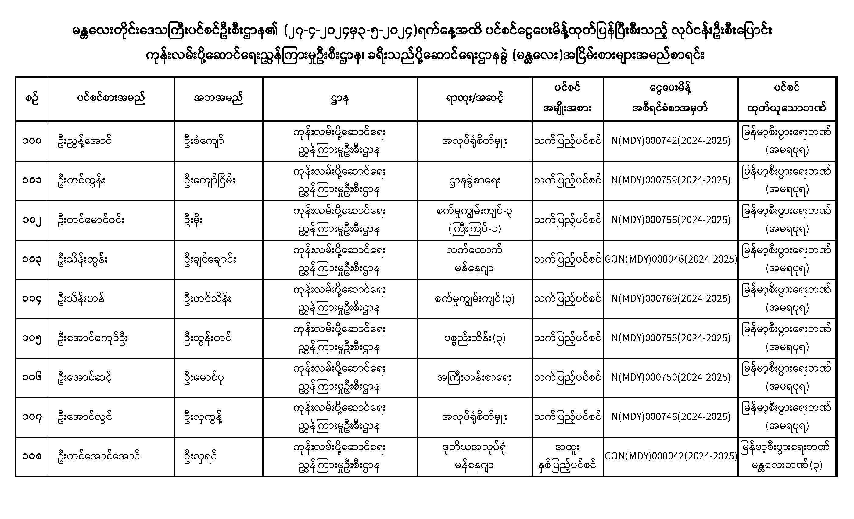 ပင်စင်ဦးစီးဌာန၊ မန္တလေးတိုင်းဒေသကြီးဦးစီးမှူးရုံး၏ လုပ်ငန်းမှ ဦးစီးပြောင်း ငွေပေးမိန့်ထုတ်ပြန်မှုစာရင်း (၂၇-၄-၂၀၂၄ မှ ၃-၅-၂၀၂၄)