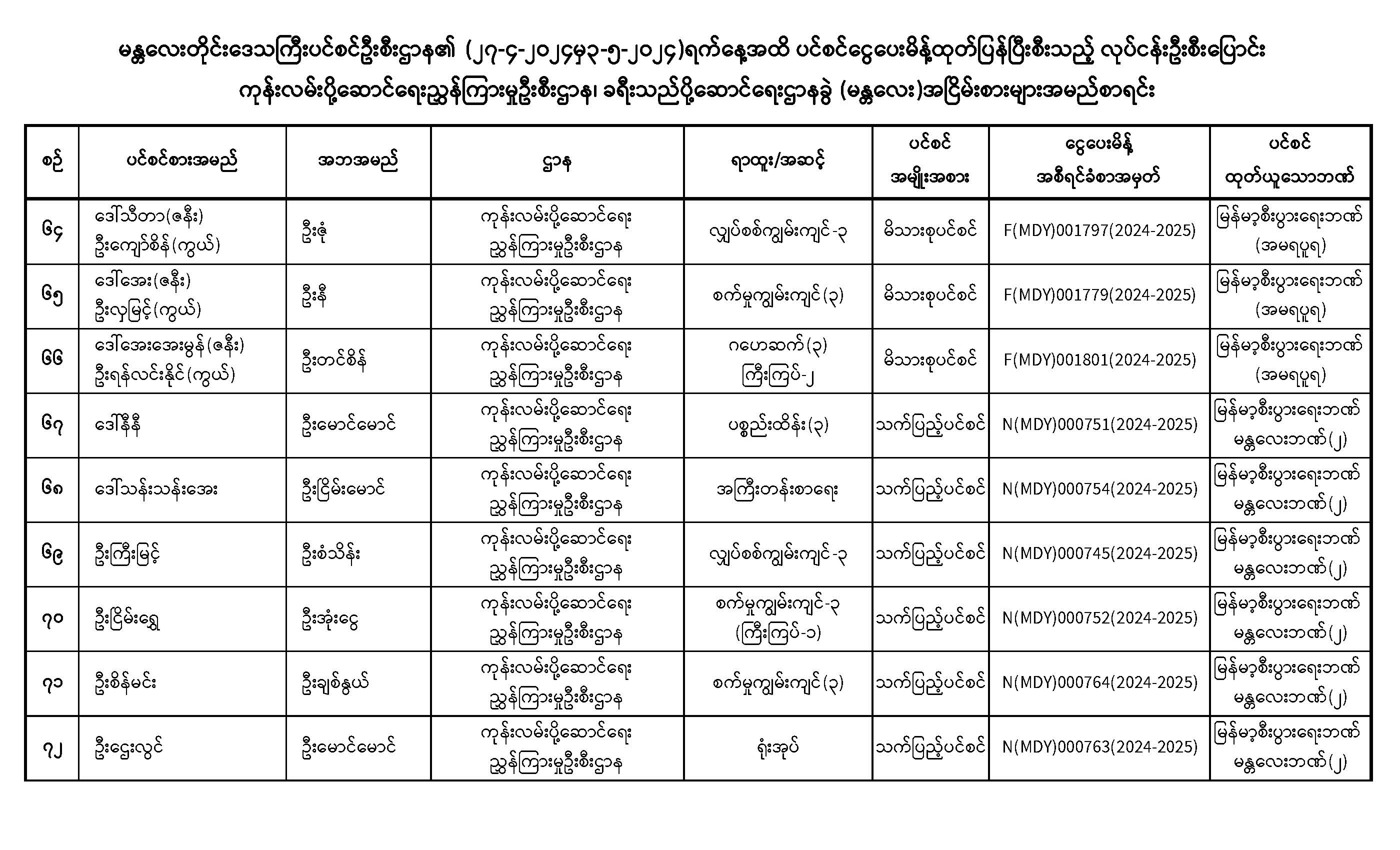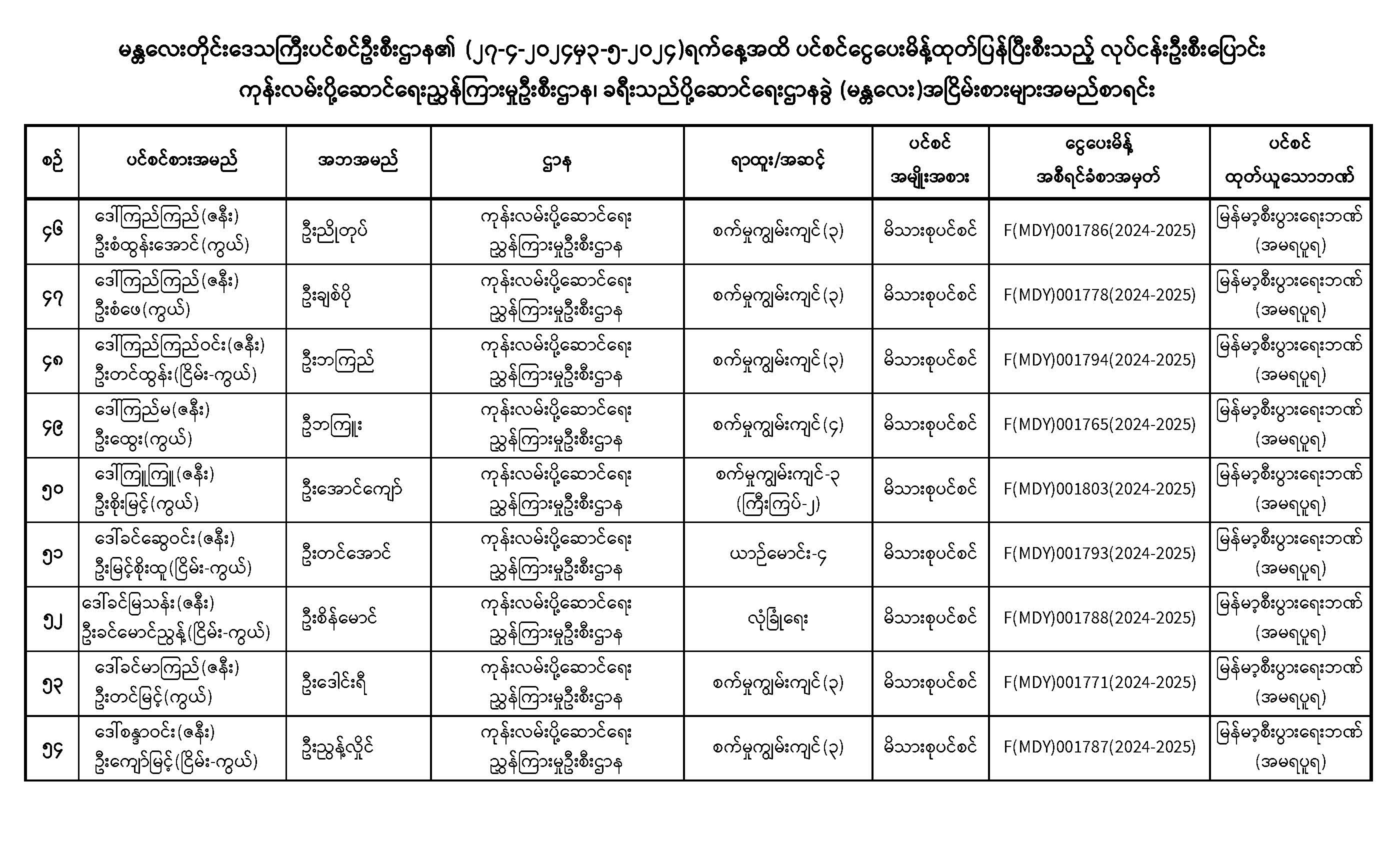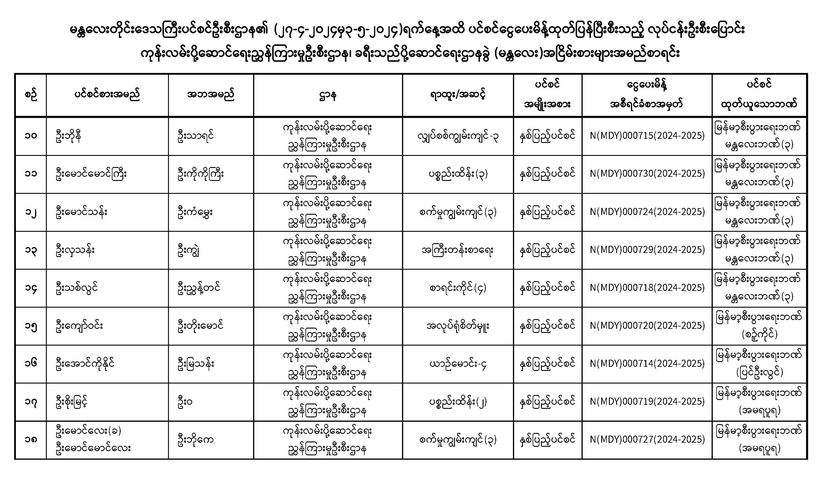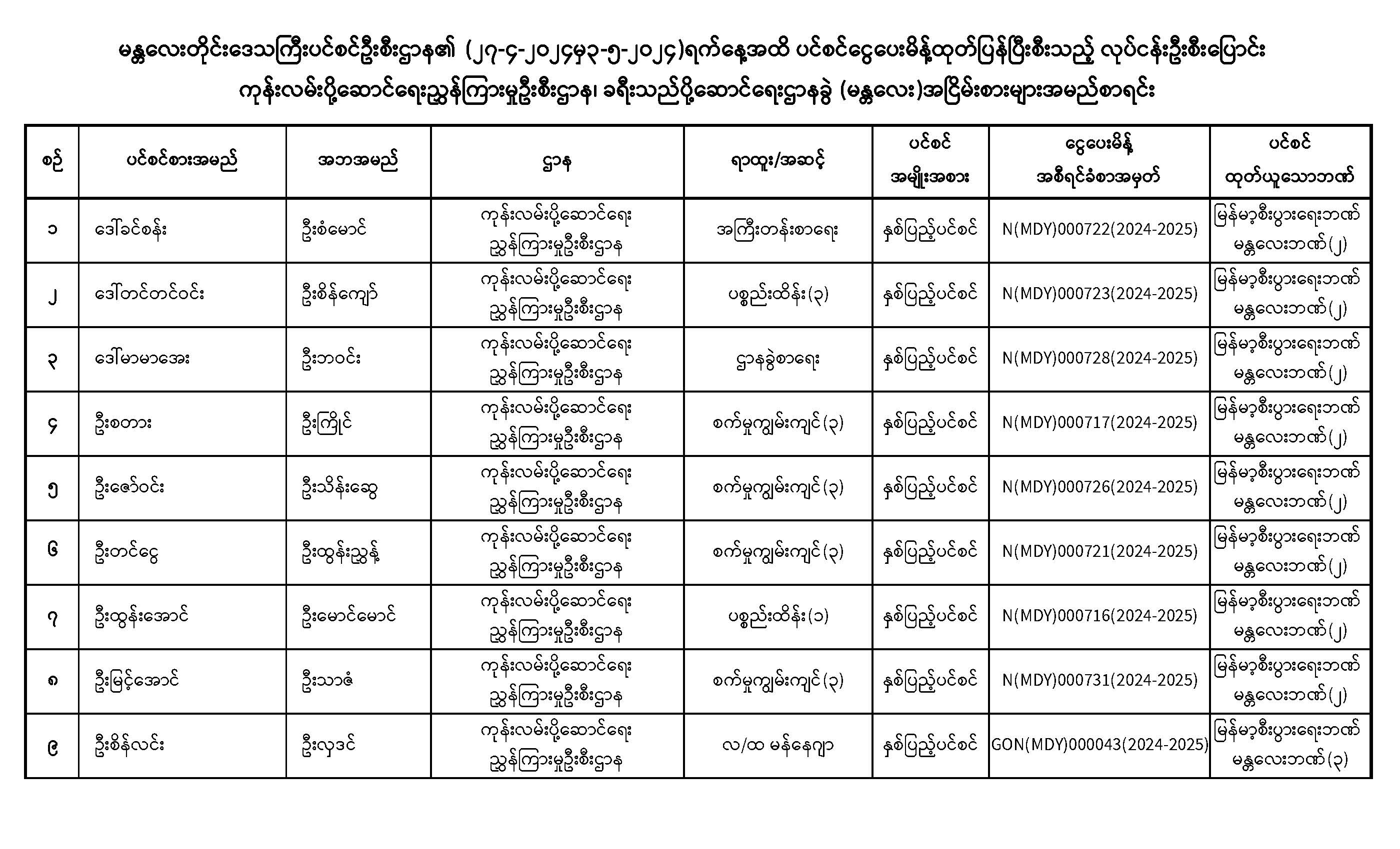 ပင်စင်ဦးစီးဌာန၊ မန္တလေးတိုင်းဒေသကြီးဦးစီးမှူးရုံး၏ လုပ်ငန်းမှ ဦးစီးပြောင်း ငွေပေးမိန့်ထုတ်ပြန်မှုစာရင်း (၂၇-၄-၂၀၂၄ မှ ၃-၅-၂၀၂၄)