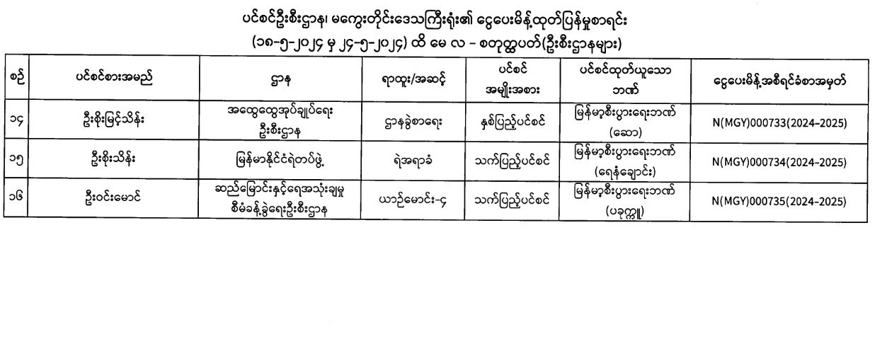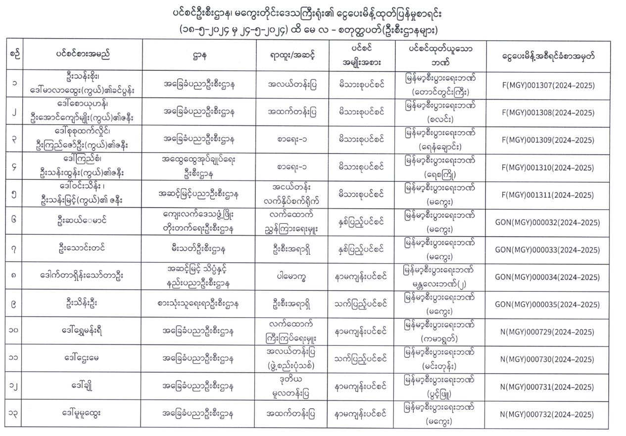 ပင်စင်ဦးစီးဌာန ၊ မကွေးတိုင်းဒေသကြီး၏ မေလအတွင်း ငွေပေးမိန့်ထုတ်ပြန်မှုစာရင်း pdfinance_editor Mon, 08/05/2024 - 13:16