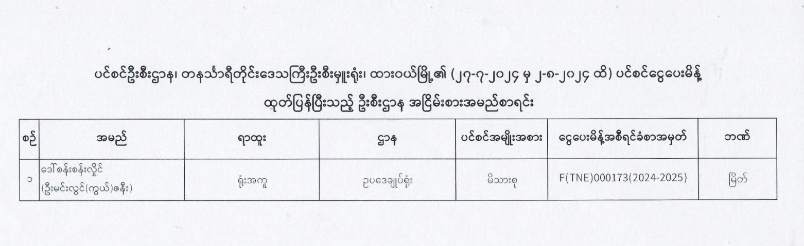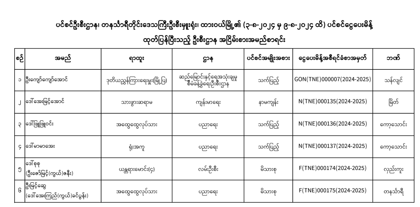 ပင်စင်ဦးစီးဌာန ၊ တနင်္သာရီတိုင်းဒေသကြီး၏ ငွေပေးမိန့်ထုတ်ပြန်မှုစာရင်း (၂၇-၇-၂၀၂၄ မှ ၁၆-၈-၂၀၂၄)