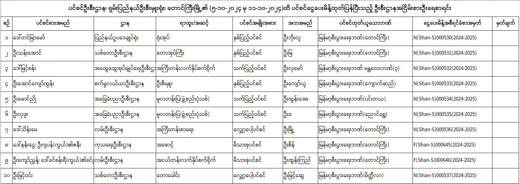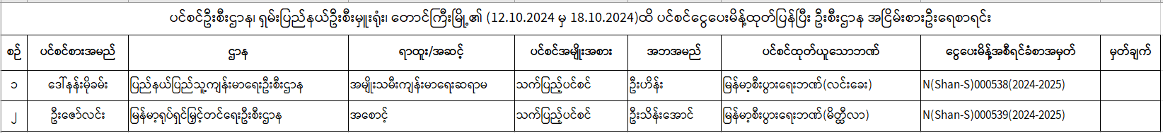 ပင်စင်ဦးစီးဌာန၊ ရှမ်းပြည်နယ်ဦးစီးမှူးရုံး၏ ငွေပေးမိန့်ထုတ်ပြန်မှုစာရင်း (၅-၁၀-၂၀၂၄ မှ ၁၈-၁၀-၂၀၂၄) pdfinance_editor Wed, 10/23/2024 - 10:01
