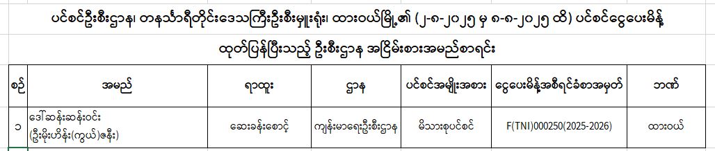 ပင်စင်ဦးစီးဌာန၊ တနင်္သာရီတိုင်းဒေသကြီးဦးစီးမှူးရုံး၏ ငွေပေးမိန့်ထုတ်ပြန်မှုစာရင်း (၂-၈-၂၀၂၅ မှ ၈-၈-၂၀၂၅) pdfinance_editor Tue, 08/12/2025 - 11:56
