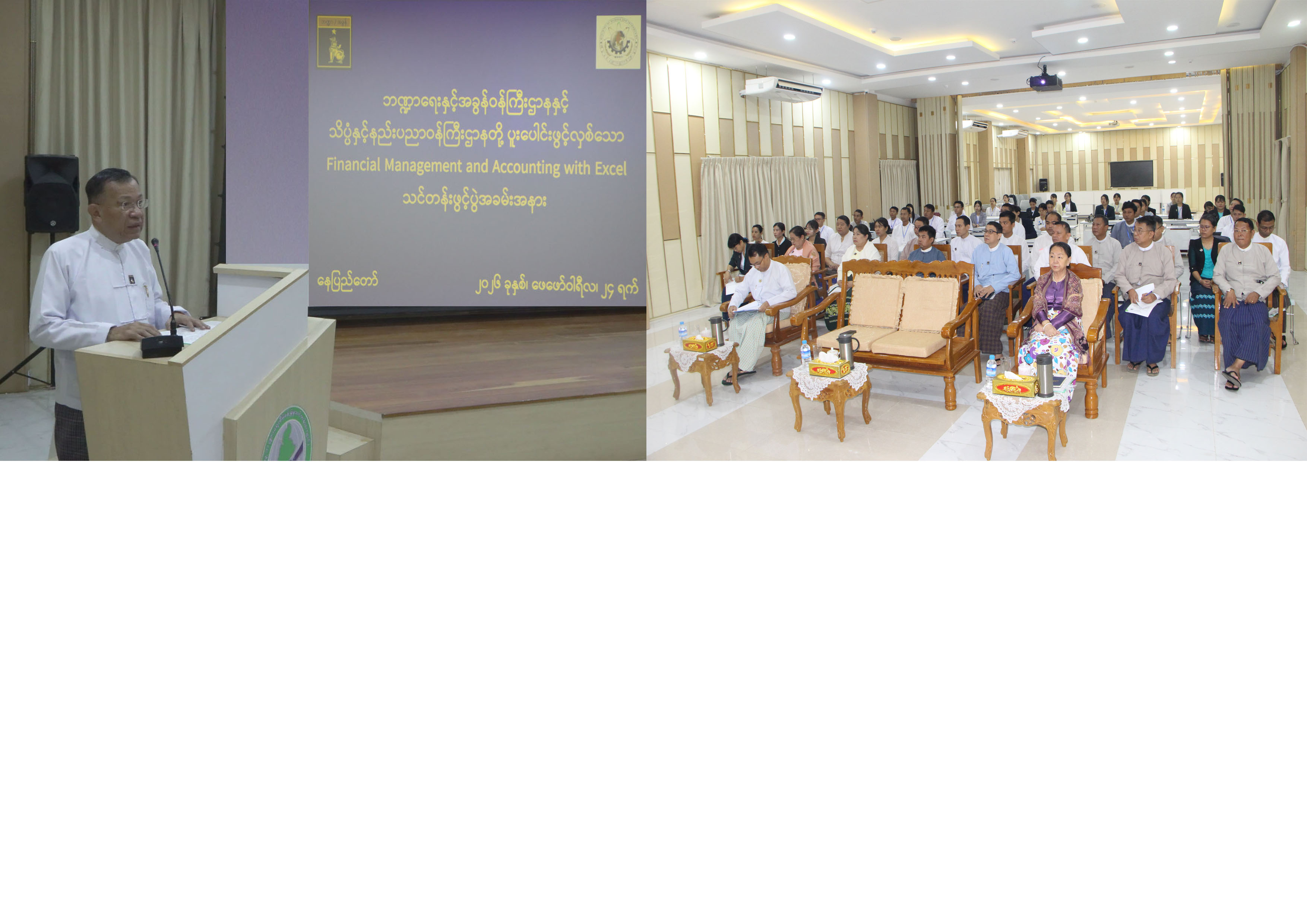 ဘဏ္ဍာရေးနှင့်အခွန်ဝန်ကြီးဌာနနှင့် သိပ္ပံနှင့်နည်းပညာဝန်ကြီးဌာနတို့ ပူးပေါင်းဖွင့်လှစ် သော Financial Management and Accounting with EXCEL သင်တန်း ဖွင့်ပွဲအခမ်းအနား ကို ယနေ့နံနက်ပိုင်းတွင် နေပြည်တော်ရှိ ဘဏ္ဍာရေးနှင့်အခွန်ဝန်ကြီးဌာန၊ ပြည်သူ့ဘဏ္ဍာရေး စီမံခန့်ခွဲမှု သင်တန်းကျောင်းတွင် ကျင်းပသည်။
