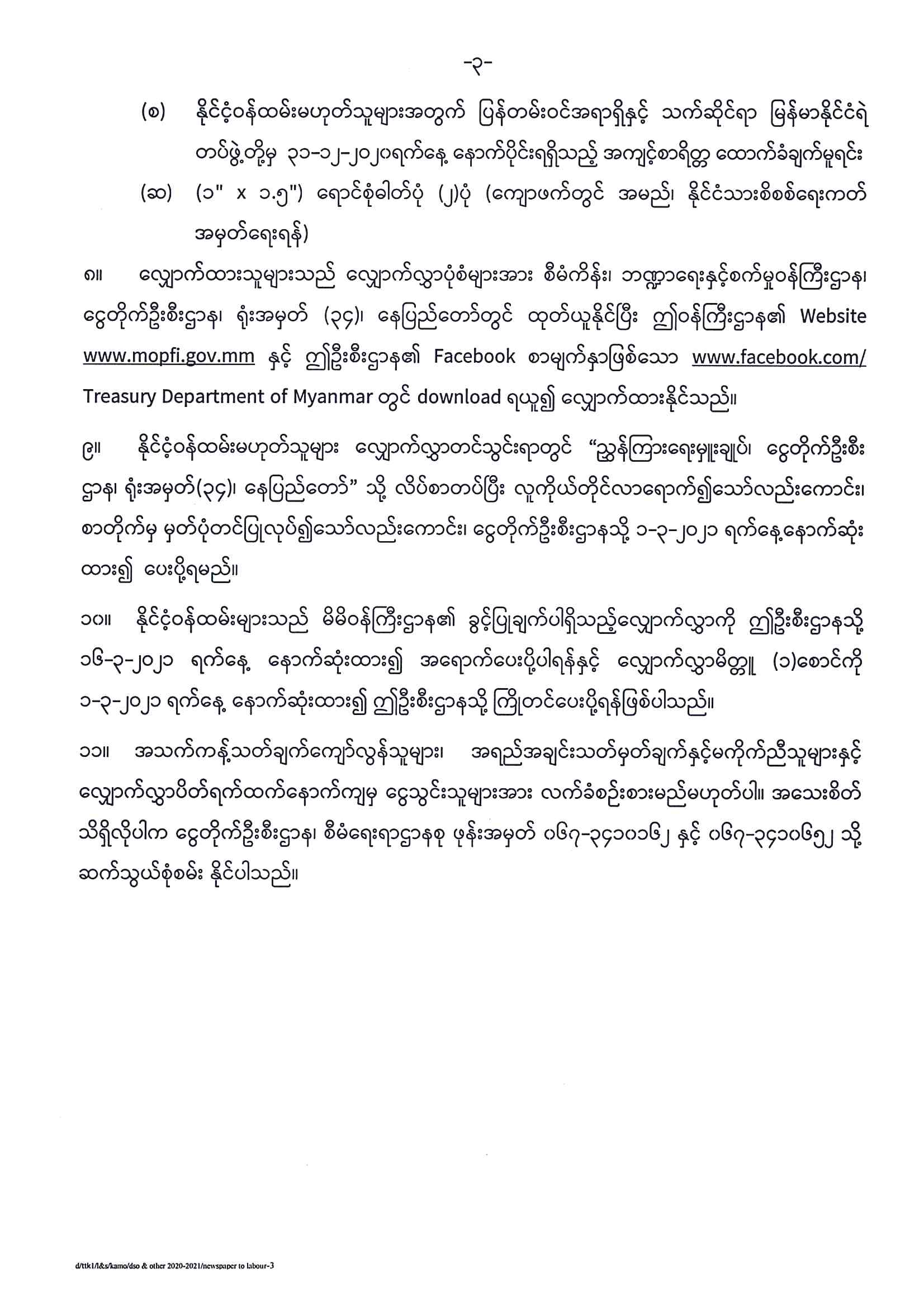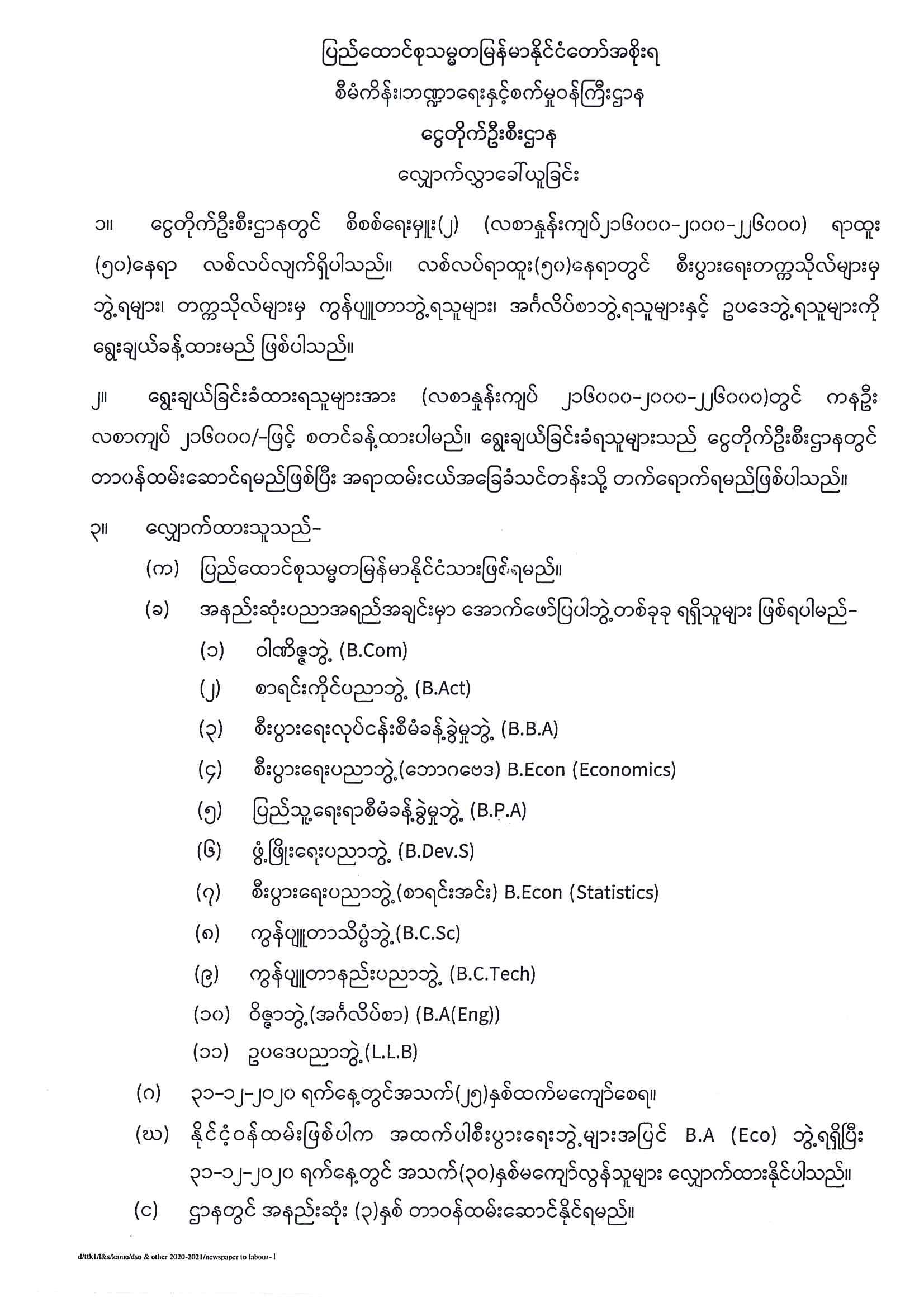 ငွေတိုက်ဦးစီးဌာနတွင် လစ်လပ်လျက်ရိသော စိစစ်ရေးမှူး (၂) (လစာနှုန်းကျပ် ၂၁၆၀၀၀ -၂၀၀၀-၂၂၆၀၀၀) ရာထူး (၅၀) နေရာအတွက် လျှောက်လွှာခေါ်ယူခြင်း td_editor Tue, 12/29/2020 - 11:52 Attachment Size Job opportunity.pdf 901.92 KB