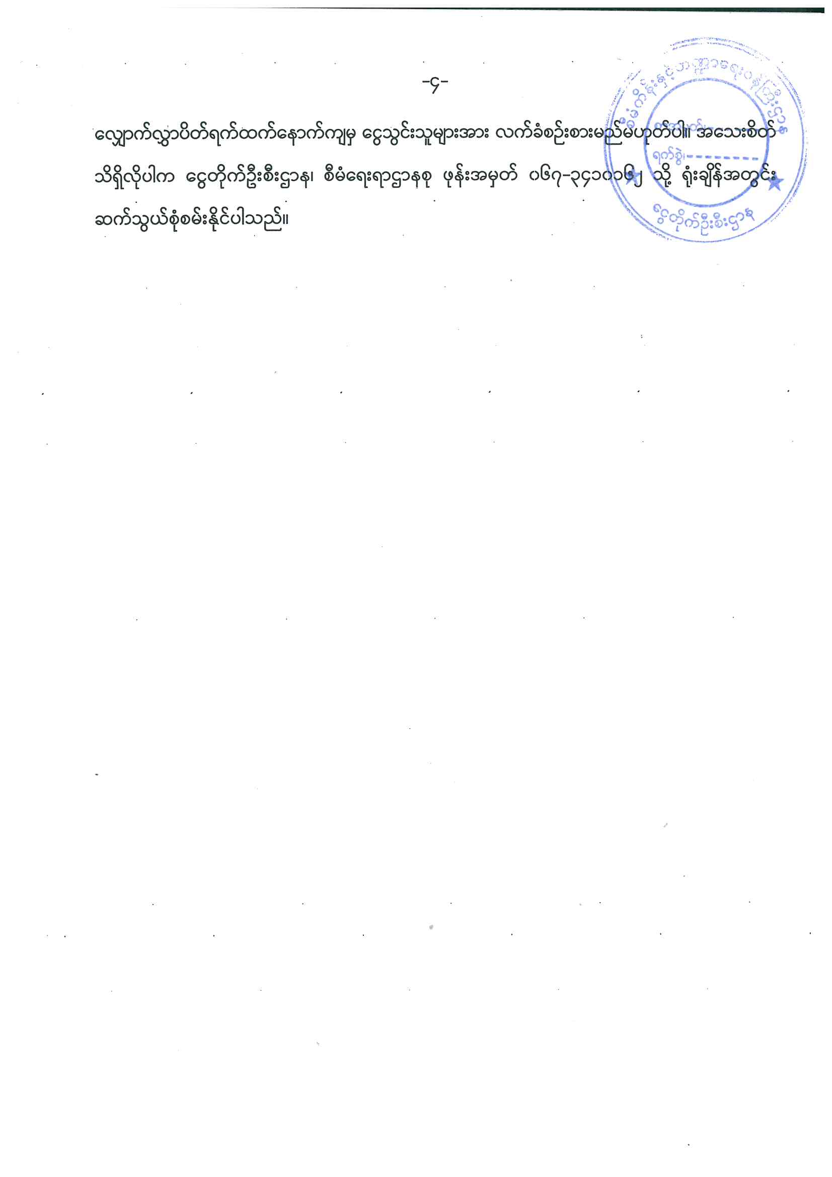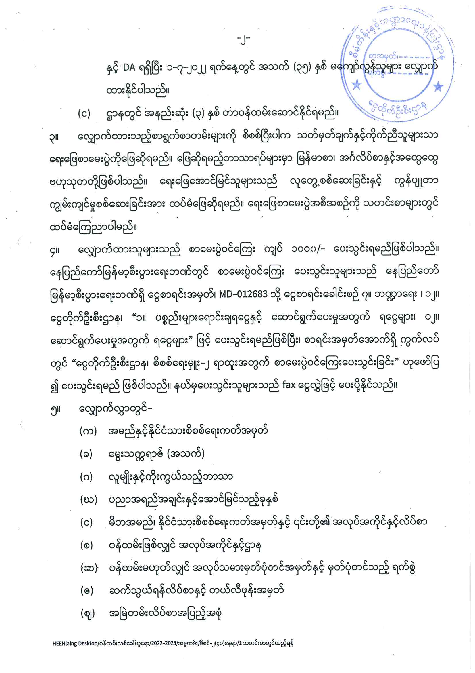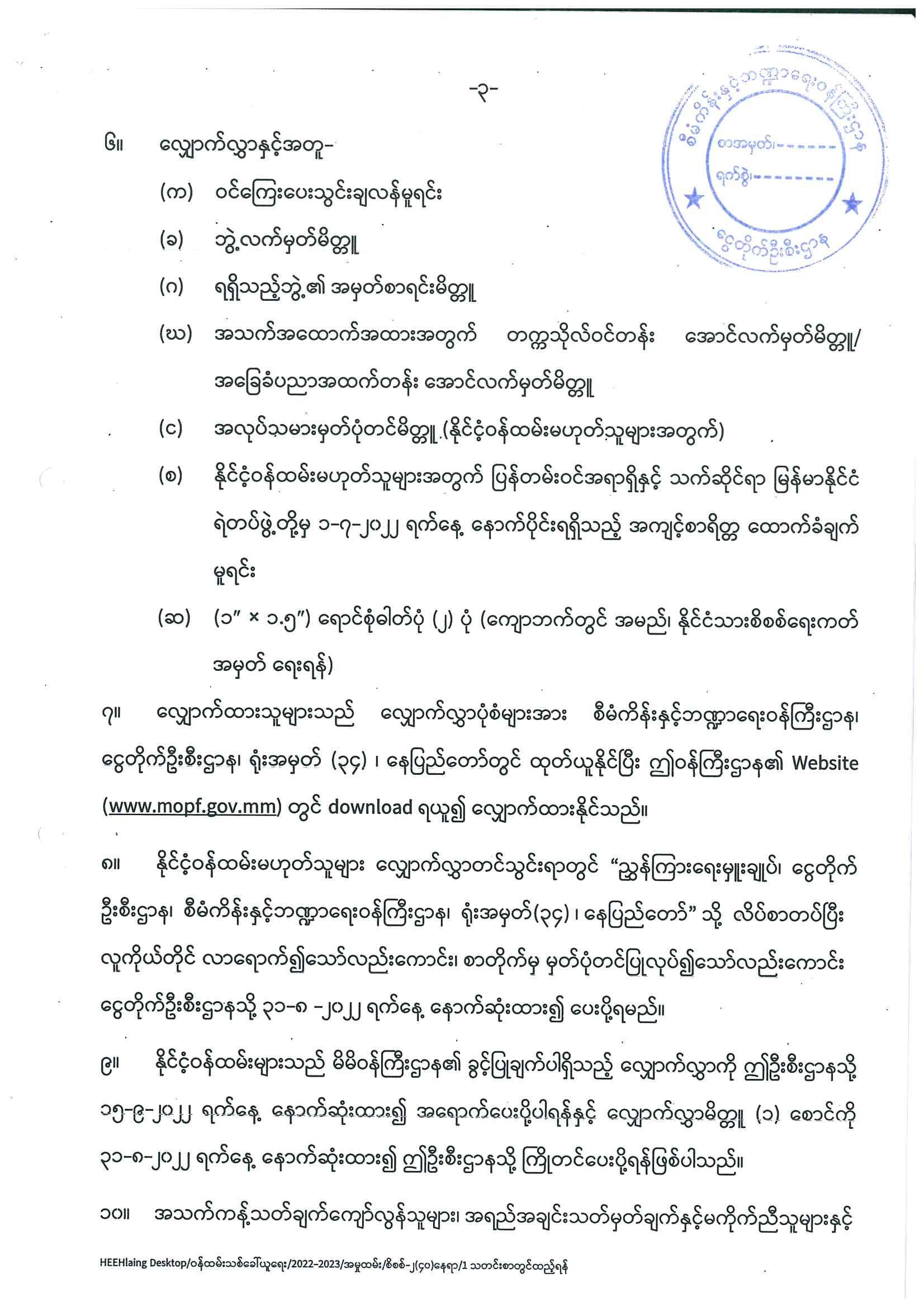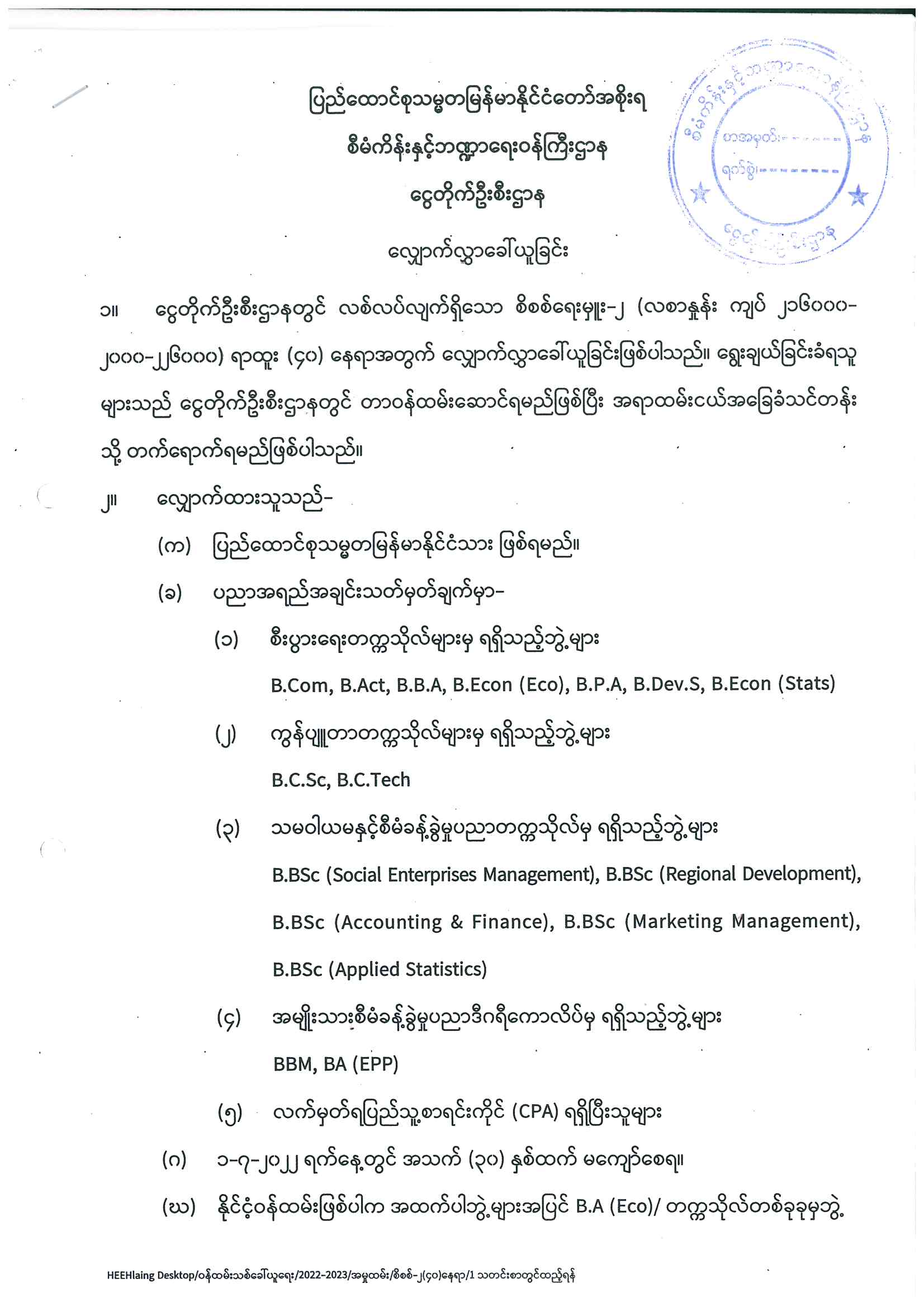 ငွေတိုက်ဦးစီးဌာနတွင် လစ်လပ်လျက်ရှိသော စိစစ်ရေးမှူး-၂ (လစာနှုန်း ကျပ် ၂၁၆၀၀၀-၂၀၀၀-၂၂၆၀၀၀) ရာထူး (၄၀) နေရာအတွက် လျှောက်လွှာခေါ်ယူခြင်း td_editor Thu, 06/30/2022 - 16:55 Attachment Size 3 လျှောက်လွှာပုံစံ.pdf 131.29 KB