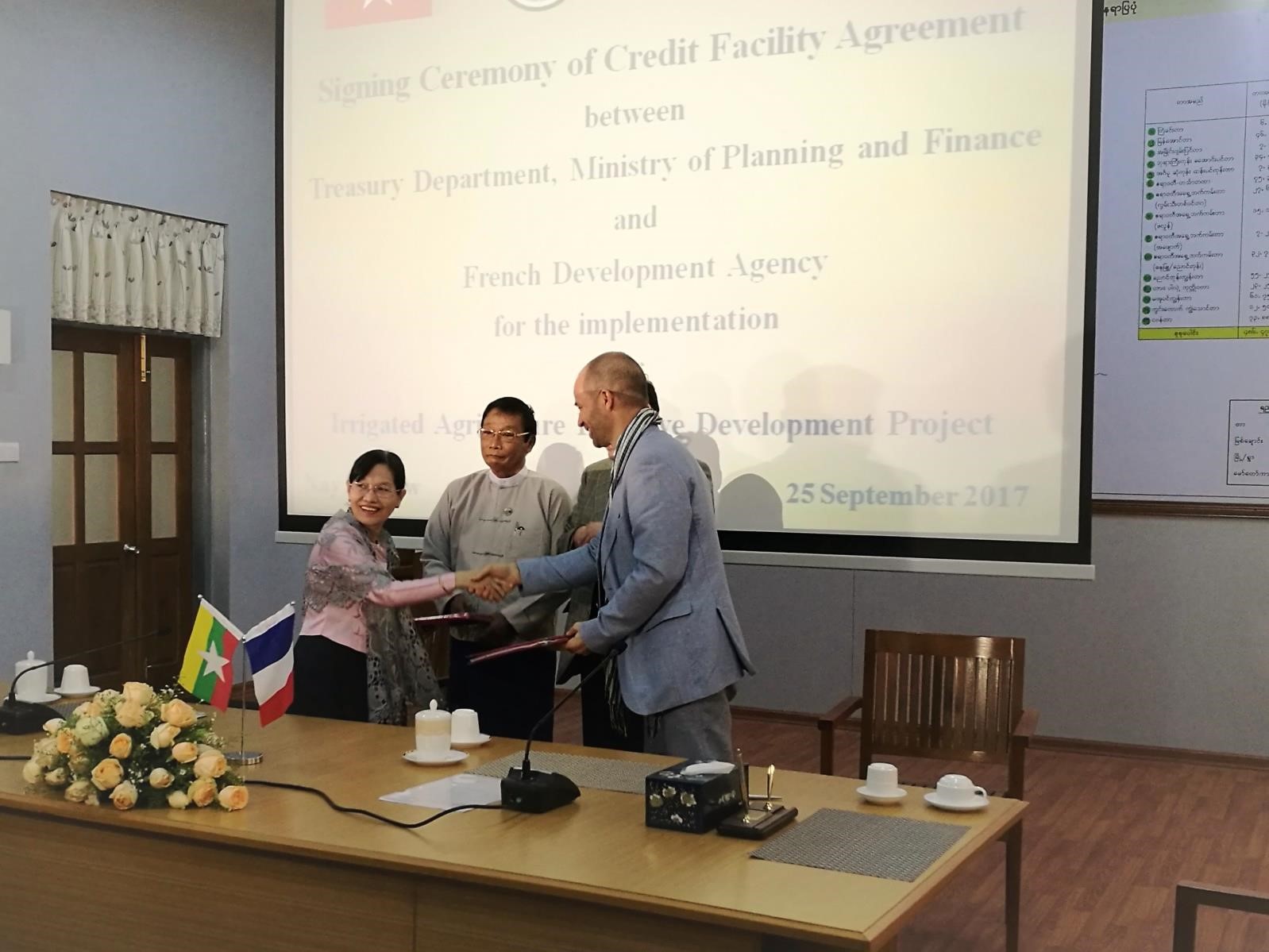 စိုက်ပျိုးရေး၊ မွေးမြူရေးနှင့် ဆည်မြောင်းဝန်ကြီးဌာနမှ အကောင်အထည်ဖော်ဆောင်ရွက်မည့် လယ်ယာကဏ္ဍဘက်စုံဖွံ့ဖြိုးတိုးတက်ရေးစီမံကိန်း (Irrigated Agriculture Inclusive Development Project ) အတွက် Agence Francaise Development (AFD) မှ ပေးအပ်သည့် ချေးငွေ ယူရို ၂၅ သန်း အားရယူရန်အတွက် လက်မှတ်ရေးထိုးပွဲအခမ်းအနားကို နေပြည်တော်ရှိ ရုံးအမှတ် (၁၅)၊ စိုက်ပျိုးရေး၊ မွေးမြူရေးနှင့် ဆည်မြောင်းဝန်ကြီးဌာန၌ ၂၀၁၇ ခုနှစ်၊ စက်တင်ဘာလ (၂၅) ရက်နေ့၊ နံနက် (၁၀:၀၀) အချိန်တွင် ကျင်းပပြုလုပ်ခဲ့ပါသည်။