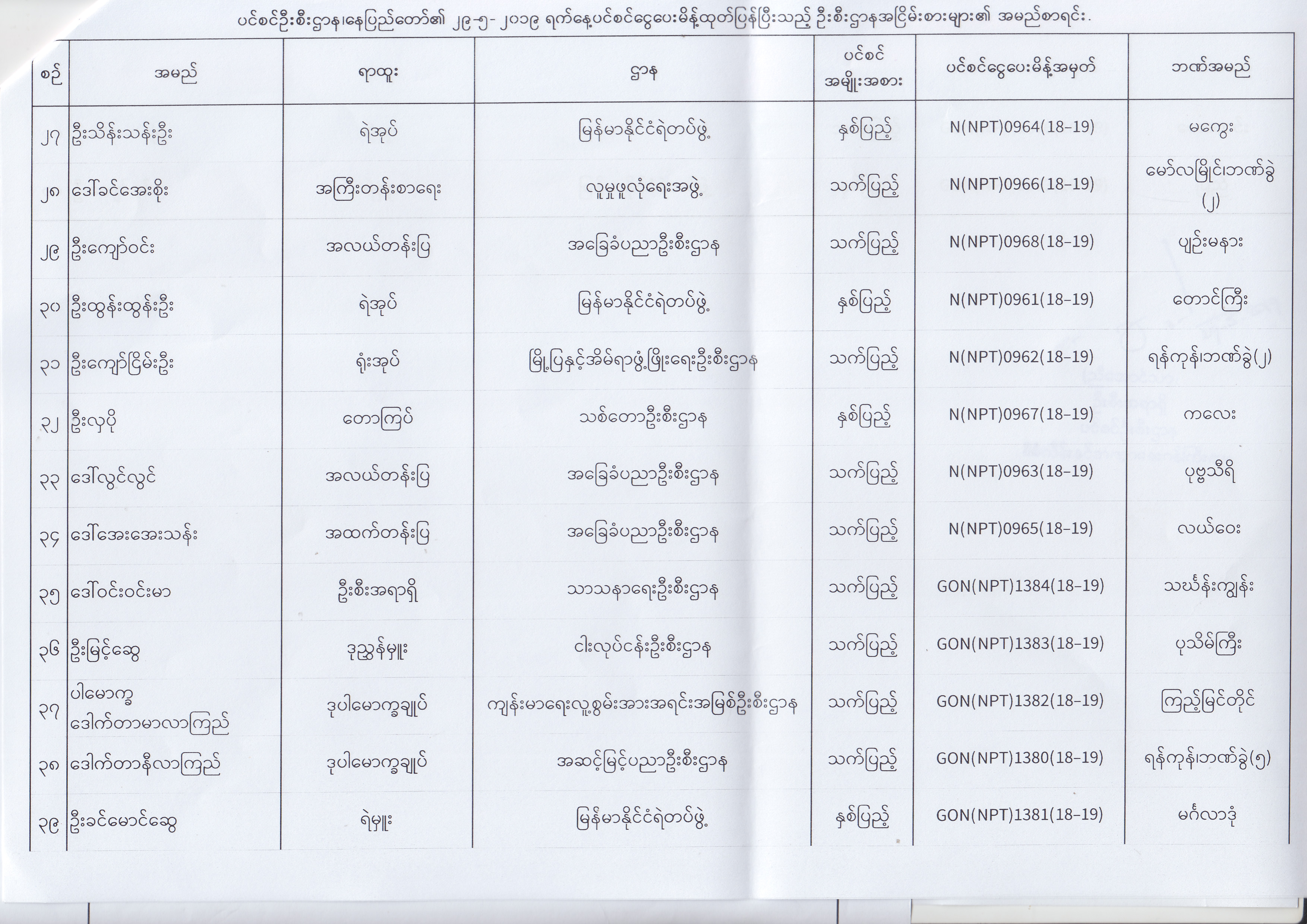 ပင်စင်ဦးစီးဌာ၊ နေပြည်တော်၏ ၂၁.၅.၂၀၁၉ မှ ၃၁.၅.၂၀၁၉ ရက်နေ့အထိ ပင်စင်ငွေပေးမိန့်ထုတ်ပြန်ပြီးသည့် ဦးစီးဌာနအငြိမ်းစားများ၏ အမည်စာရင်း pdfinance_editor Tue, 06/04/2019 - 11:13