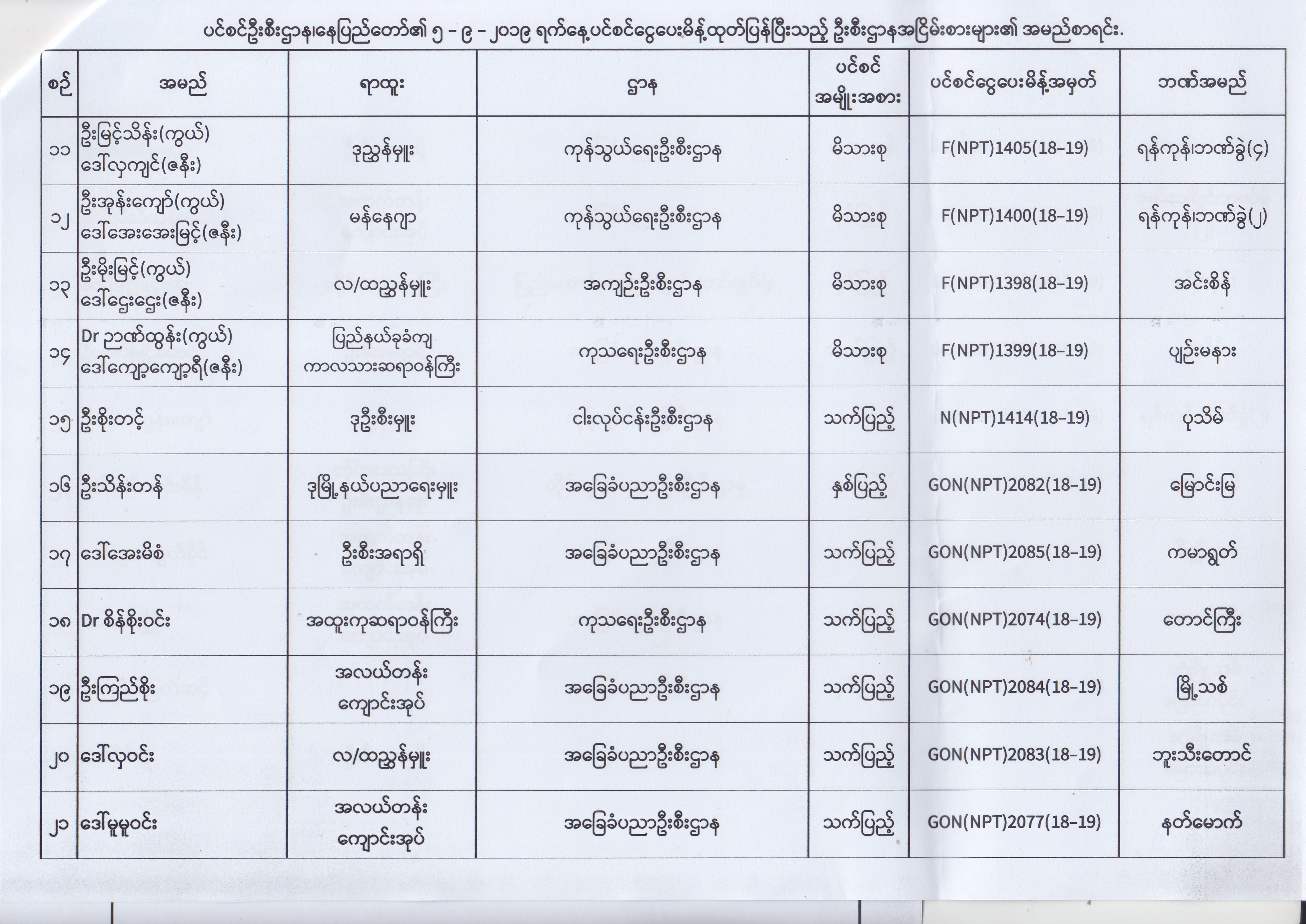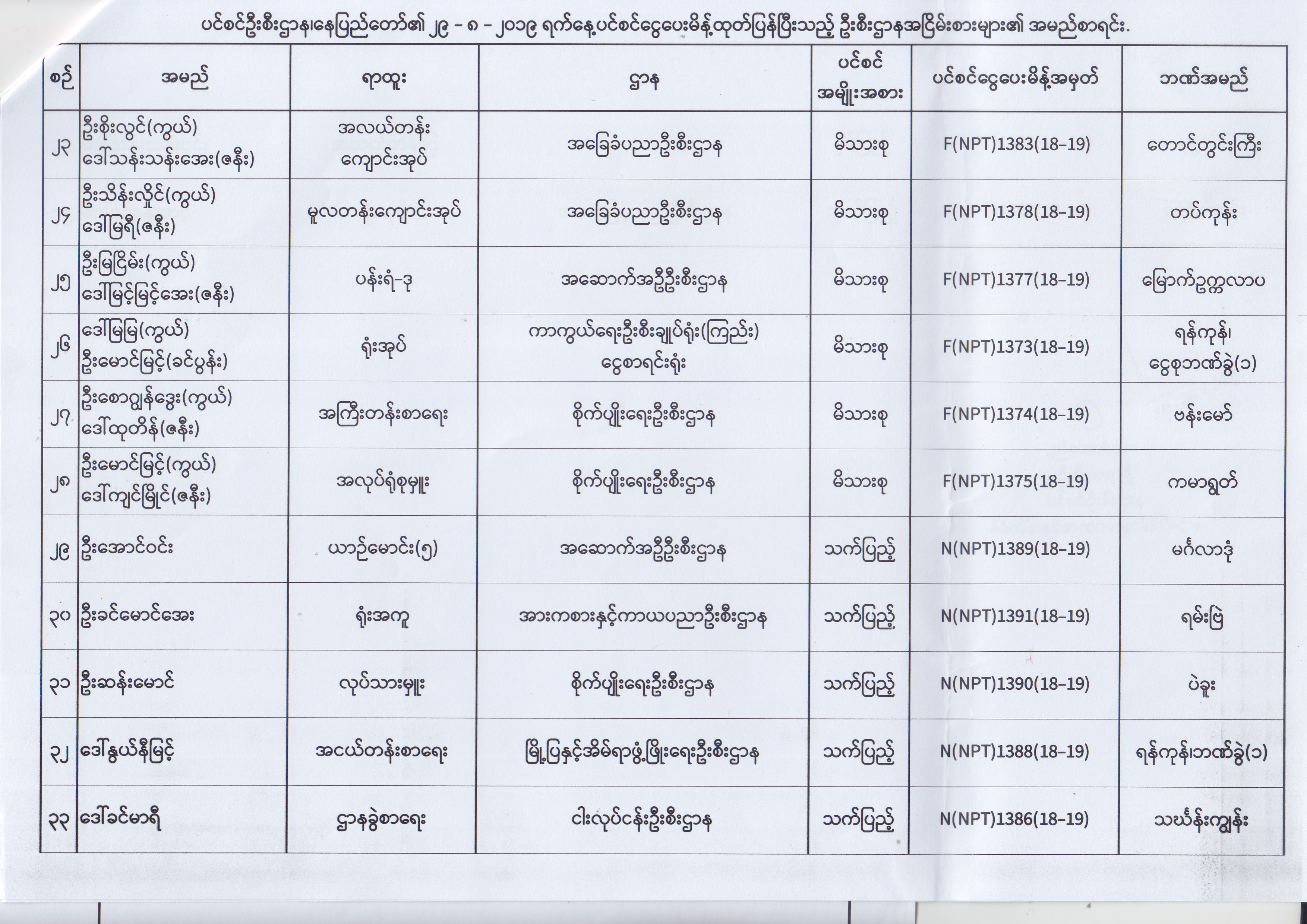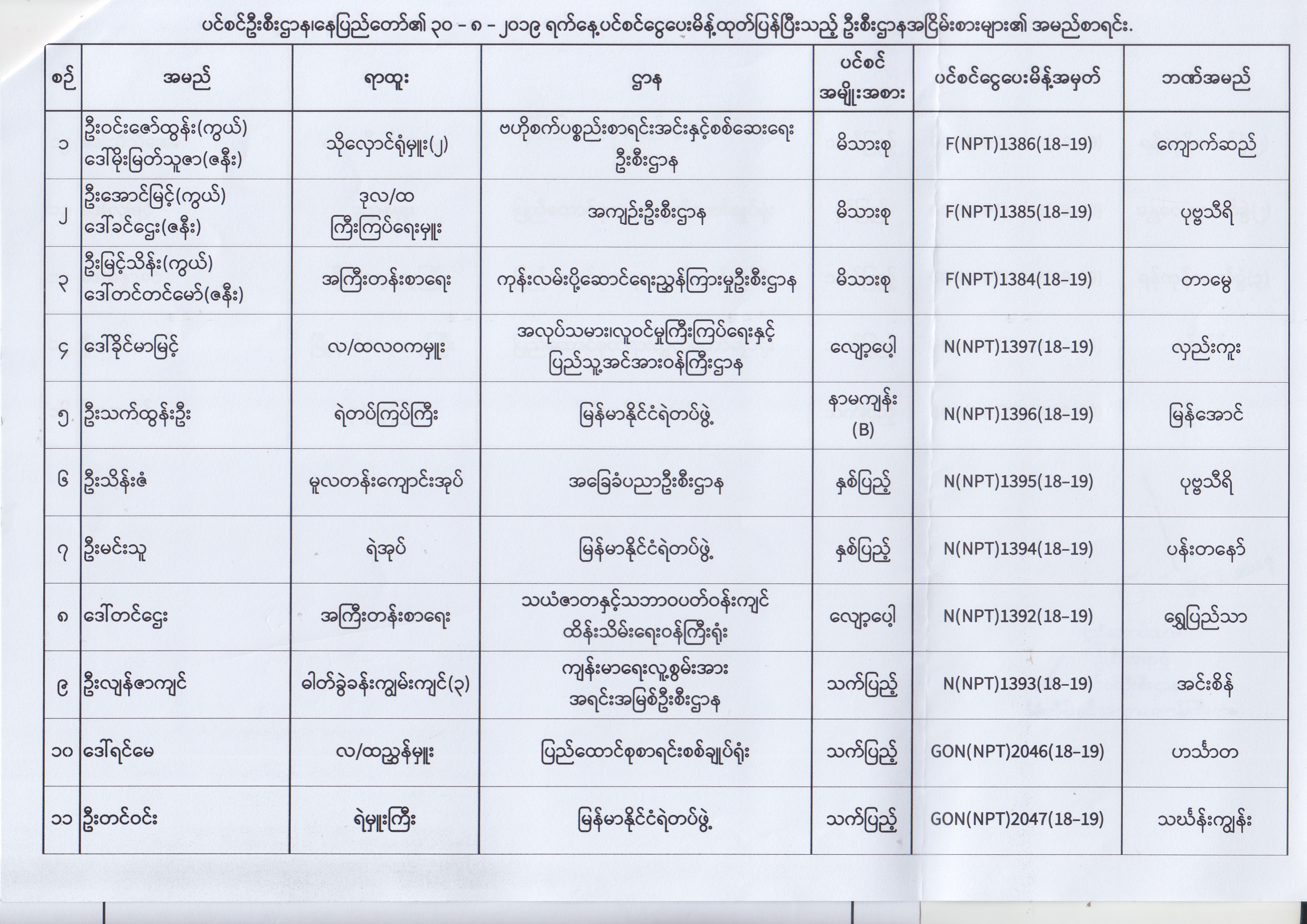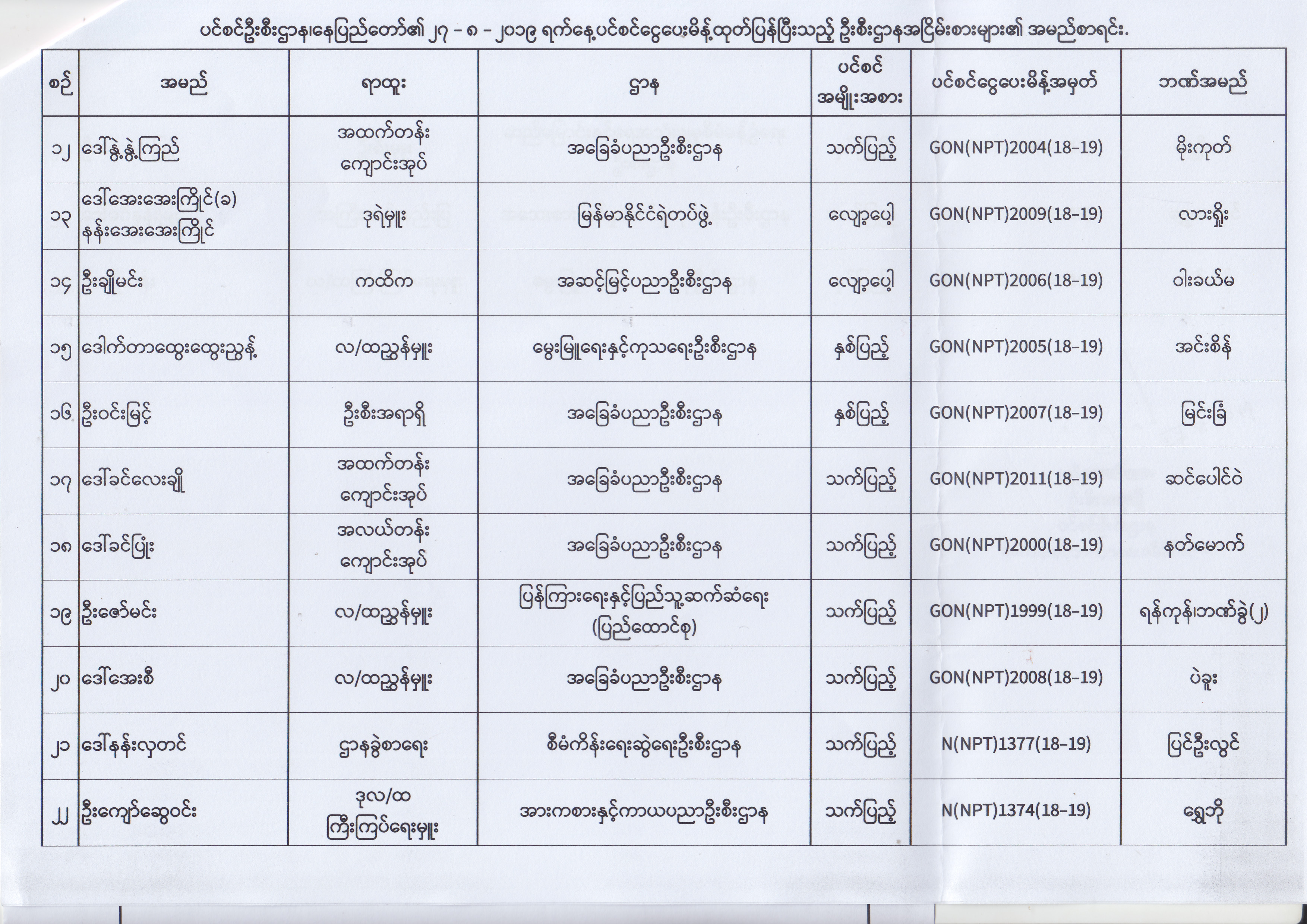 ပင်စင်ဦးစီးဌာန၊ နေပြည်တော်၏ (၂၃.၈.၂၀၁၉) မှ (၅.၉.၂၀၁၉) ရက်နေ့အထိ ပင်စင်ငွေပေးမိန့်ထုတ်ပြန်ပြီးသည့် ဦးစီးဌာနအငြိမ်းစားများ၏ အမည်စာရင်း pdfinance_editor Fri, 09/06/2019 - 14:48