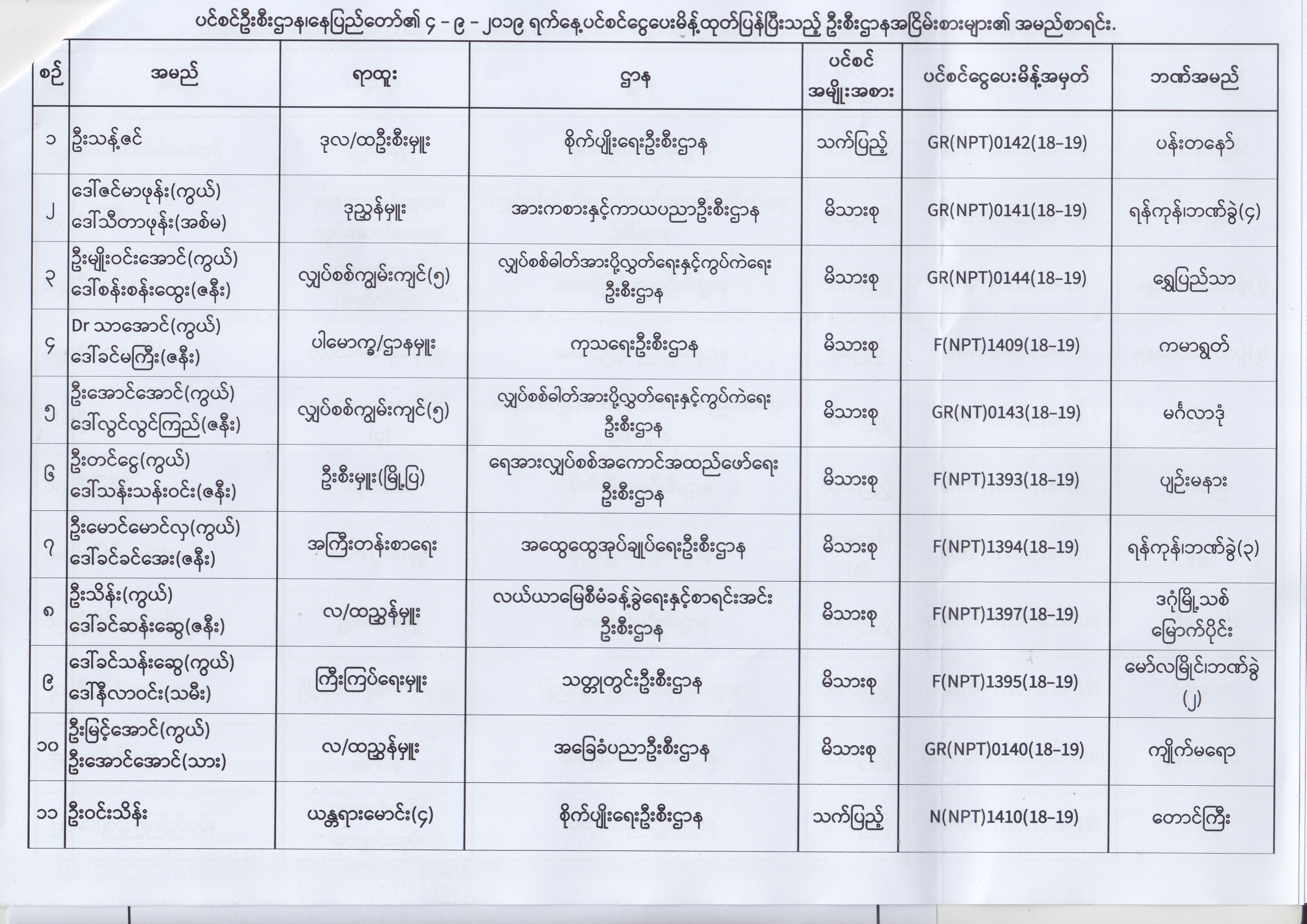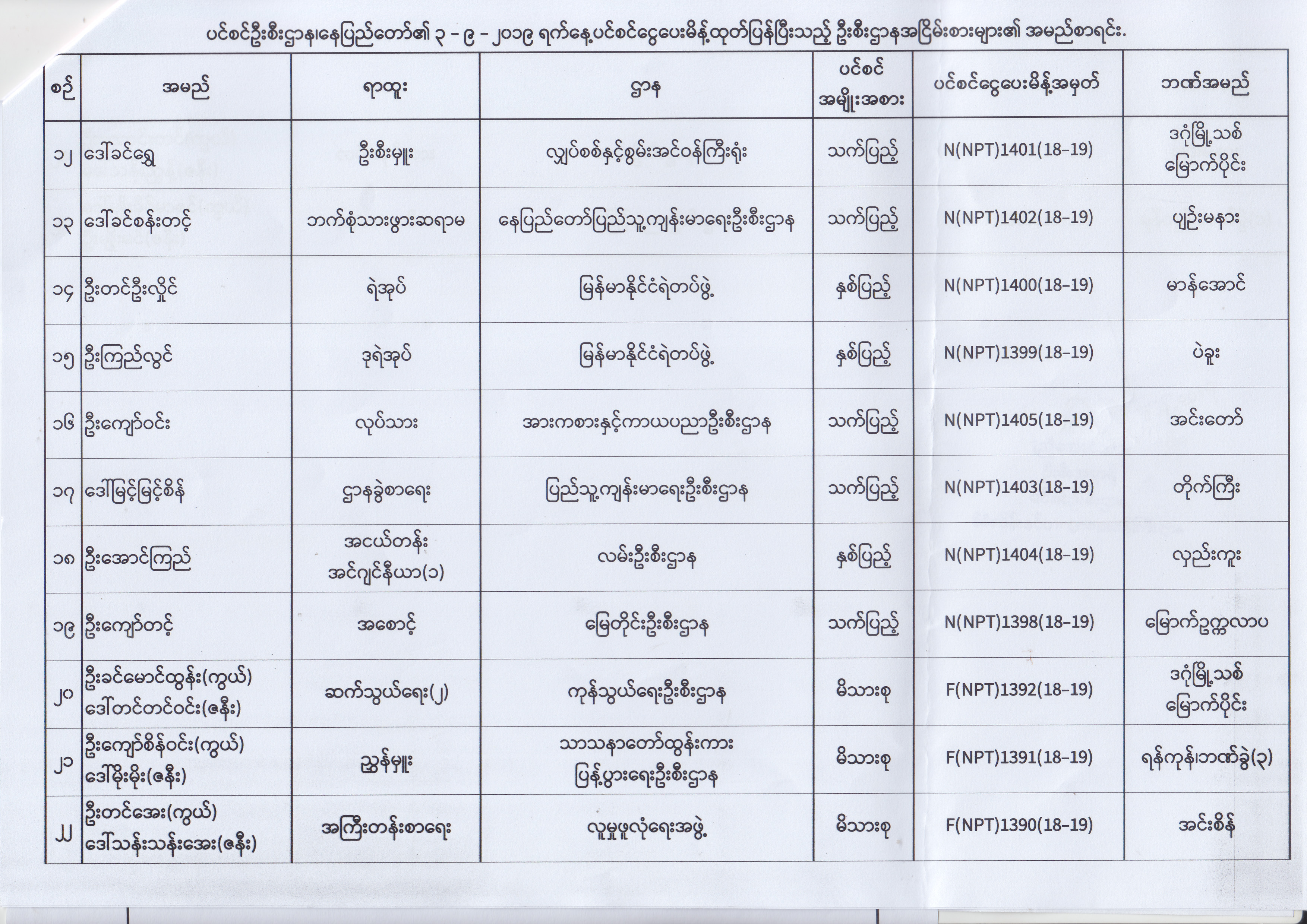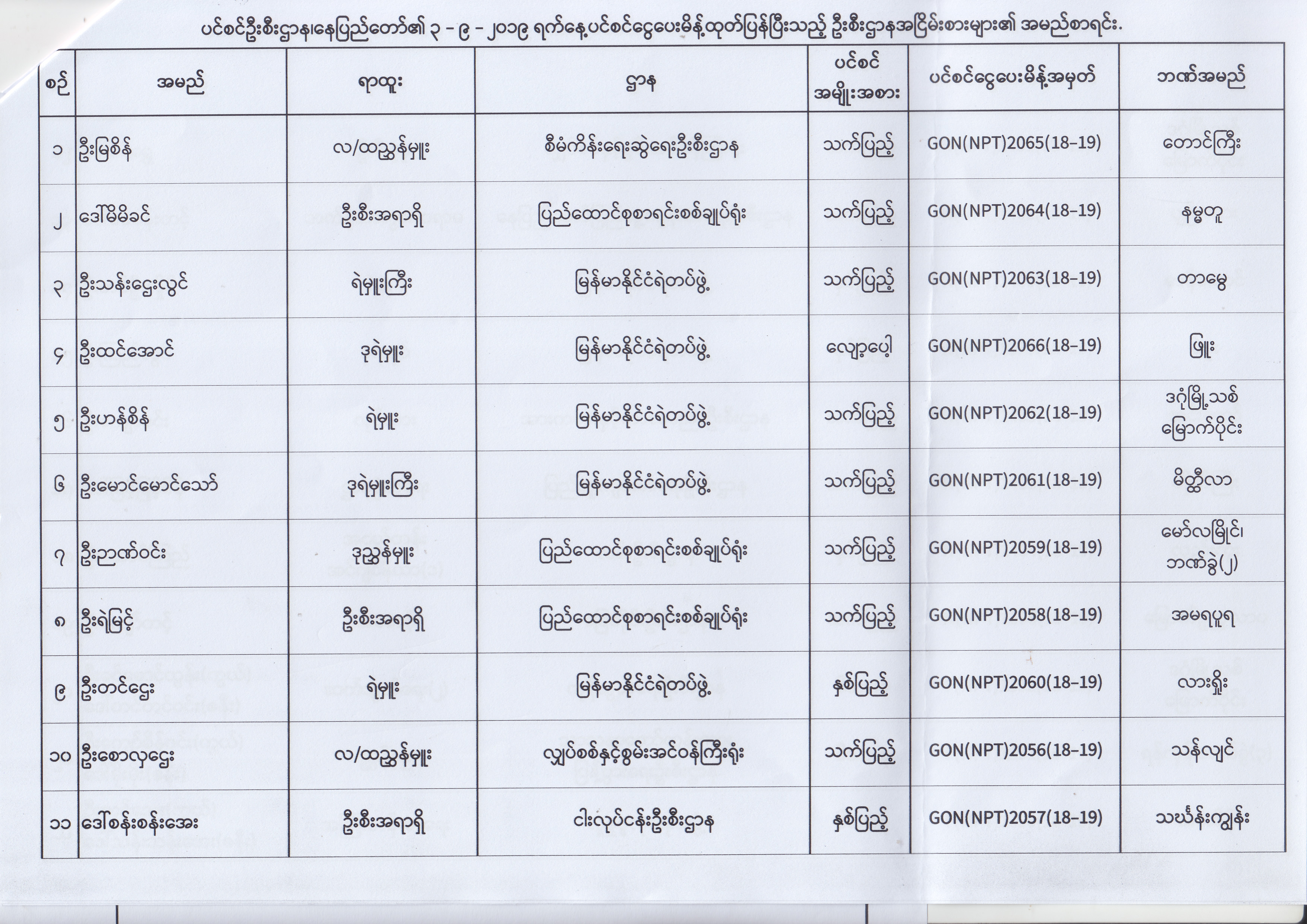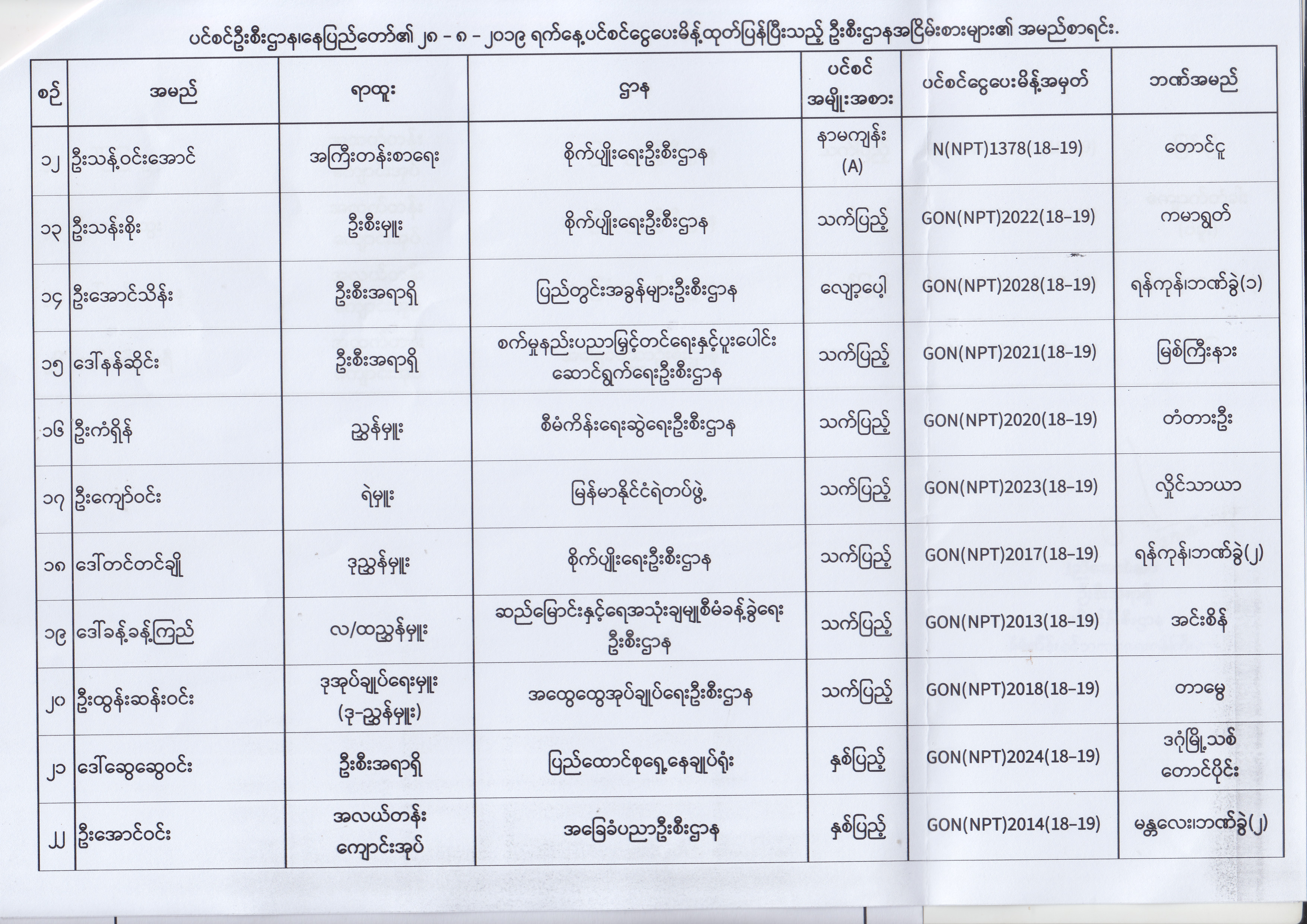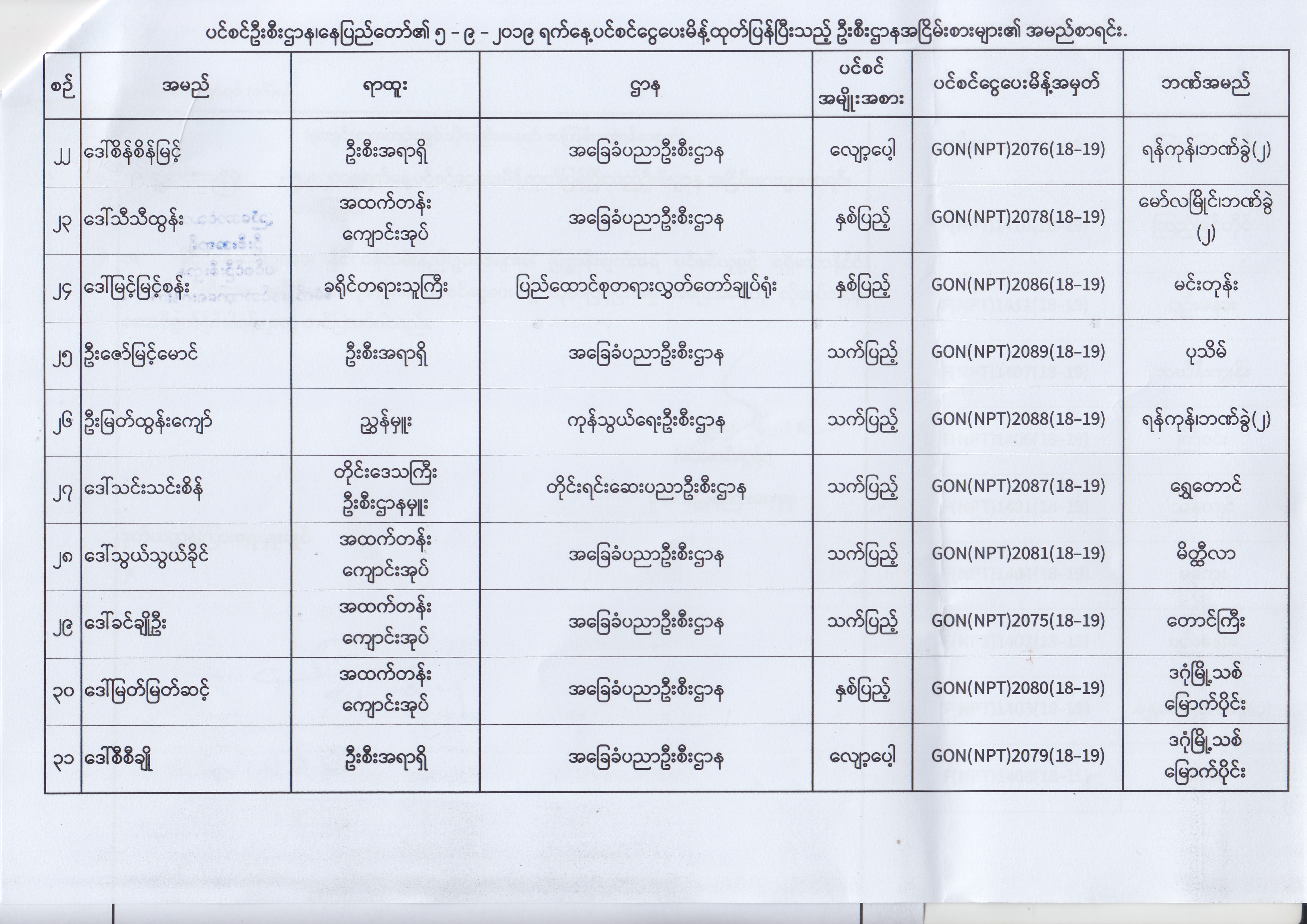 ပင်စင်ဦးစီးဌာန၊ နေပြည်တော်၏ (၂၃.၈.၂၀၁၉) မှ (၅.၉.၂၀၁၉) ရက်နေ့အထိ ပင်စင်ငွေပေးမိန့်ထုတ်ပြန်ပြီးသည့် ဦးစီးဌာနအငြိမ်းစားများ၏ အမည်စာရင်း pdfinance_editor Fri, 09/06/2019 - 14:48