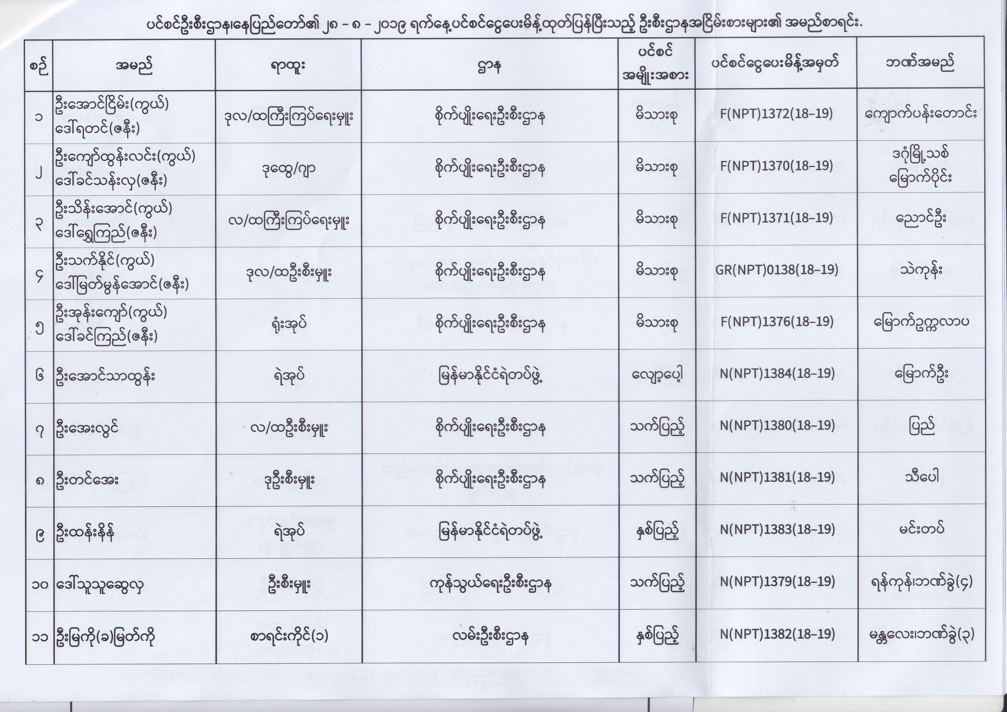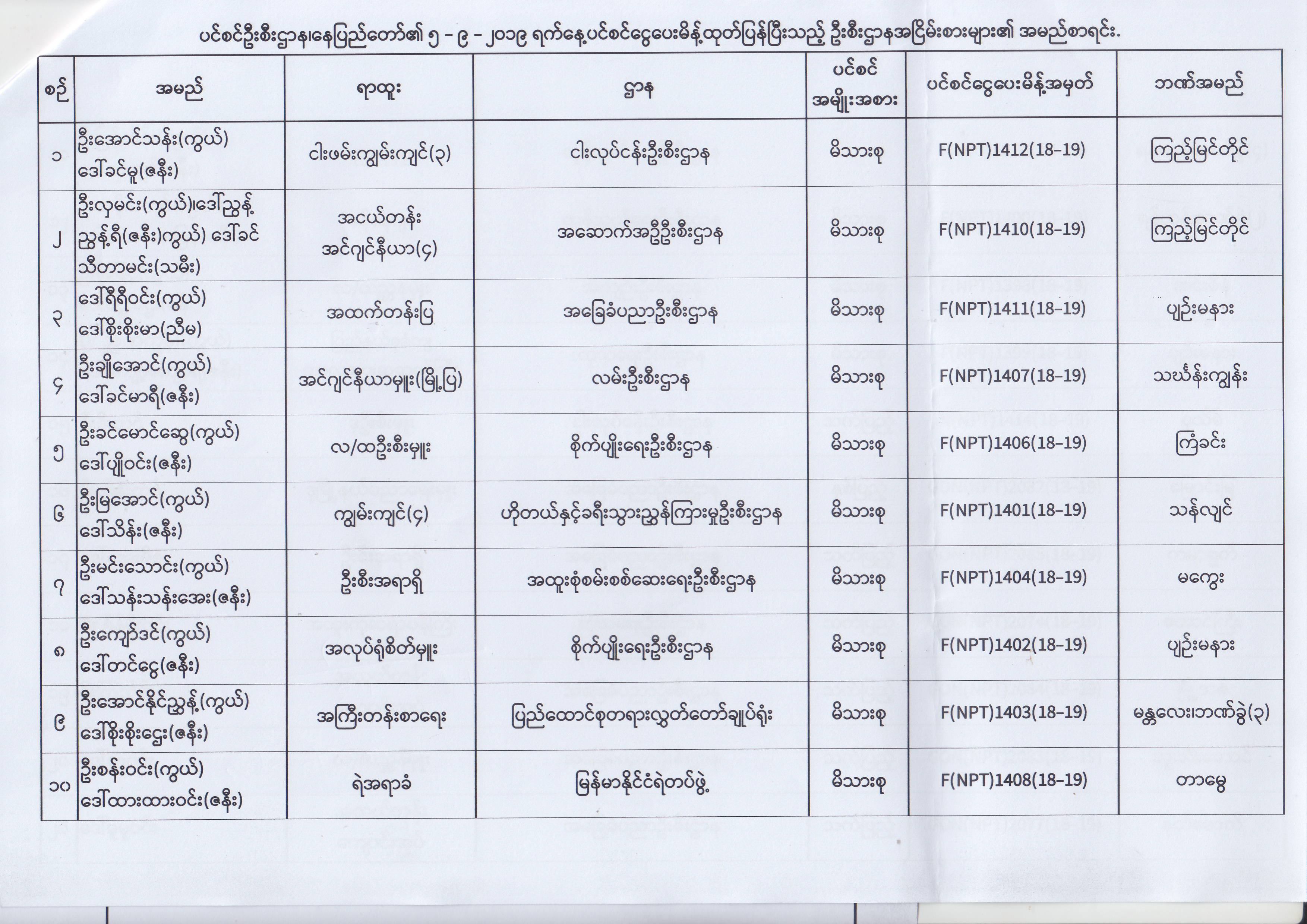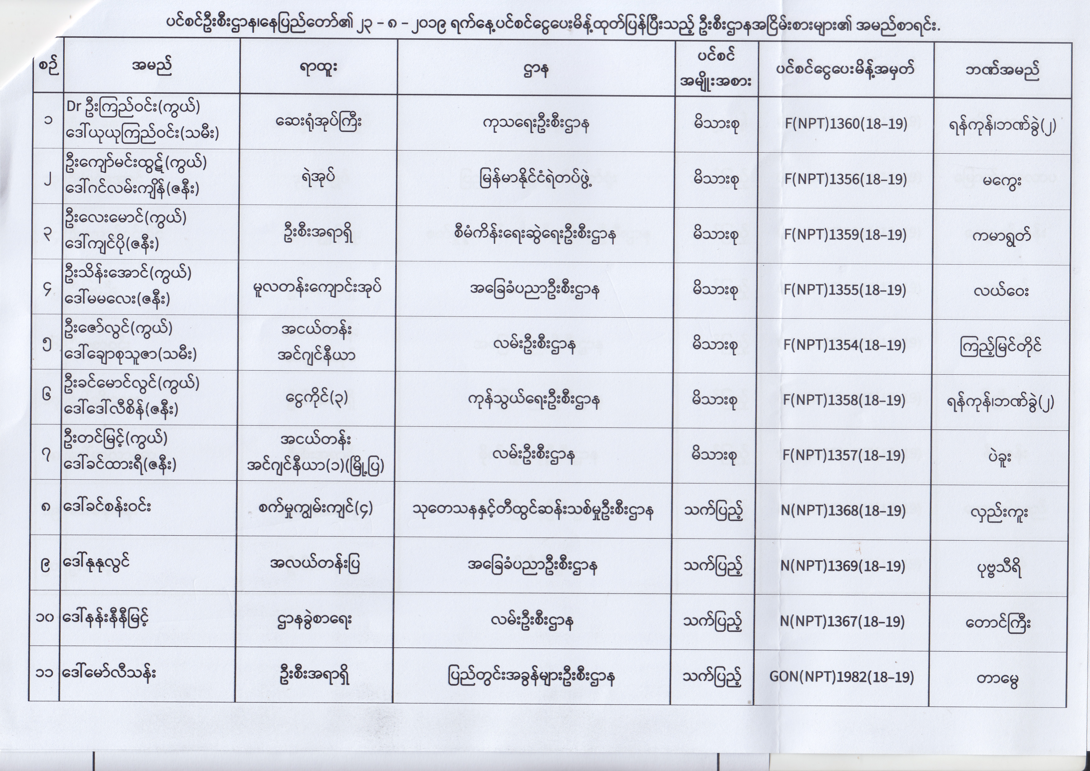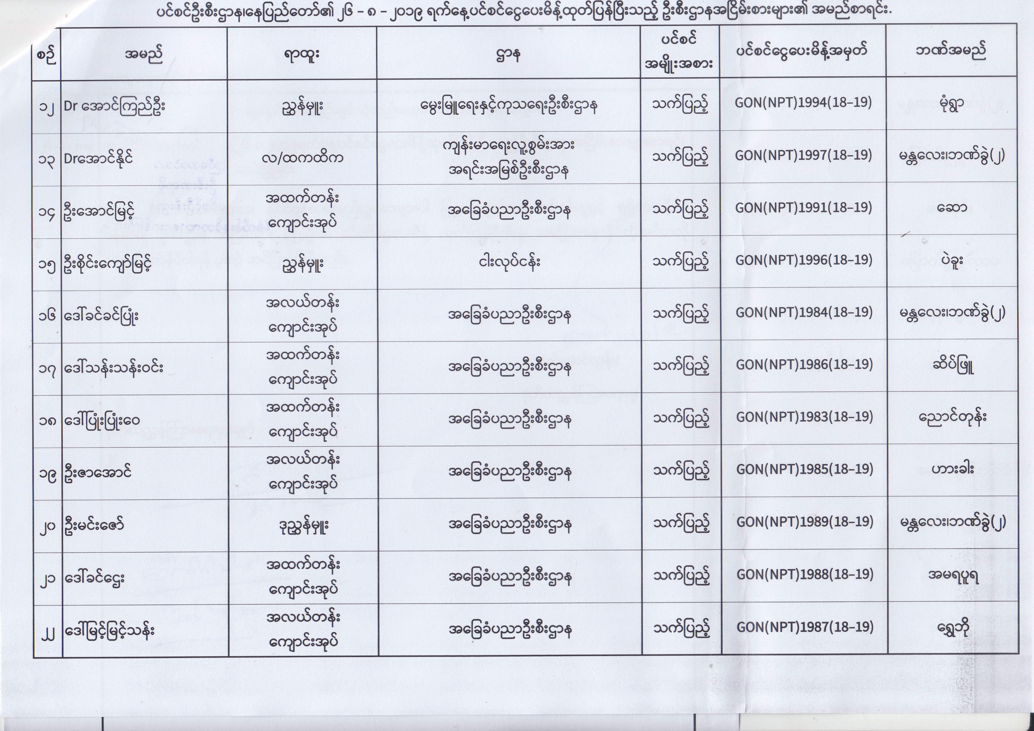 ပင်စင်ဦးစီးဌာန၊ နေပြည်တော်၏ (၂၃.၈.၂၀၁၉) မှ (၅.၉.၂၀၁၉) ရက်နေ့အထိ ပင်စင်ငွေပေးမိန့်ထုတ်ပြန်ပြီးသည့် ဦးစီးဌာနအငြိမ်းစားများ၏ အမည်စာရင်း pdfinance_editor Fri, 09/06/2019 - 14:48