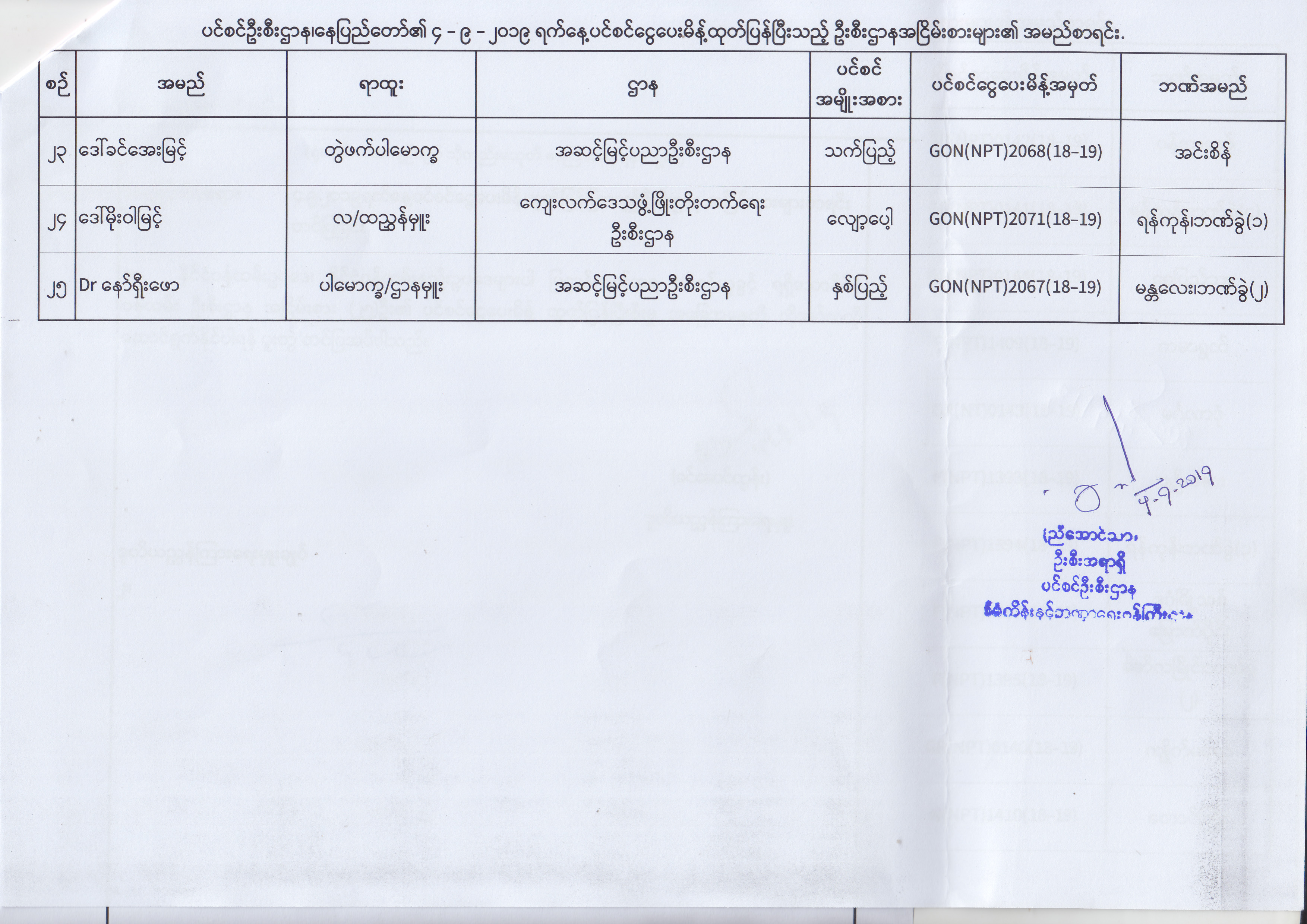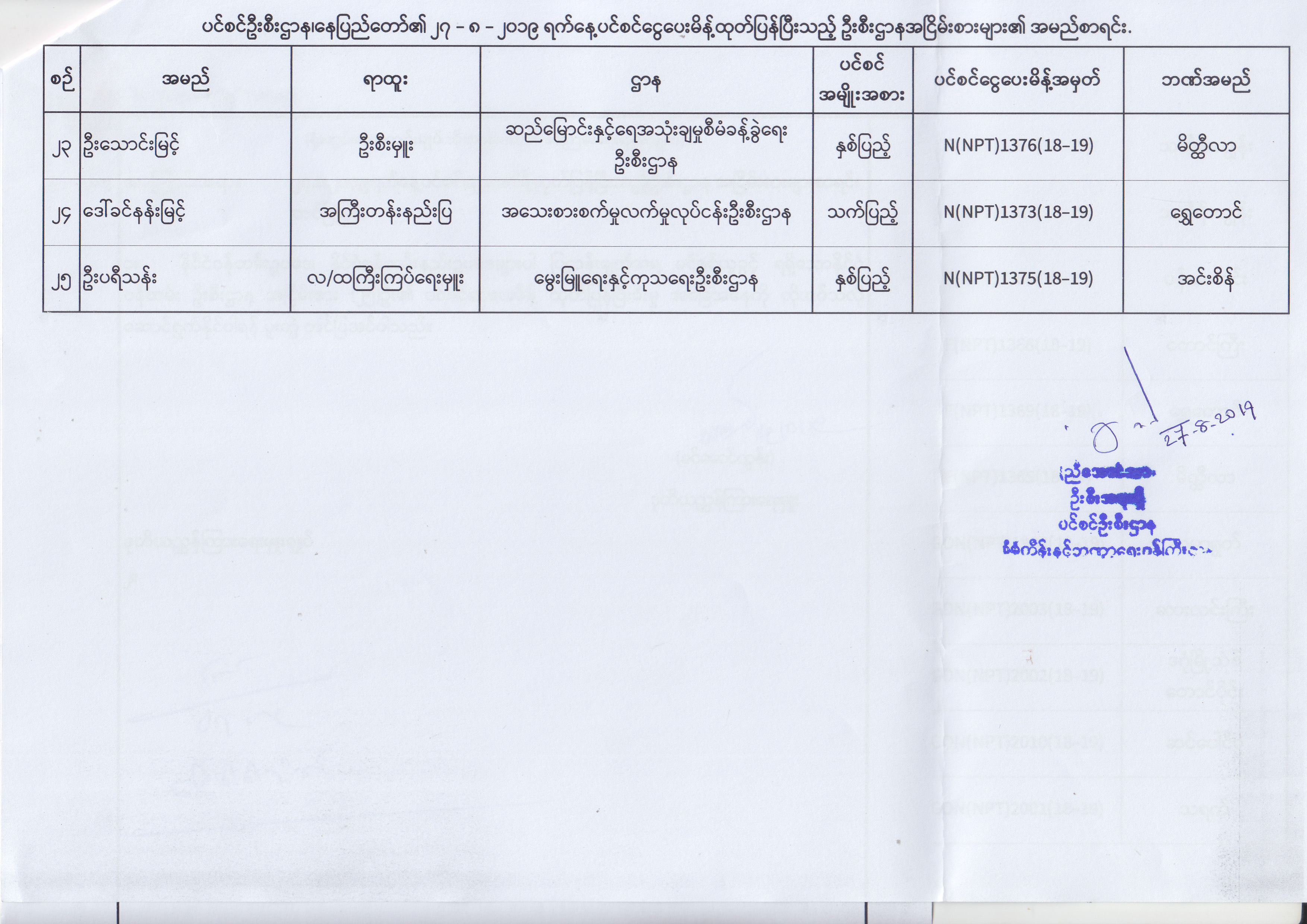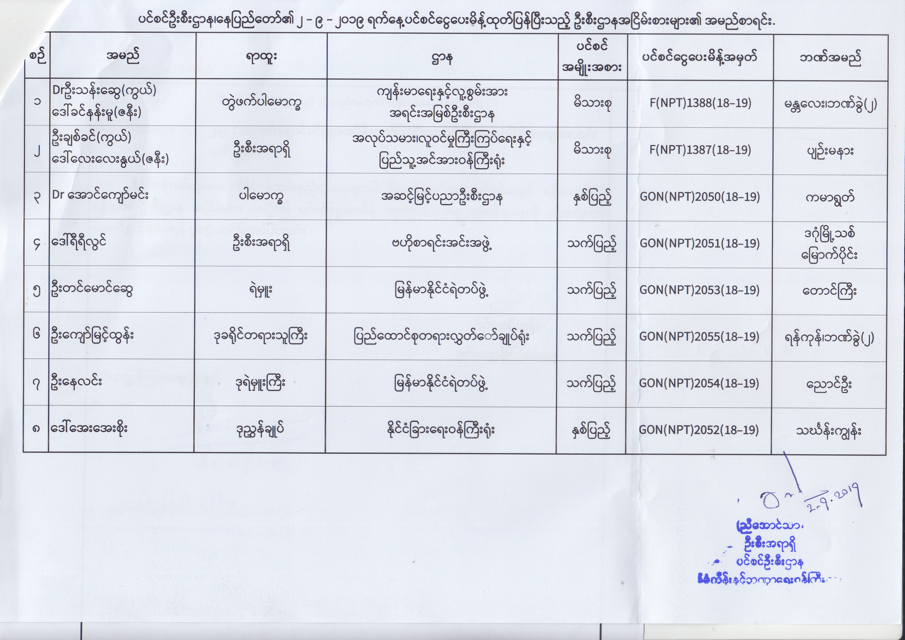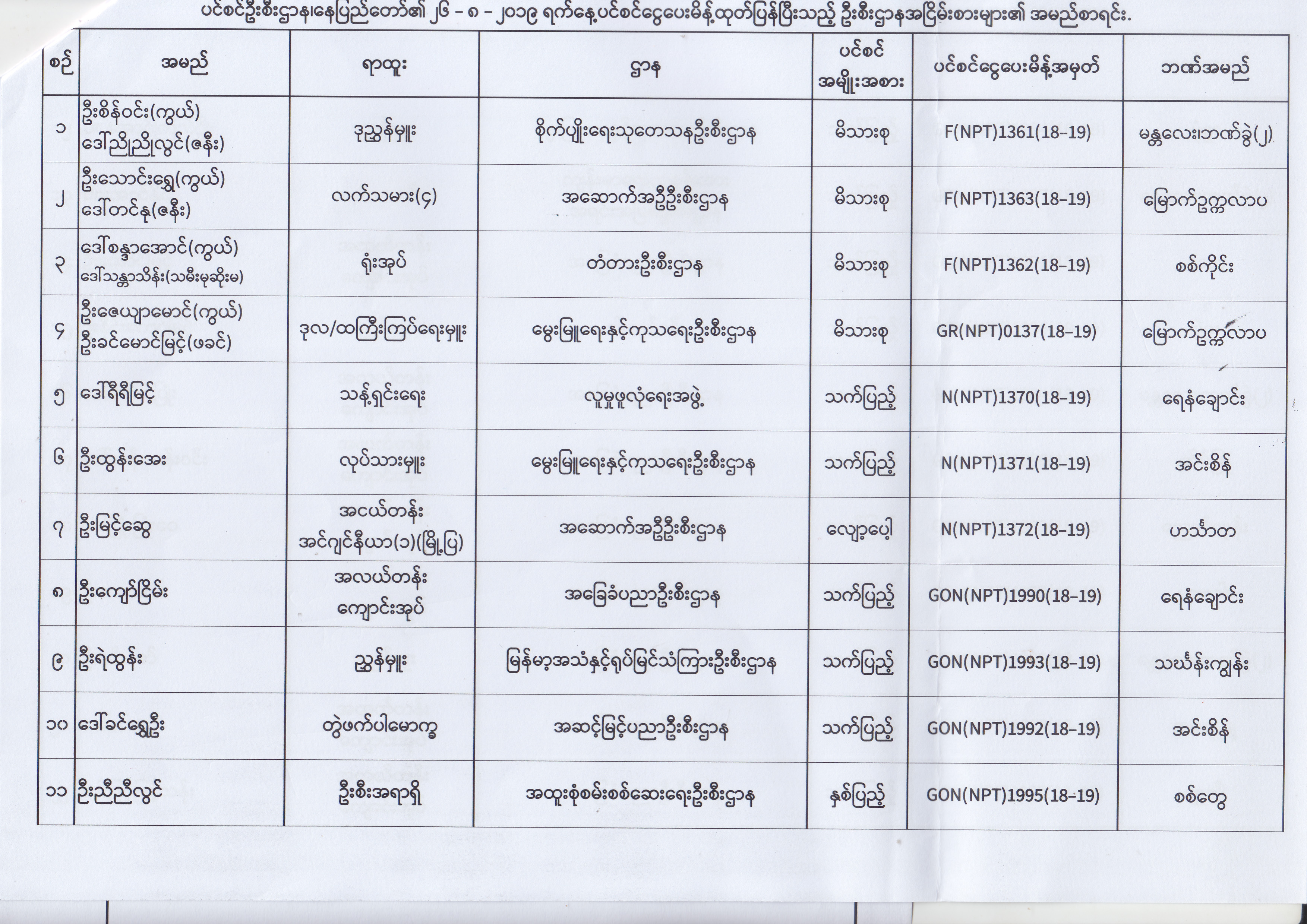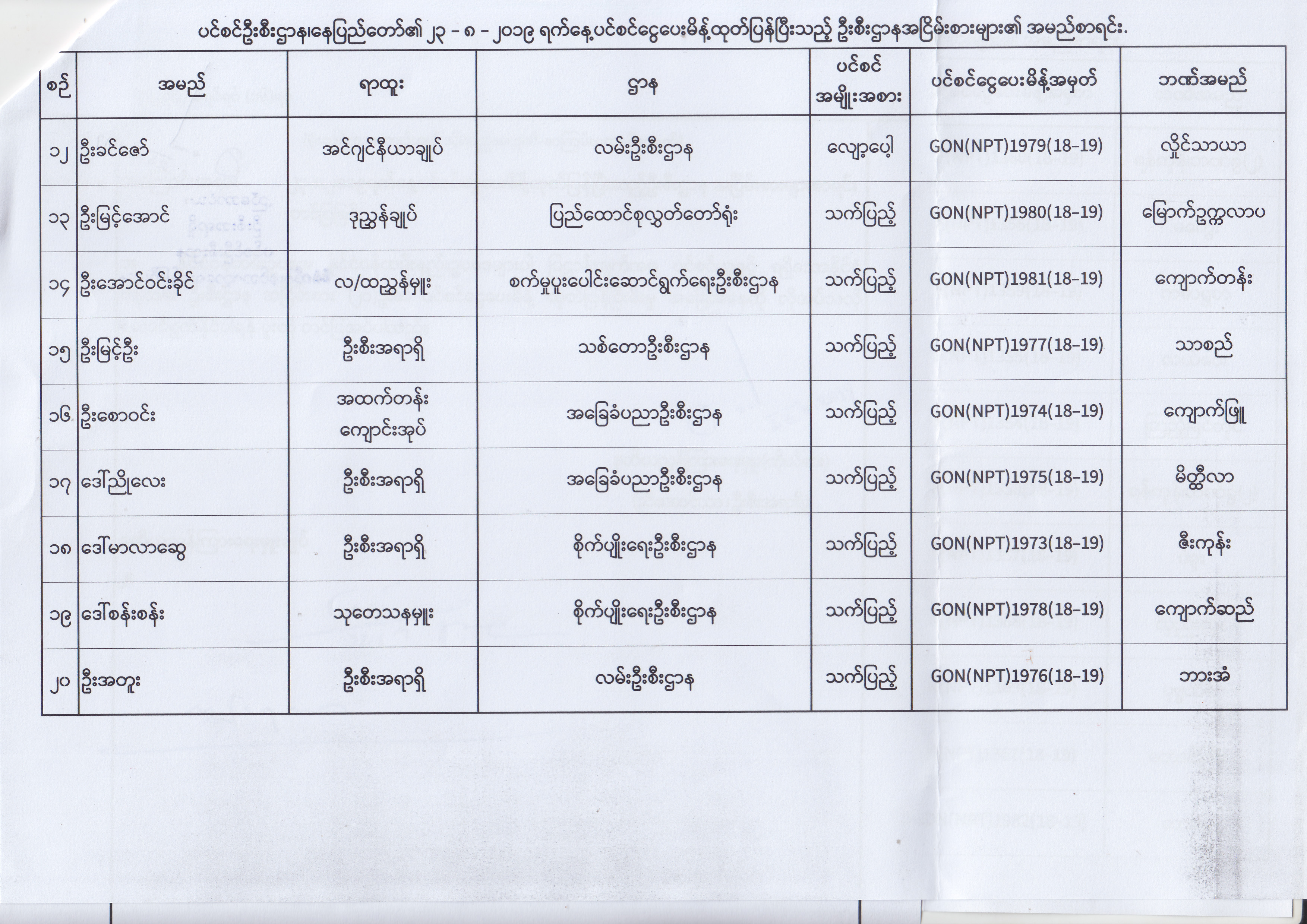 ပင်စင်ဦးစီးဌာန၊ နေပြည်တော်၏ (၂၃.၈.၂၀၁၉) မှ (၅.၉.၂၀၁၉) ရက်နေ့အထိ ပင်စင်ငွေပေးမိန့်ထုတ်ပြန်ပြီးသည့် ဦးစီးဌာနအငြိမ်းစားများ၏ အမည်စာရင်း pdfinance_editor Fri, 09/06/2019 - 14:48