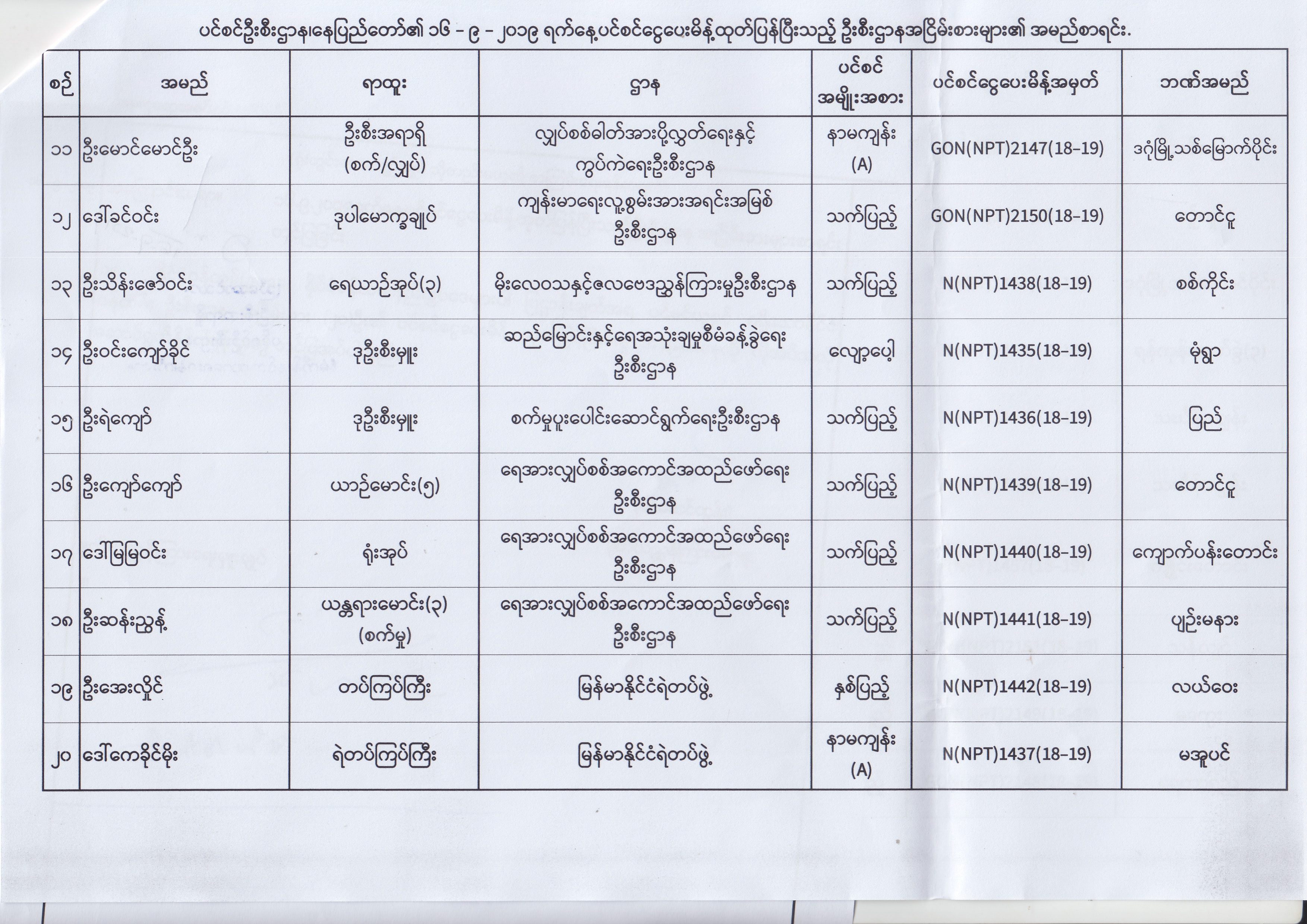 ပင်စင်ဦးစီးဌာန၊ နေပြည်တော်၏ (၁၆.၉.၂၀၁၉) မှ (၂၀.၉.၂၀၁၉) ရက်နေ့အထိ ပင်စင်ငွေပေးမိန့်ထုတ်ပြန်ပြီးသည့် ဦးစီးဌာနအငြိမ်းစားများ၏ အမည်စာရင်း pdfinance_editor Mon, 09/23/2019 - 10:51