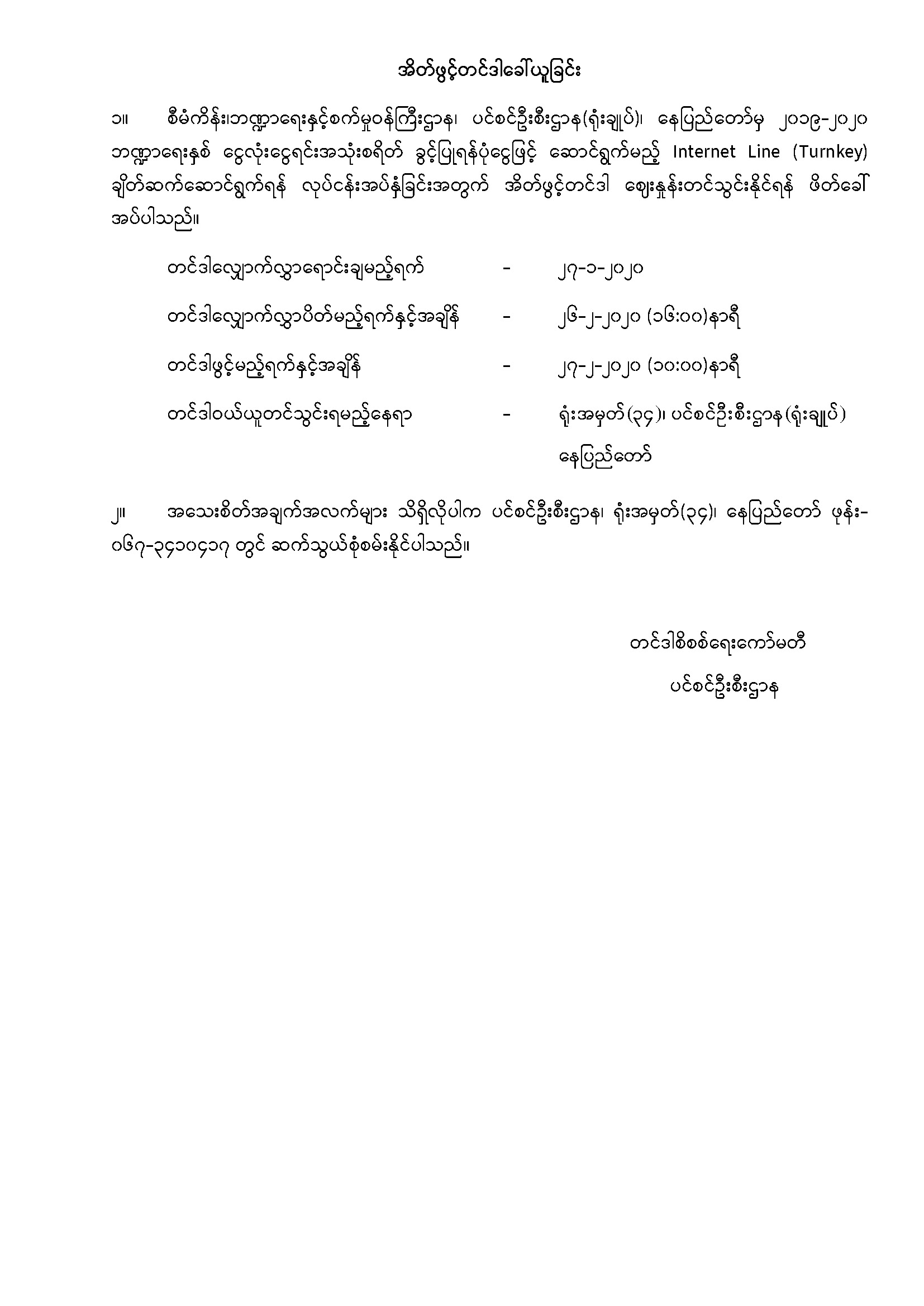 စီမံကိန်း၊ ဘဏ္ဍာရေးနှင့်စက်မှုဝန်ကြီးဌာန၊ ပင်စင်ဦးစီးဌာနမှ အိတ်ဖွင့်တင်ဒါခေါ်ယူခြင်း pdfinance_editor Fri, 01/24/2020 - 11:27
