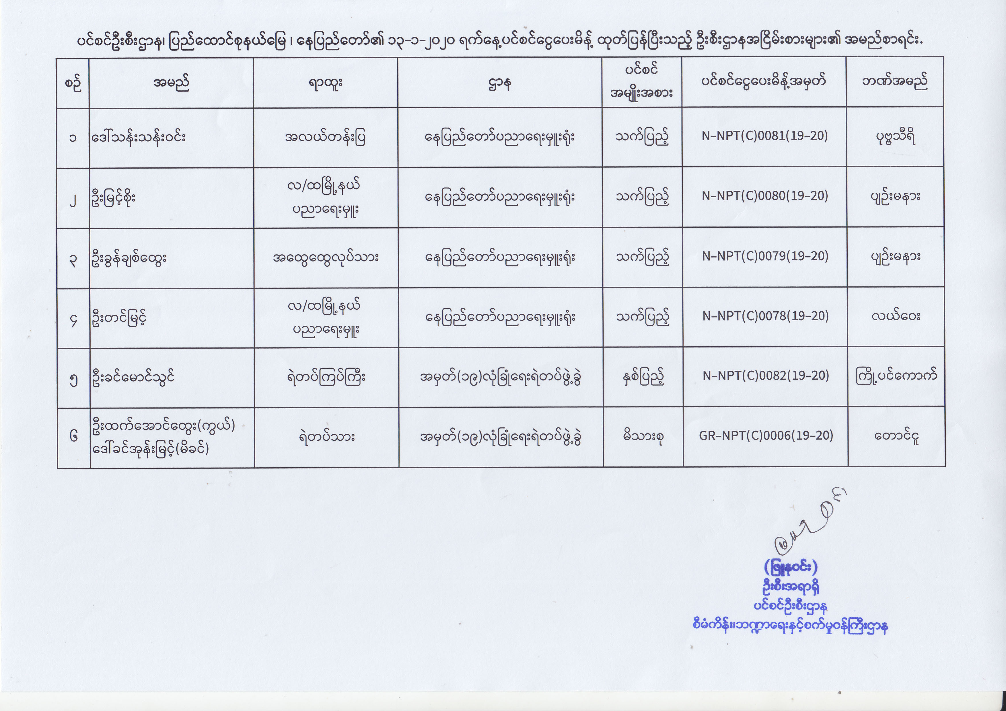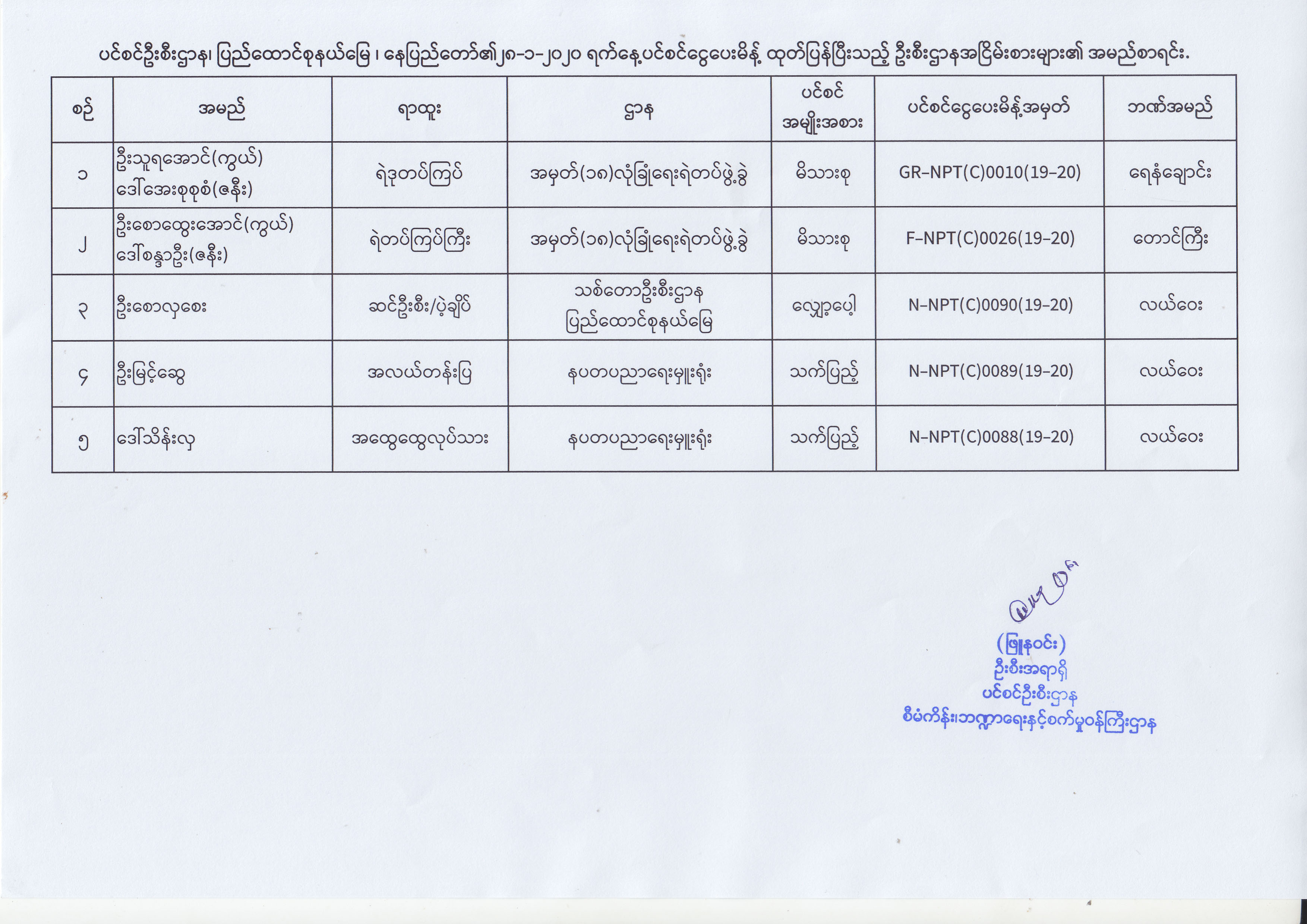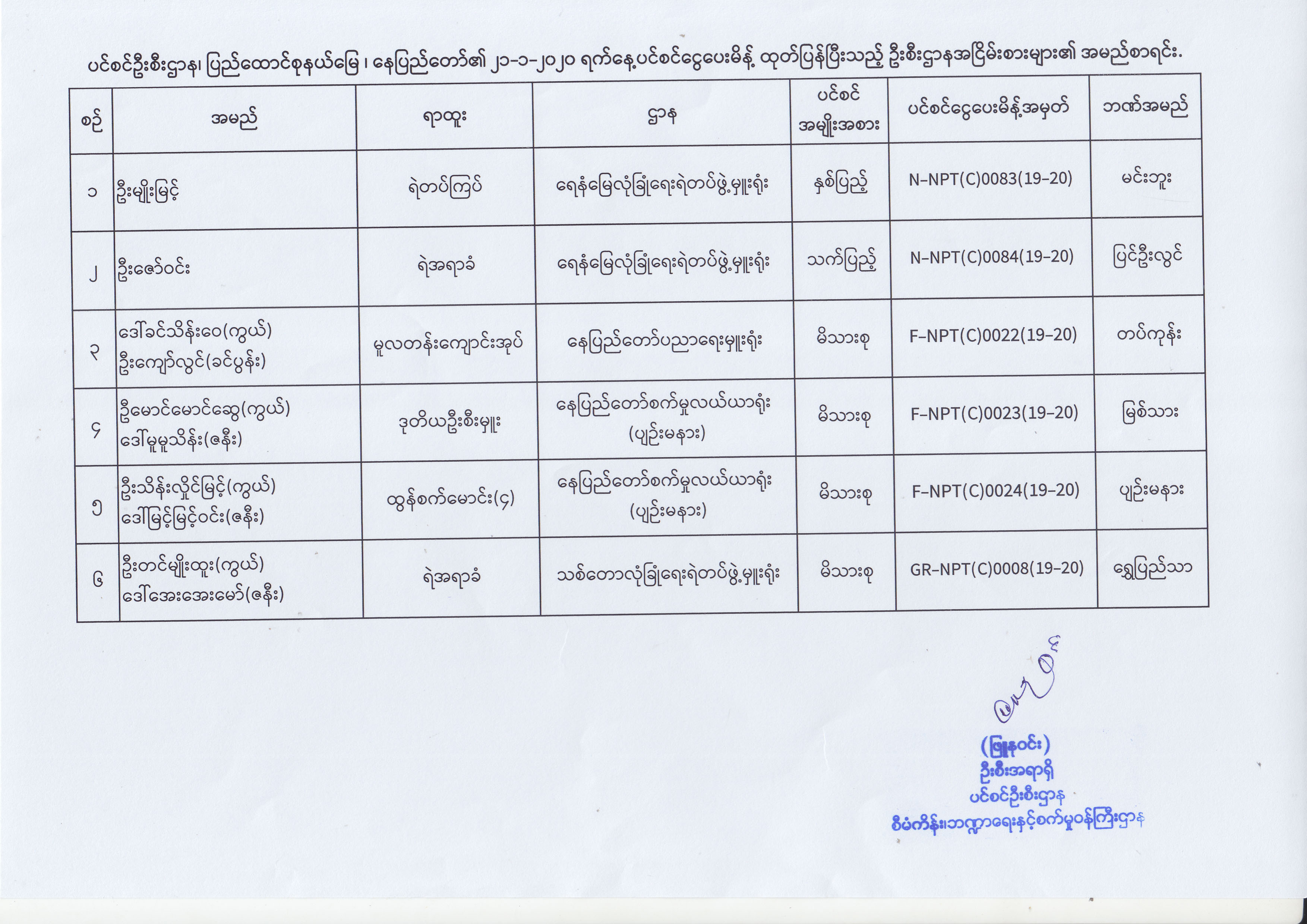 ပင်စင်ဦးစီးဌာန၊ နေပြည်တော်ကောင်စီနယ်မြေ၏ (၁၃.၁.၂၀၂၀) မှ (၃၀.၁.၂၀၂၀) ရက်နေ့အထိ ပင်စင်ငွေပေးမိန့်ထုတ်ပြန်ပြီးသည့် ဦးစီးဌာန အငြိမ်းစားများ၏ အမည်စာရင်း