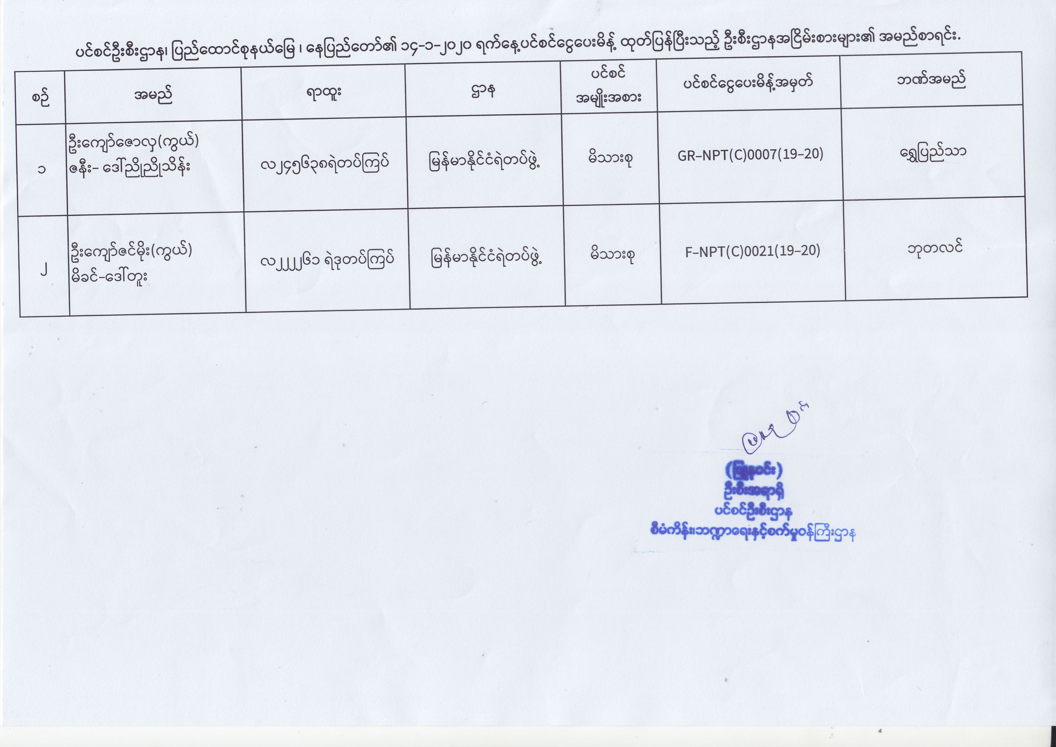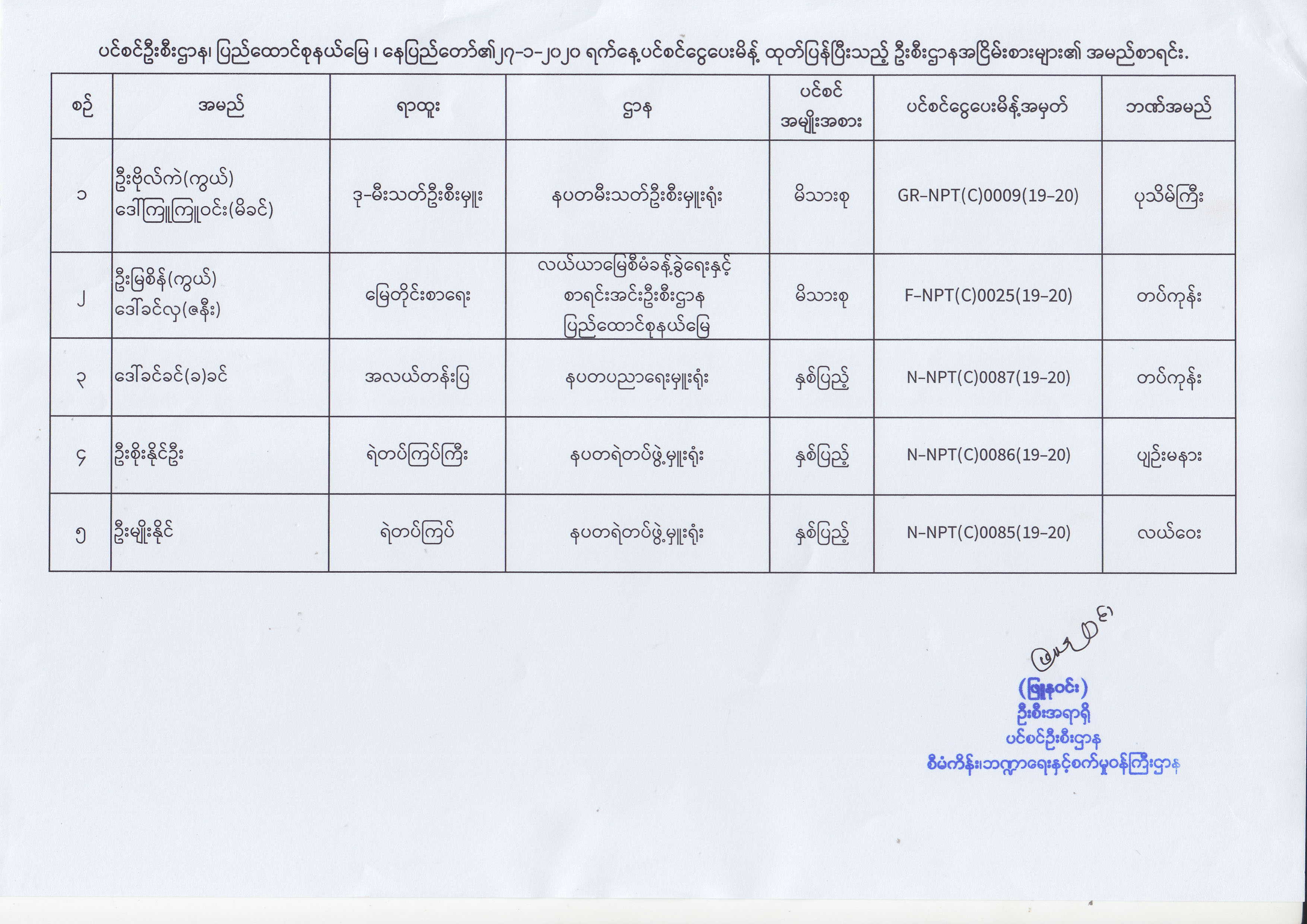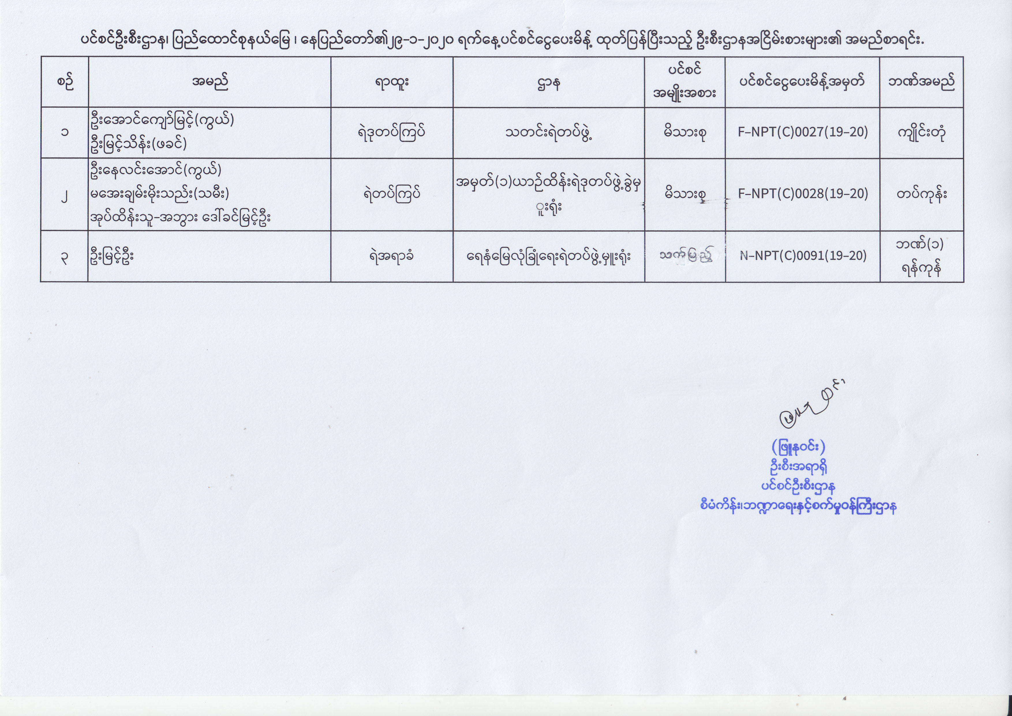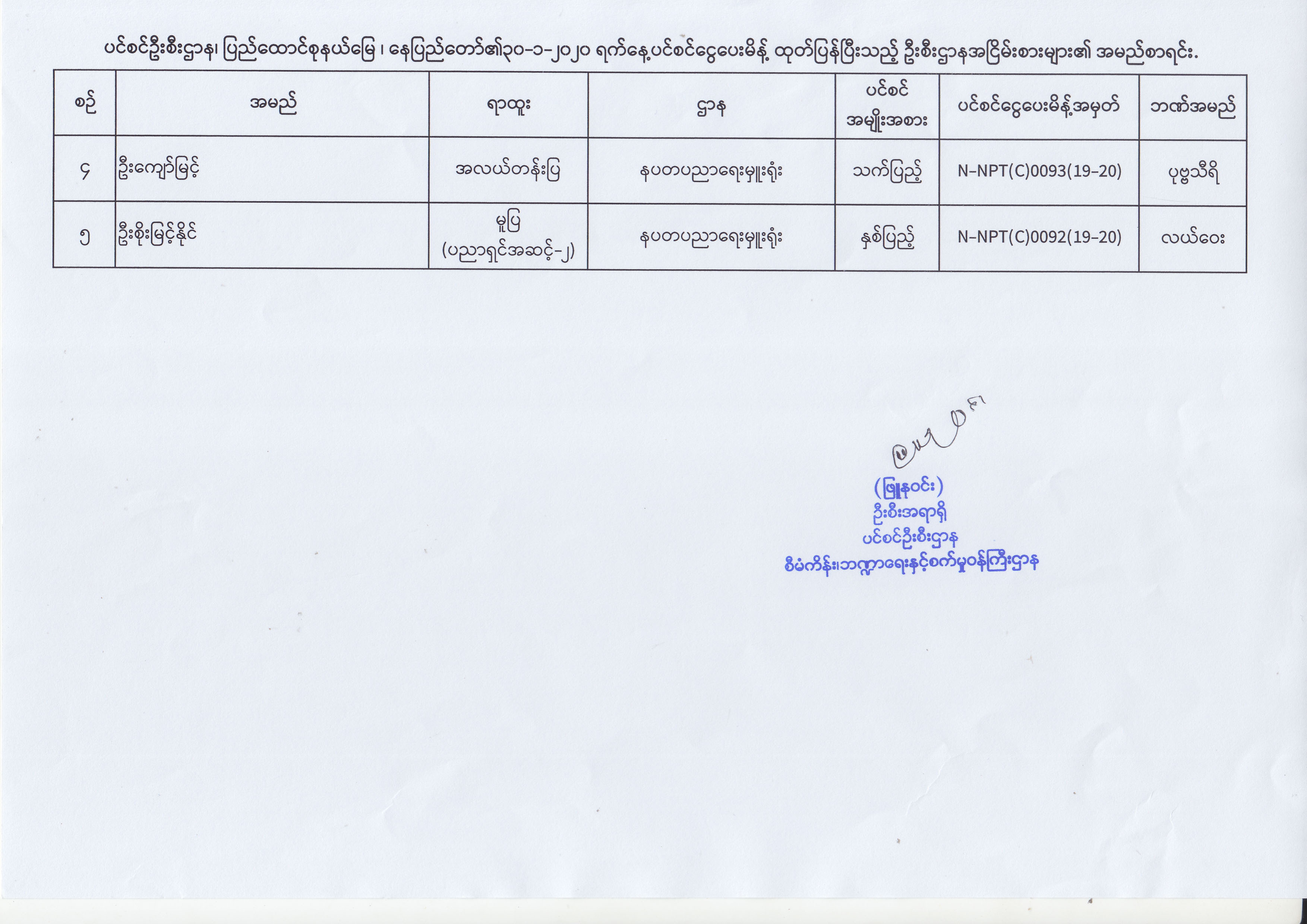 ပင်စင်ဦးစီးဌာန၊ နေပြည်တော်ကောင်စီနယ်မြေ၏ (၁၃.၁.၂၀၂၀) မှ (၃၀.၁.၂၀၂၀) ရက်နေ့အထိ ပင်စင်ငွေပေးမိန့်ထုတ်ပြန်ပြီးသည့် ဦးစီးဌာန အငြိမ်းစားများ၏ အမည်စာရင်း