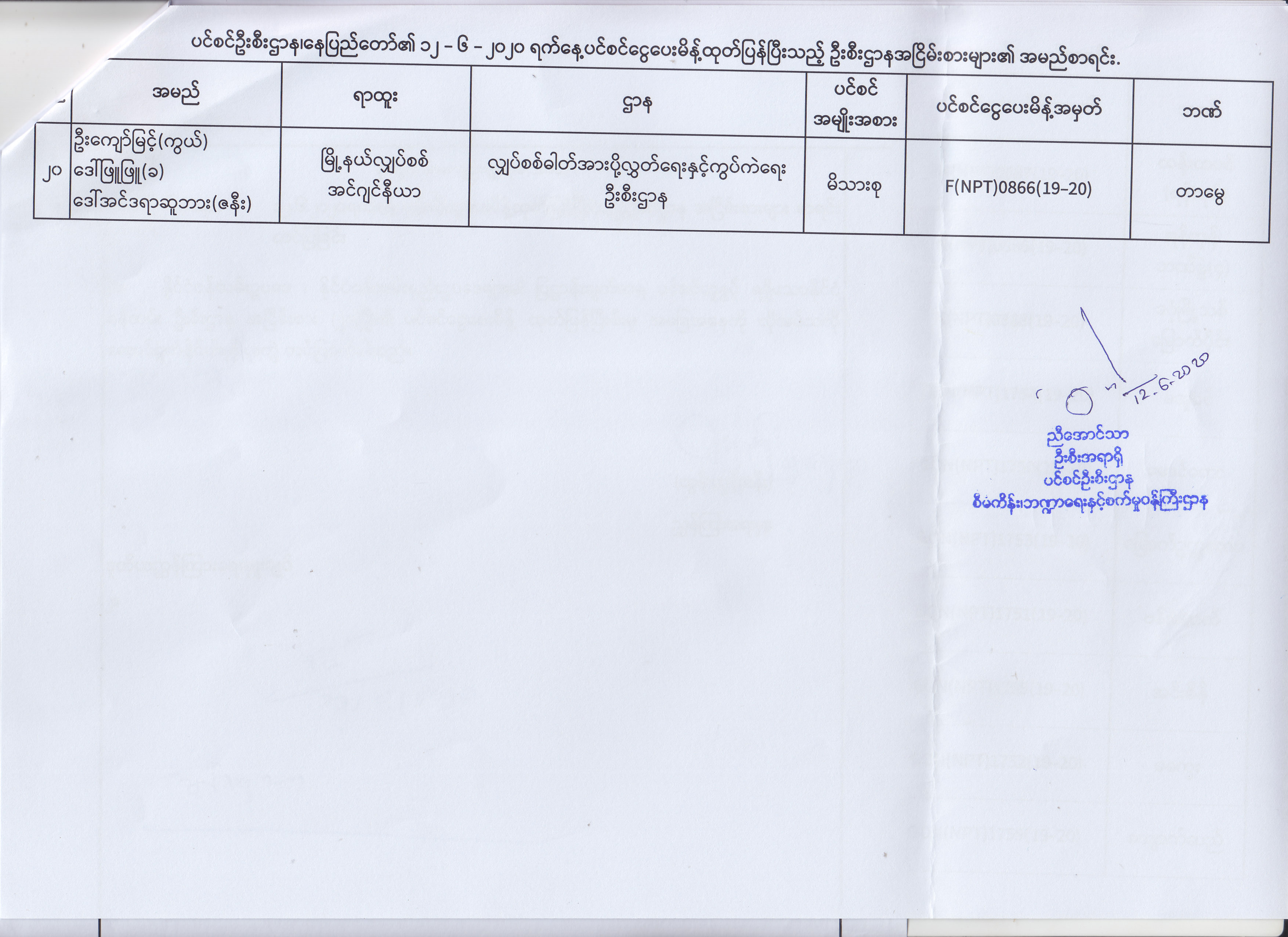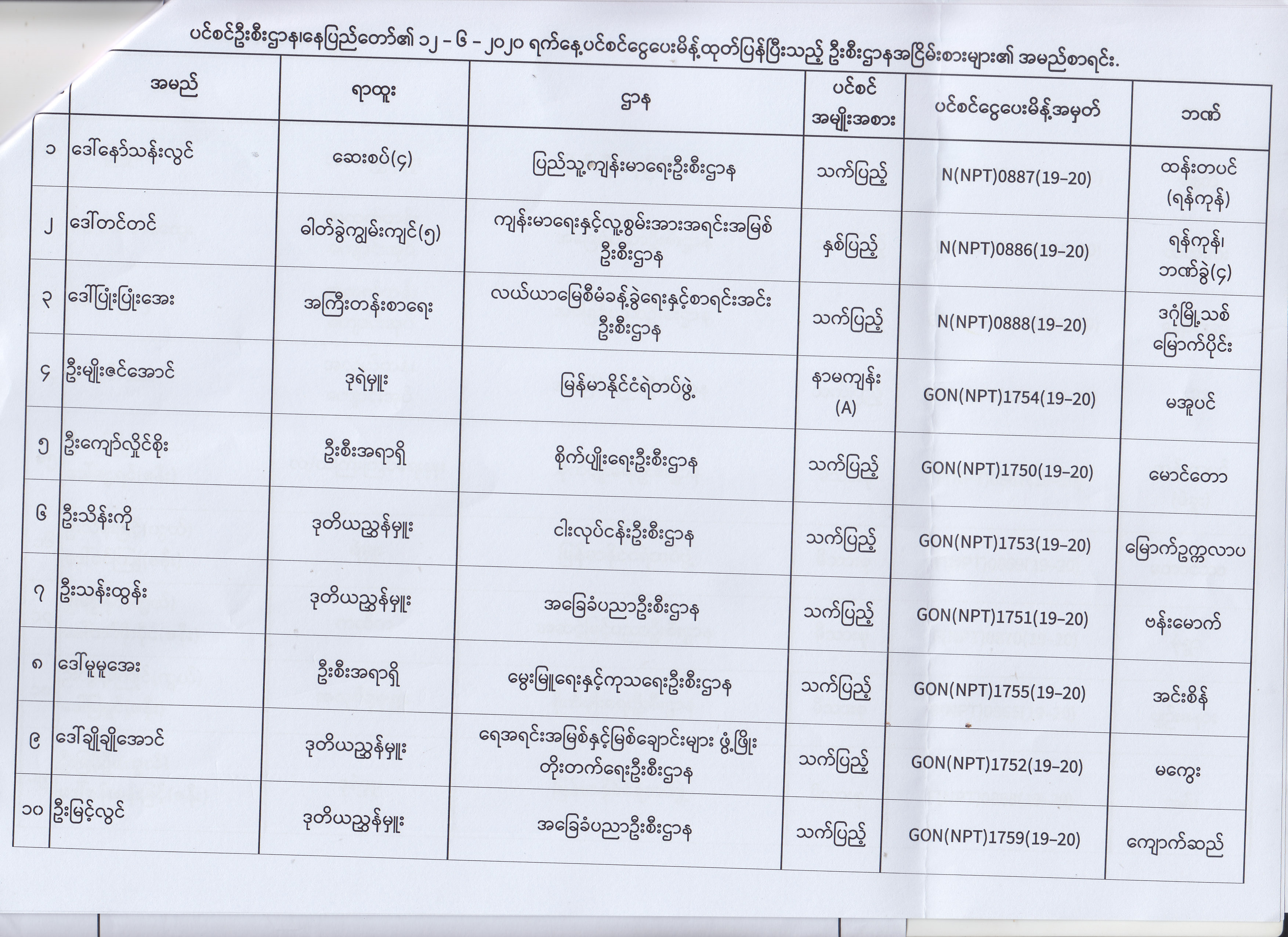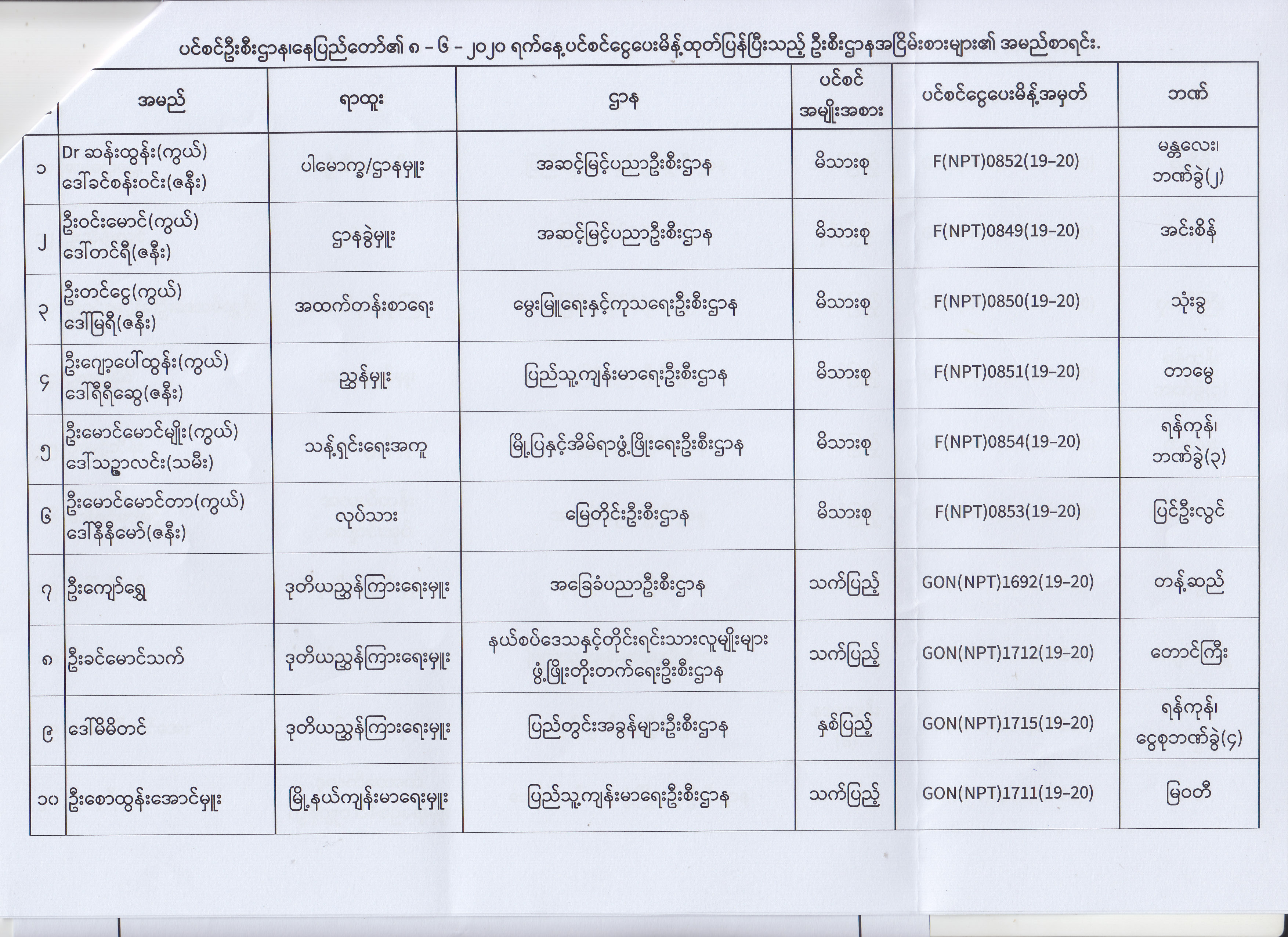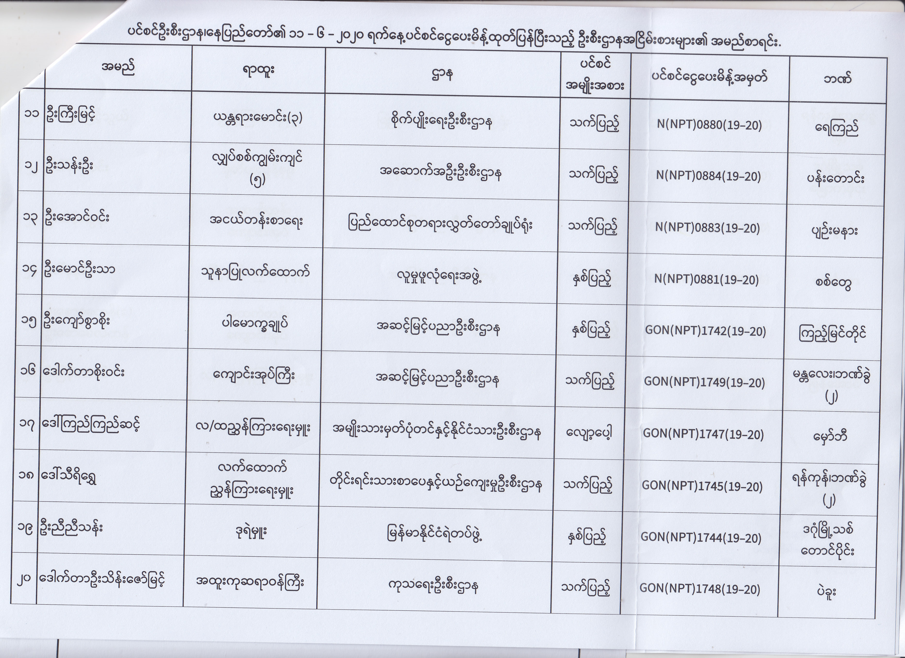 ပင်စင်ဦးစီးဌာန၊ နေပြည်တော်၏ (၈.၆.၂၀၂၀) မှ (၁၂.၆.၂၀၂၀) ရက်နေ့အထိ ပင်စင်ငွေပေးမိန့်ထုတ်ပြန်ပြီးသည့် ဦးစီးဌာနအငြိမ်းစားများ၏ အမည်စာရင်း pdfinance_editor Mon, 06/15/2020 - 15:11