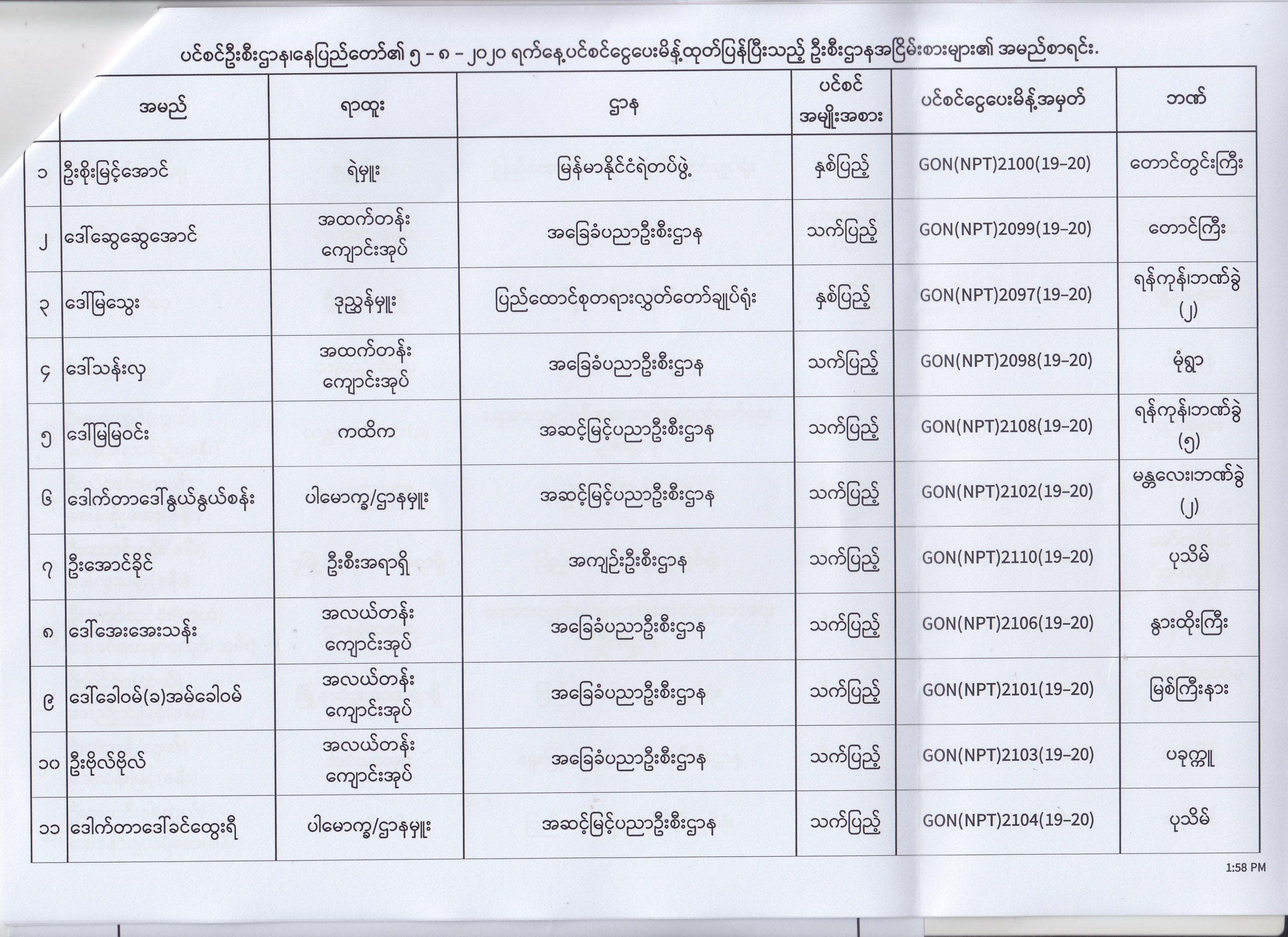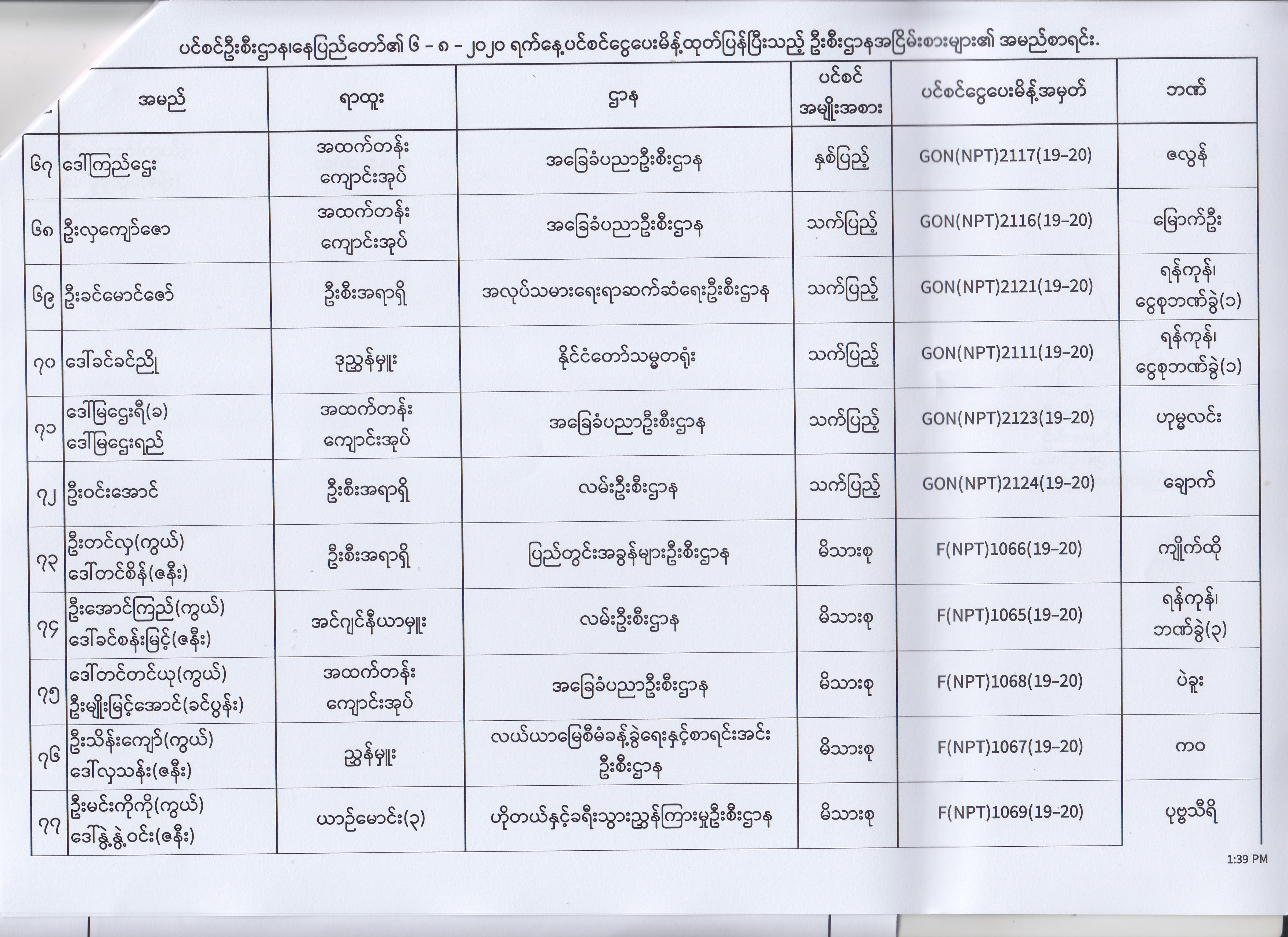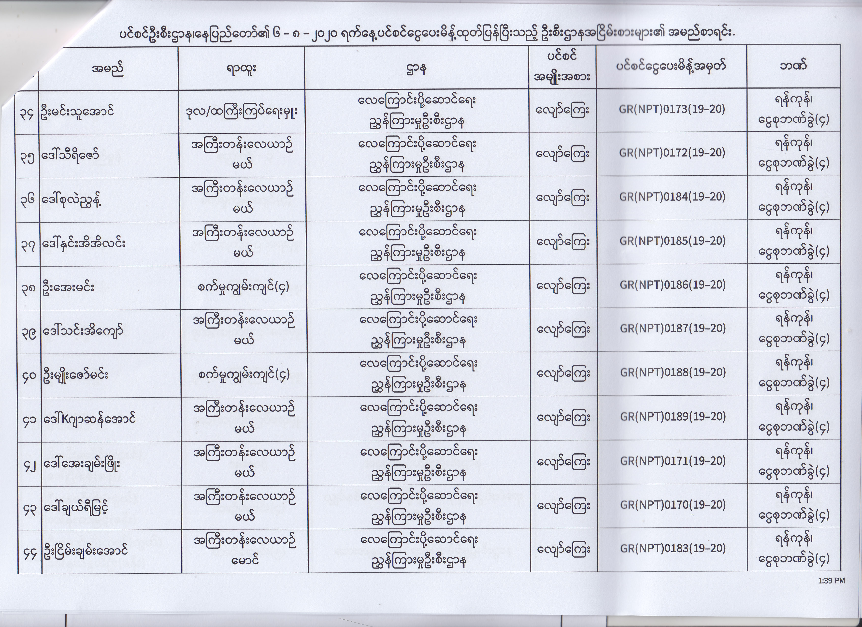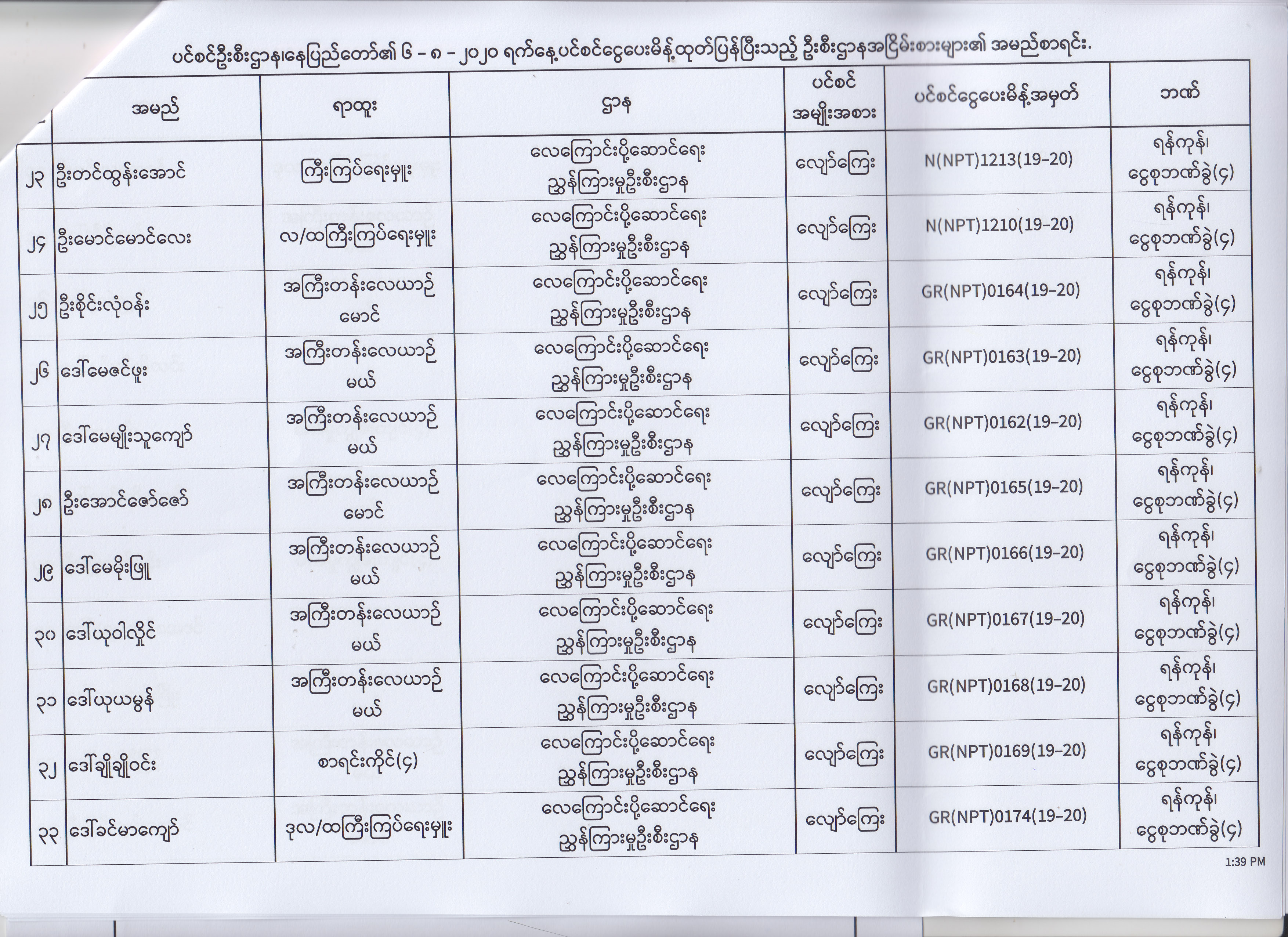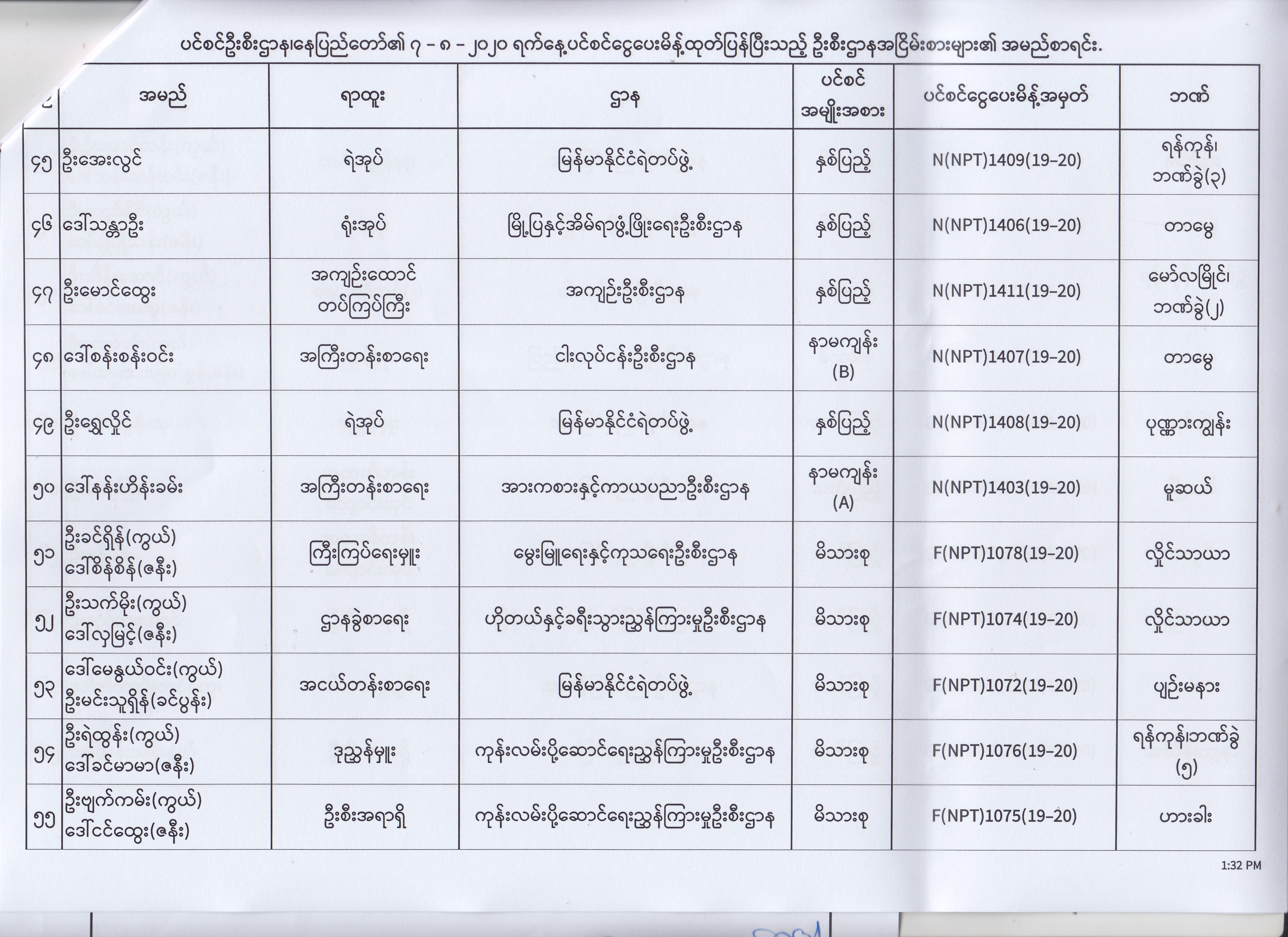 ပင်စင်ဦးစီးဌာန၊ နေပြည်တော်၏ (၄.၈.၂၀၂၀) မှ (၇.၈.၂၀၂၀) ရက်နေ့အထိ ပင်စင်ငွေပေးမိန့်ထုတ်ပြန်ပြီးသည့် ဦးစီးဌာနအငြိမ်းစားများ၏ အမည်စာရင်း pdfinance_editor Mon, 08/24/2020 - 11:34