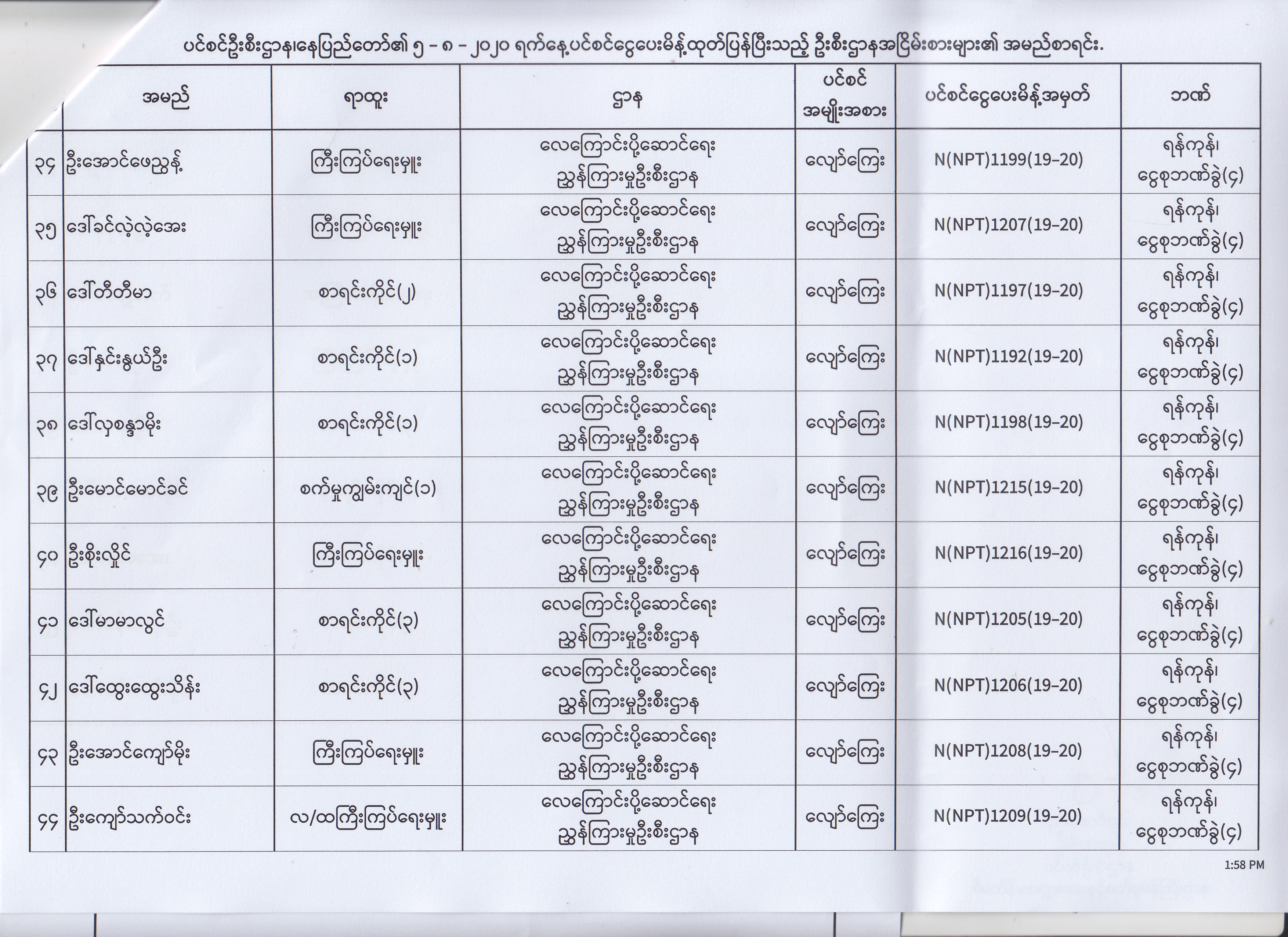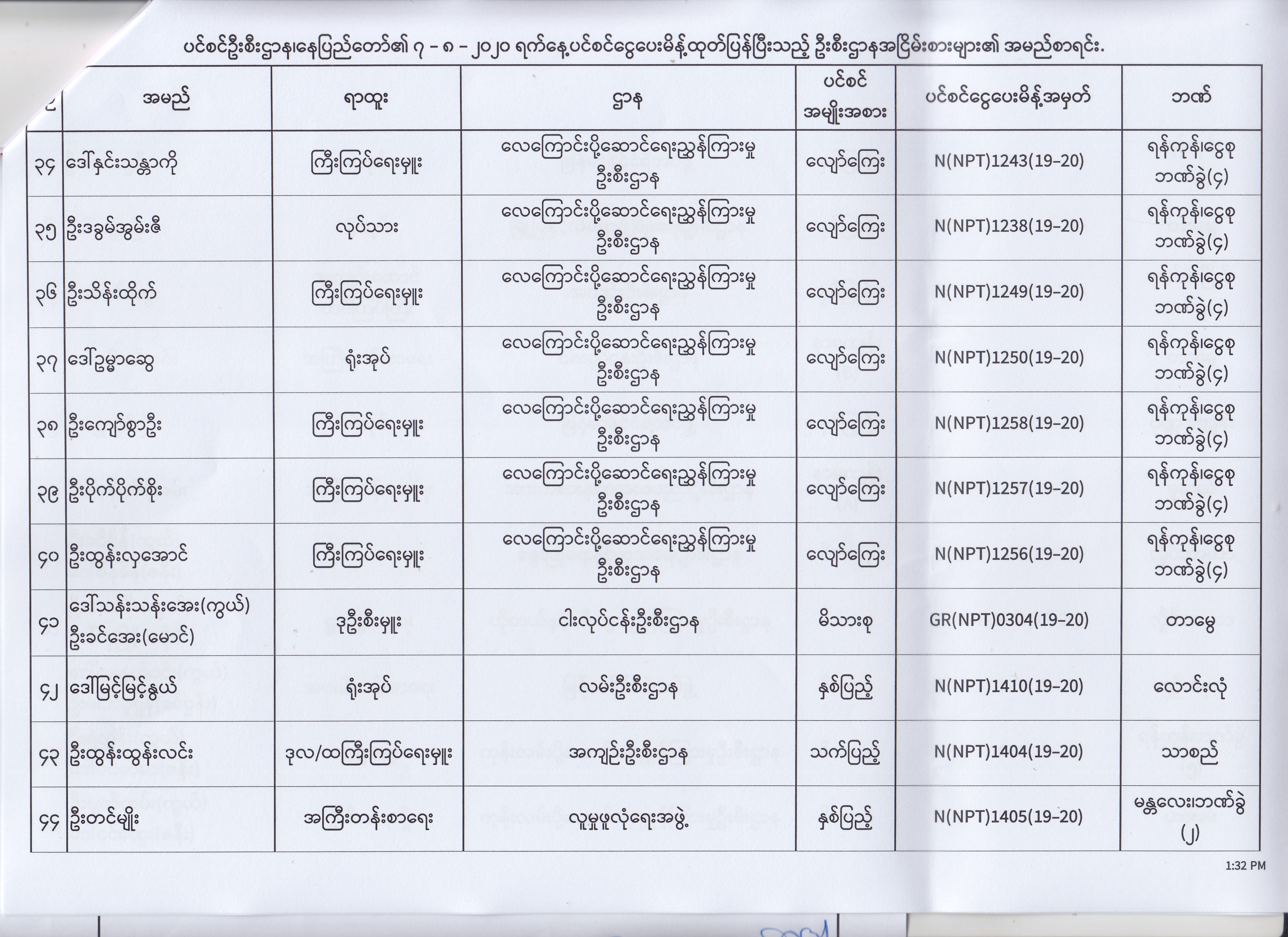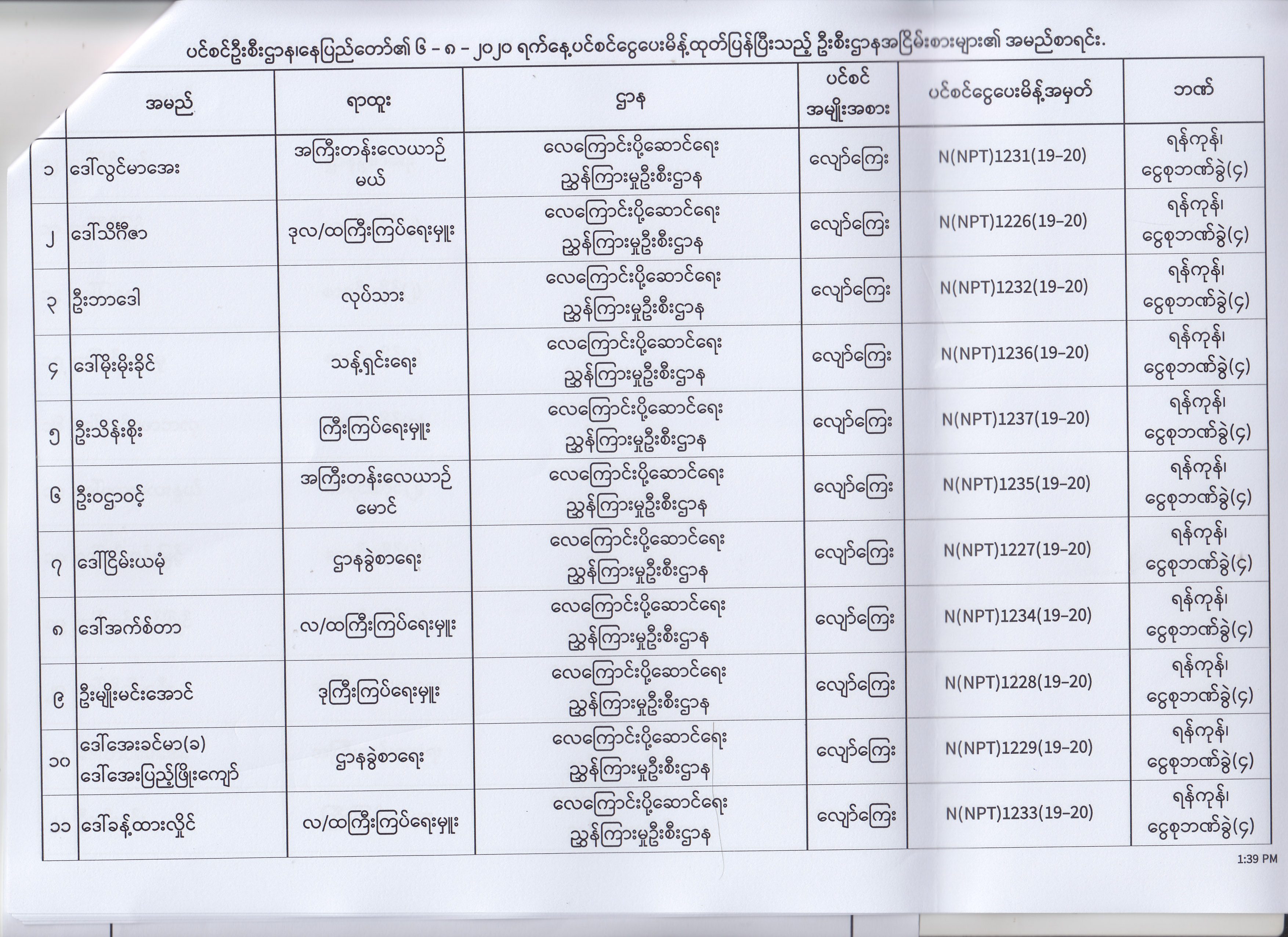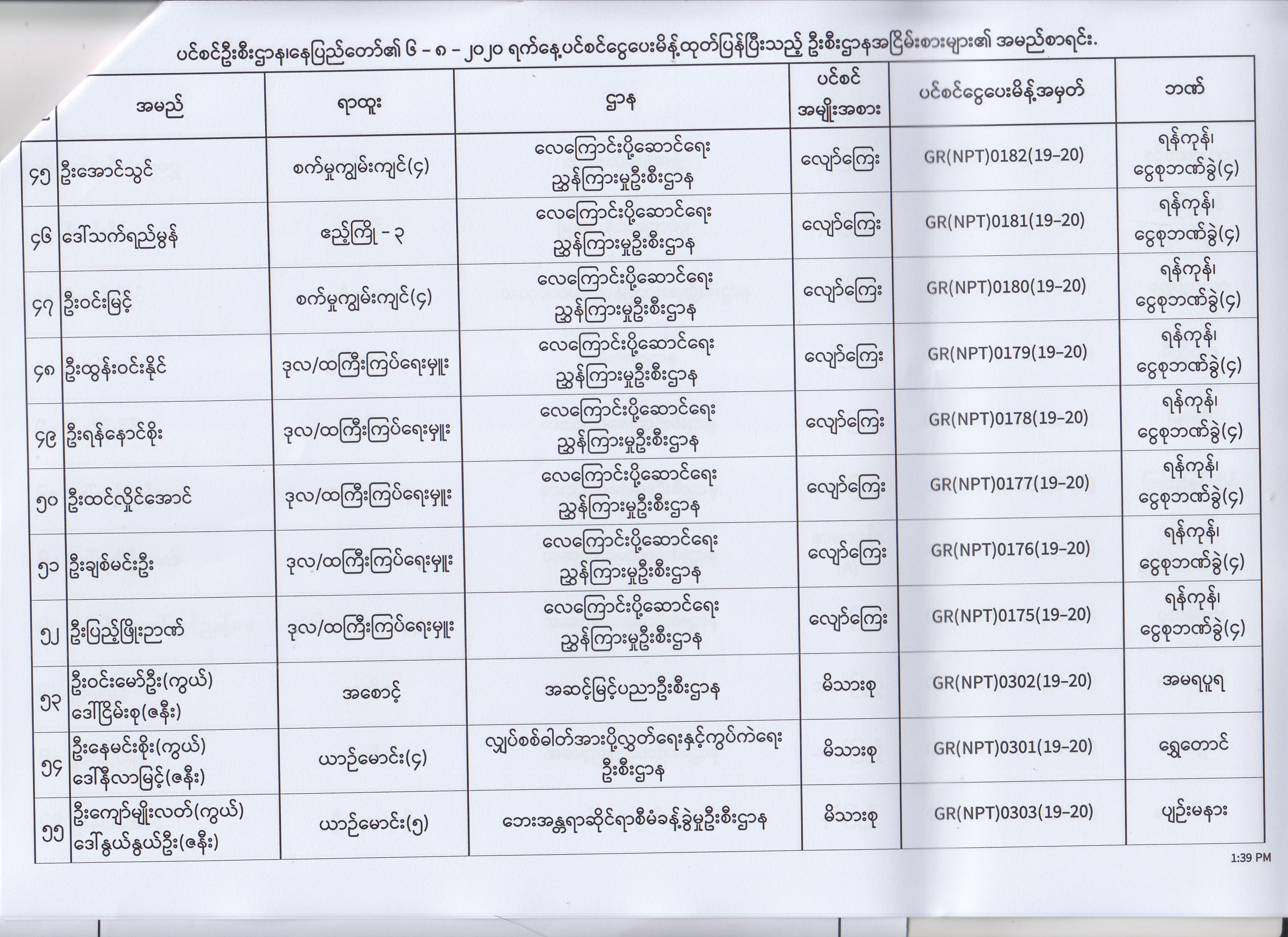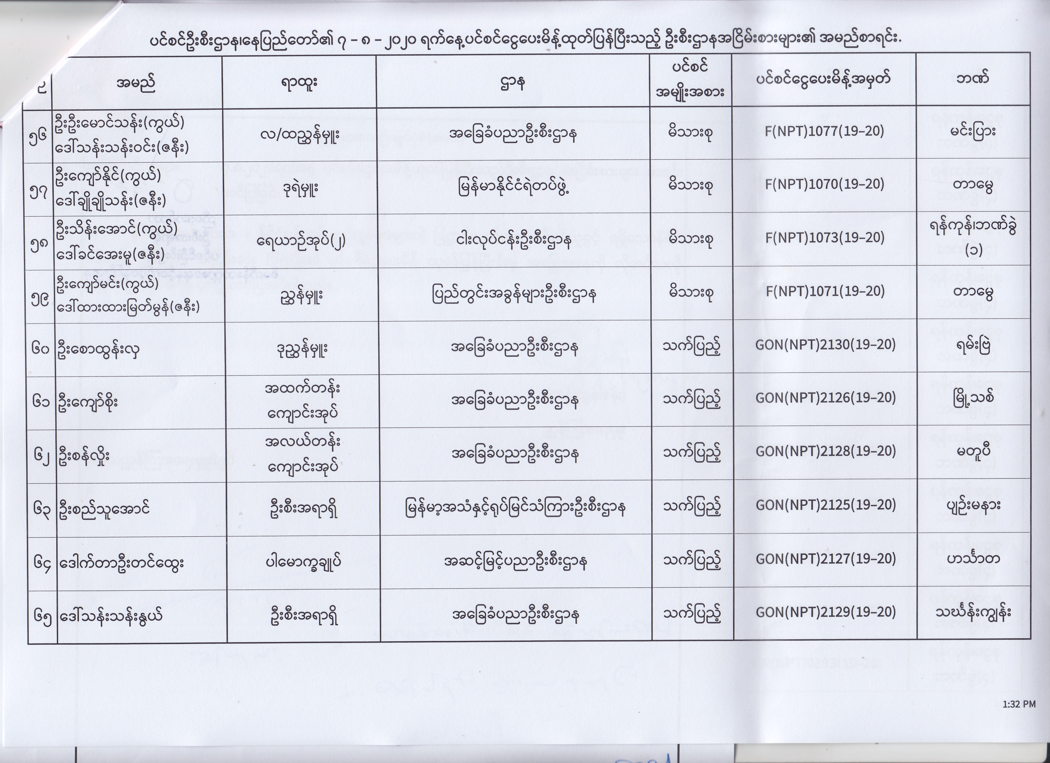 ပင်စင်ဦးစီးဌာန၊ နေပြည်တော်၏ (၄.၈.၂၀၂၀) မှ (၇.၈.၂၀၂၀) ရက်နေ့အထိ ပင်စင်ငွေပေးမိန့်ထုတ်ပြန်ပြီးသည့် ဦးစီးဌာနအငြိမ်းစားများ၏ အမည်စာရင်း pdfinance_editor Mon, 08/24/2020 - 11:34