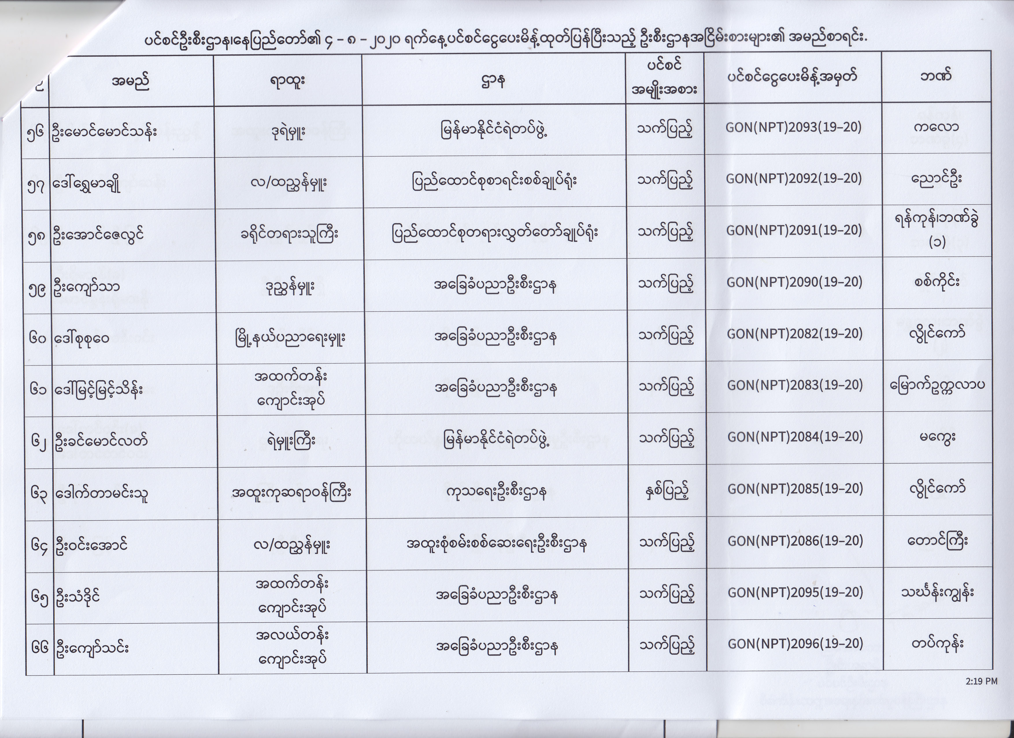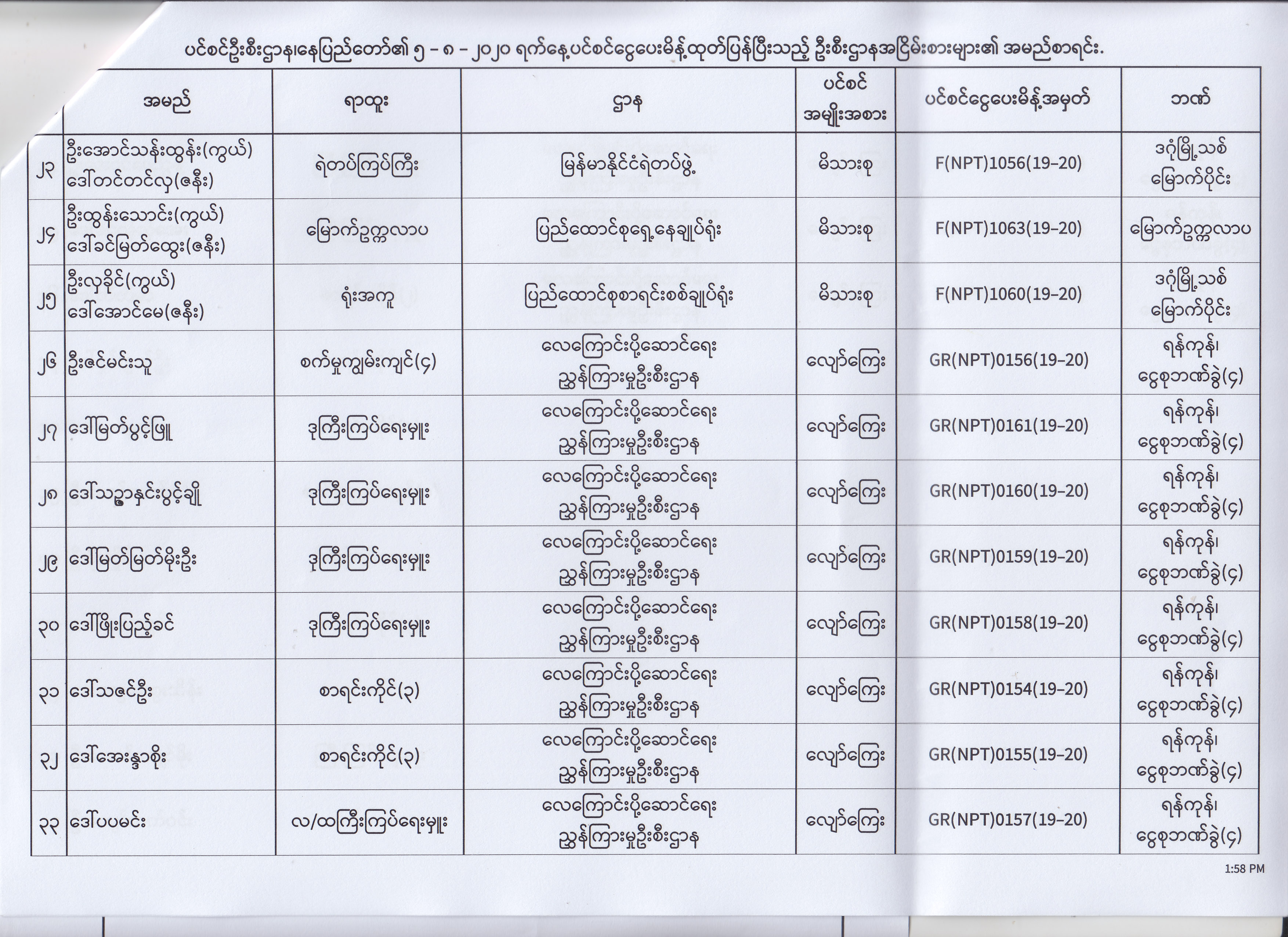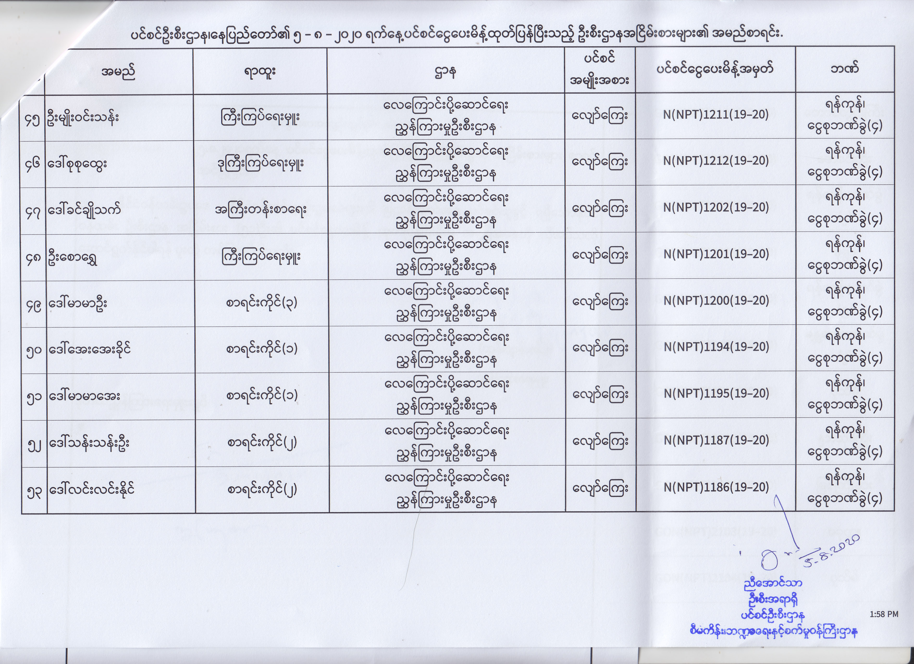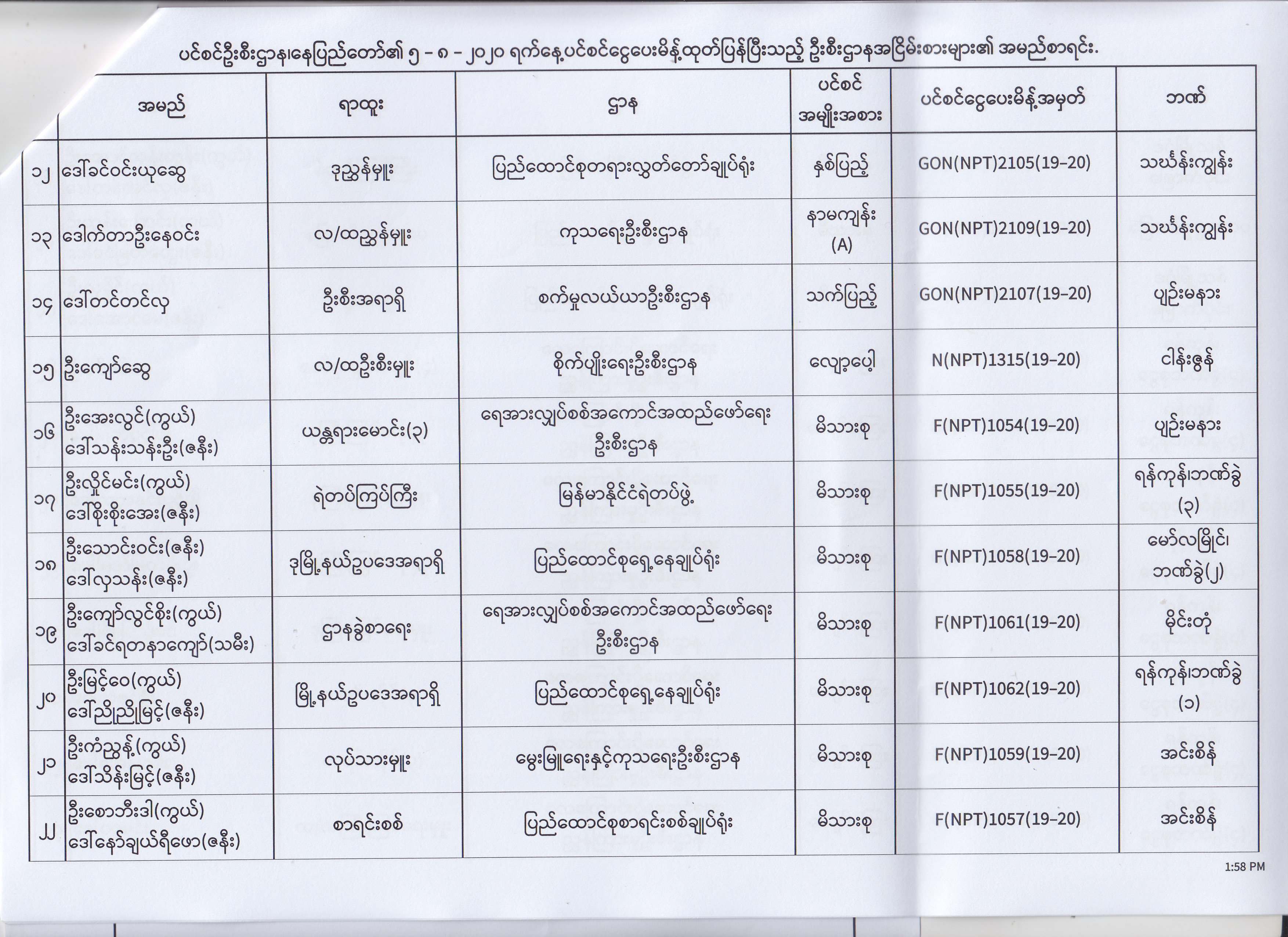 ပင်စင်ဦးစီးဌာန၊ နေပြည်တော်၏ (၄.၈.၂၀၂၀) မှ (၇.၈.၂၀၂၀) ရက်နေ့အထိ ပင်စင်ငွေပေးမိန့်ထုတ်ပြန်ပြီးသည့် ဦးစီးဌာနအငြိမ်းစားများ၏ အမည်စာရင်း pdfinance_editor Mon, 08/24/2020 - 11:34