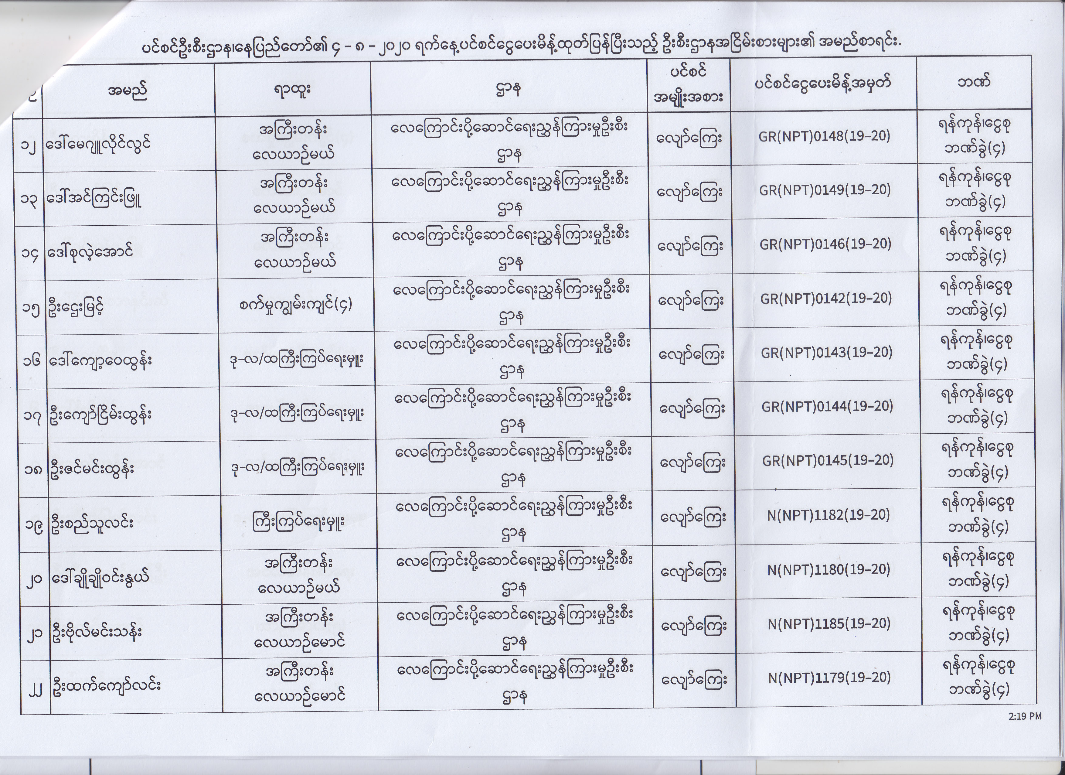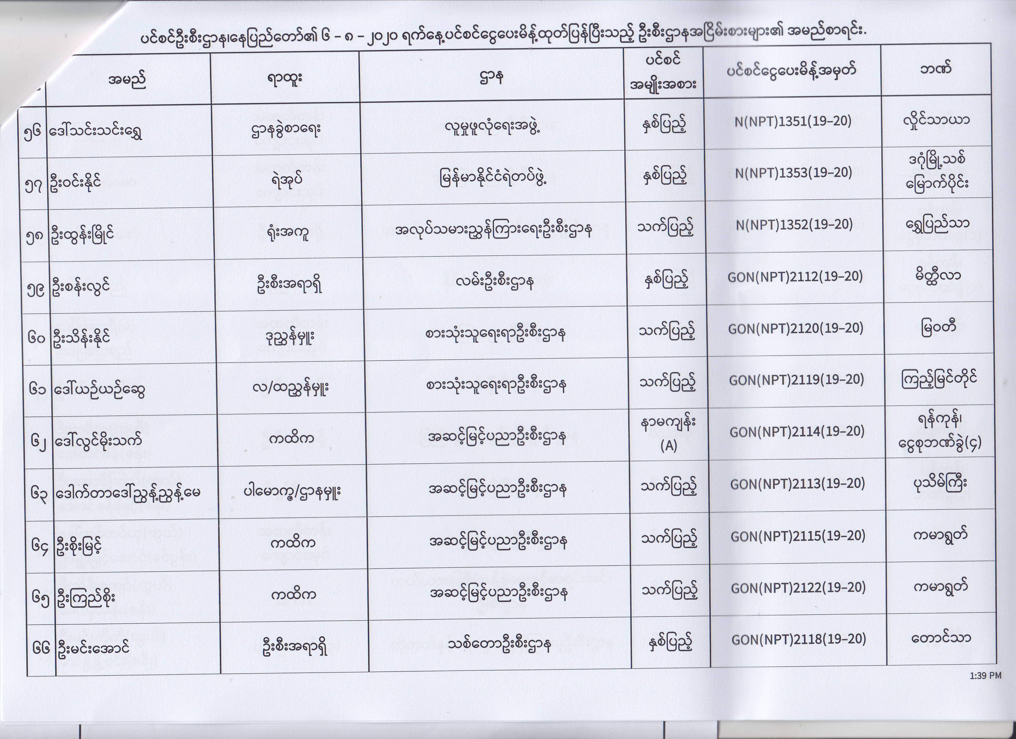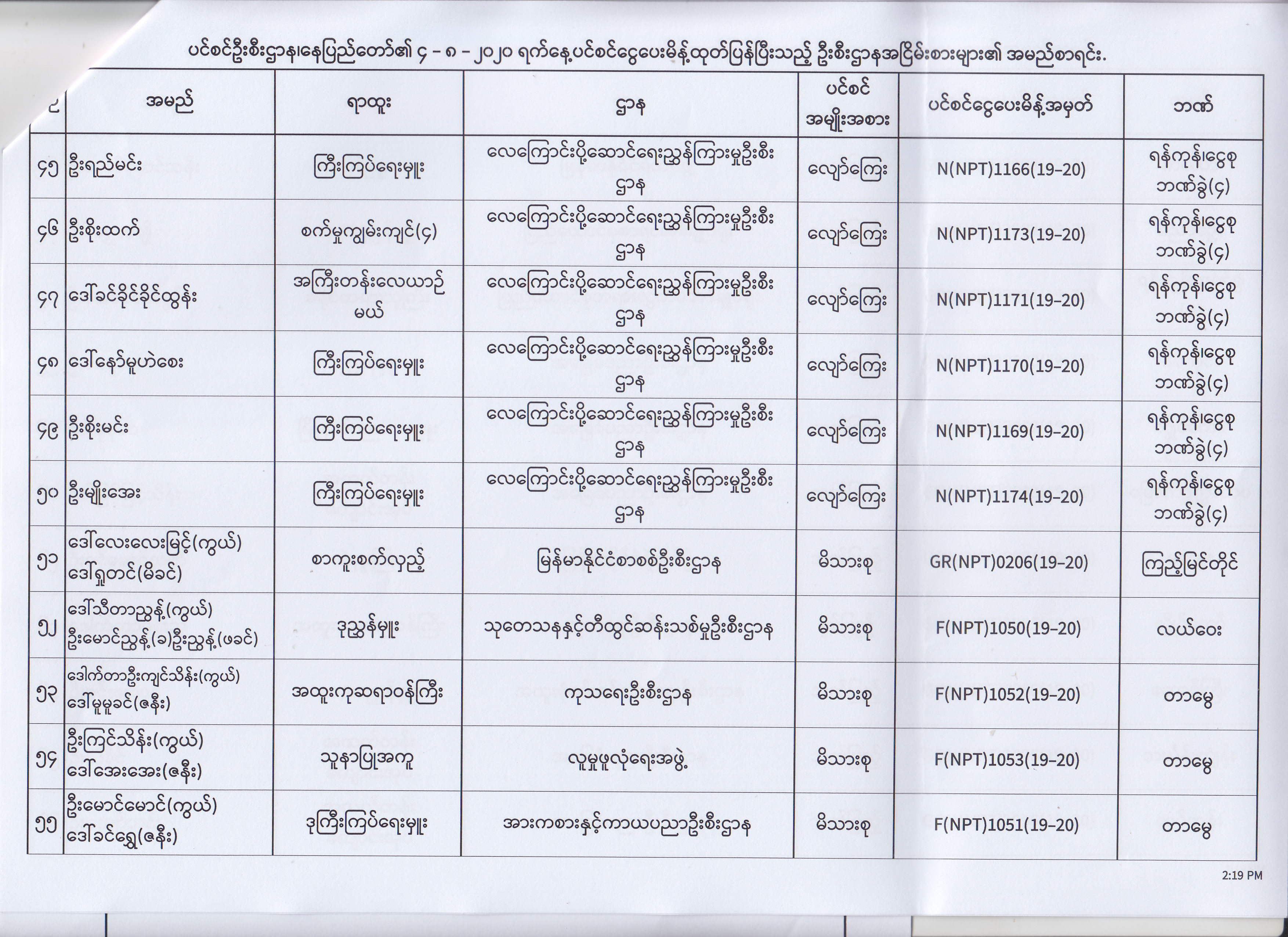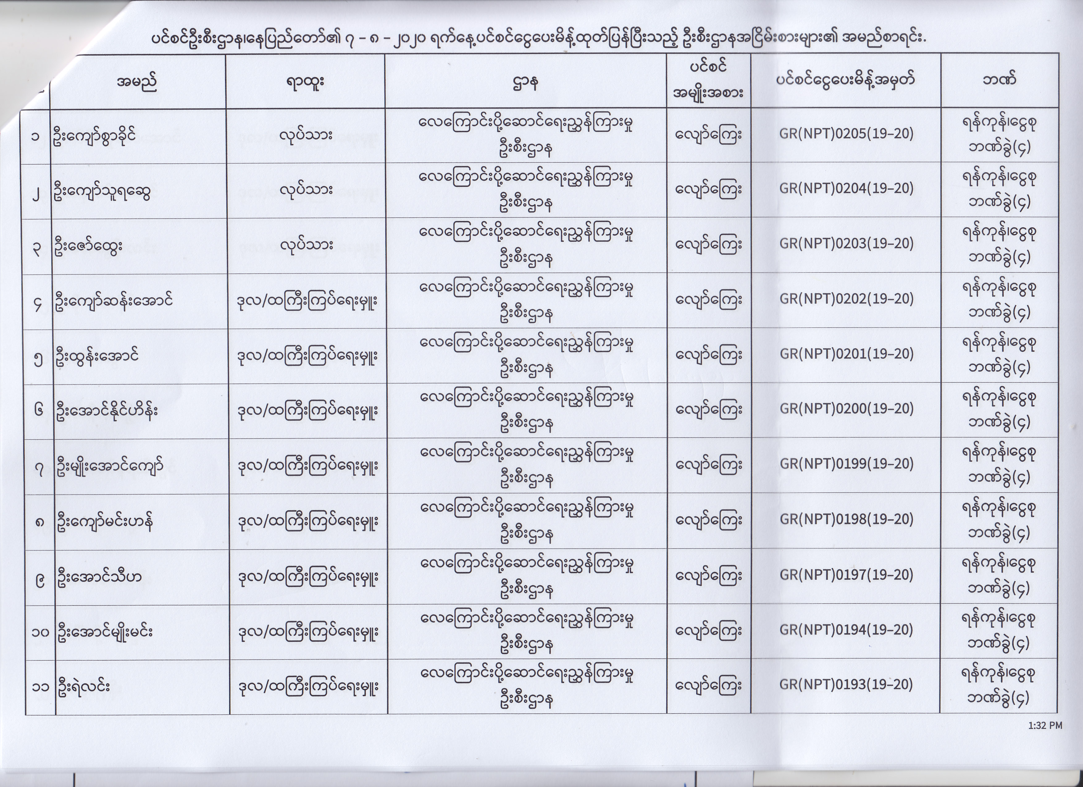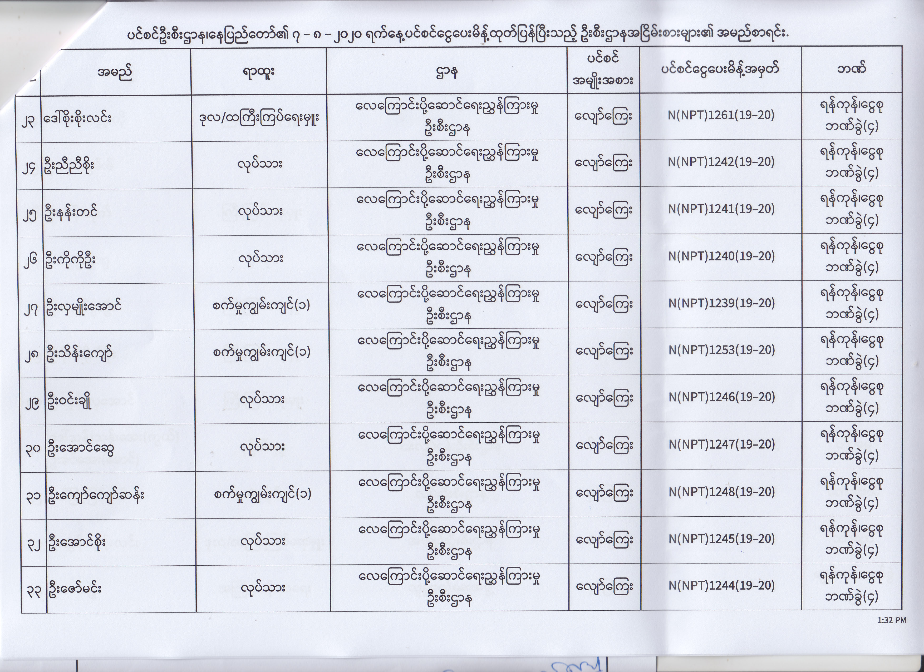 ပင်စင်ဦးစီးဌာန၊ နေပြည်တော်၏ (၄.၈.၂၀၂၀) မှ (၇.၈.၂၀၂၀) ရက်နေ့အထိ ပင်စင်ငွေပေးမိန့်ထုတ်ပြန်ပြီးသည့် ဦးစီးဌာနအငြိမ်းစားများ၏ အမည်စာရင်း pdfinance_editor Mon, 08/24/2020 - 11:34