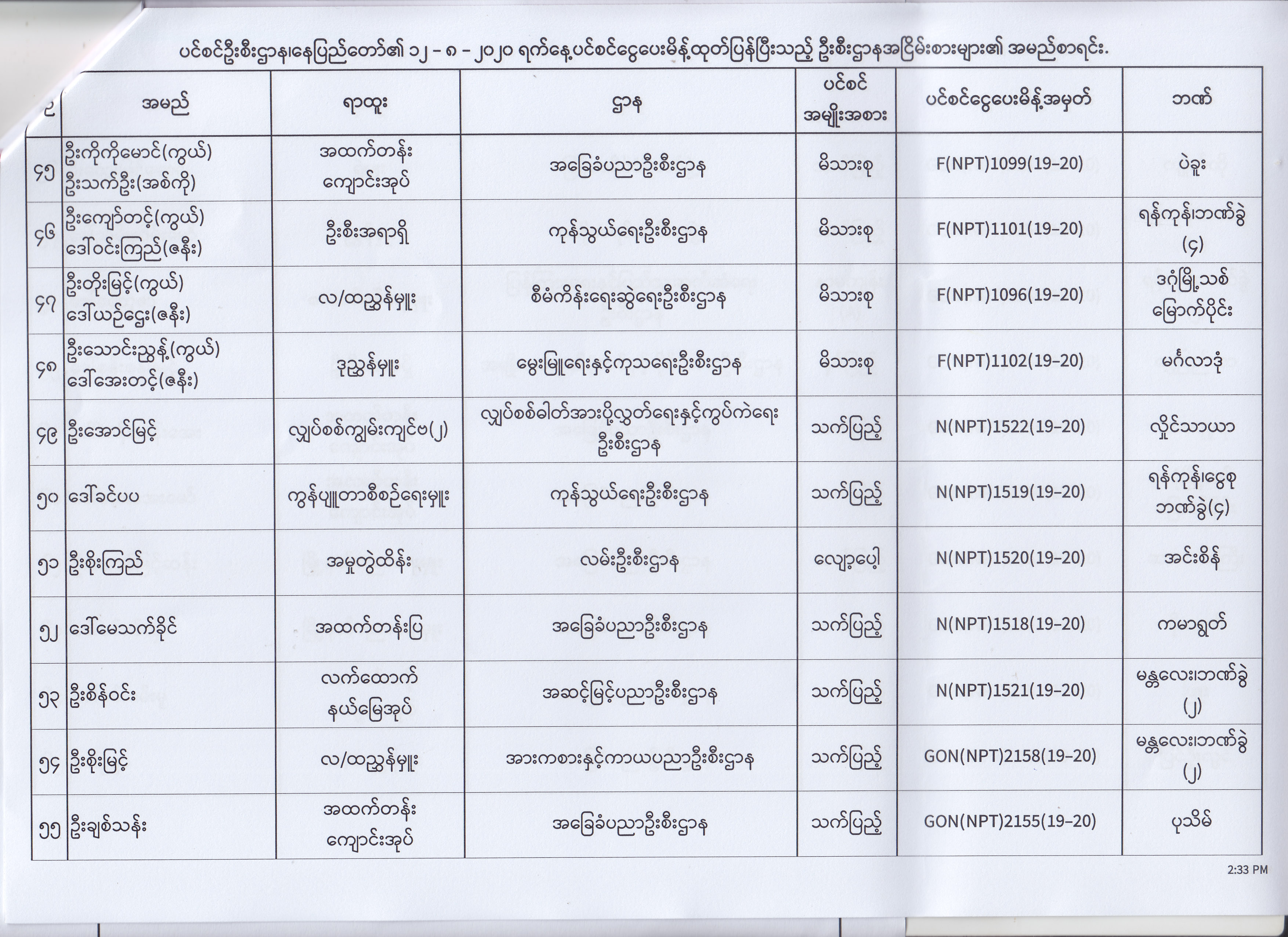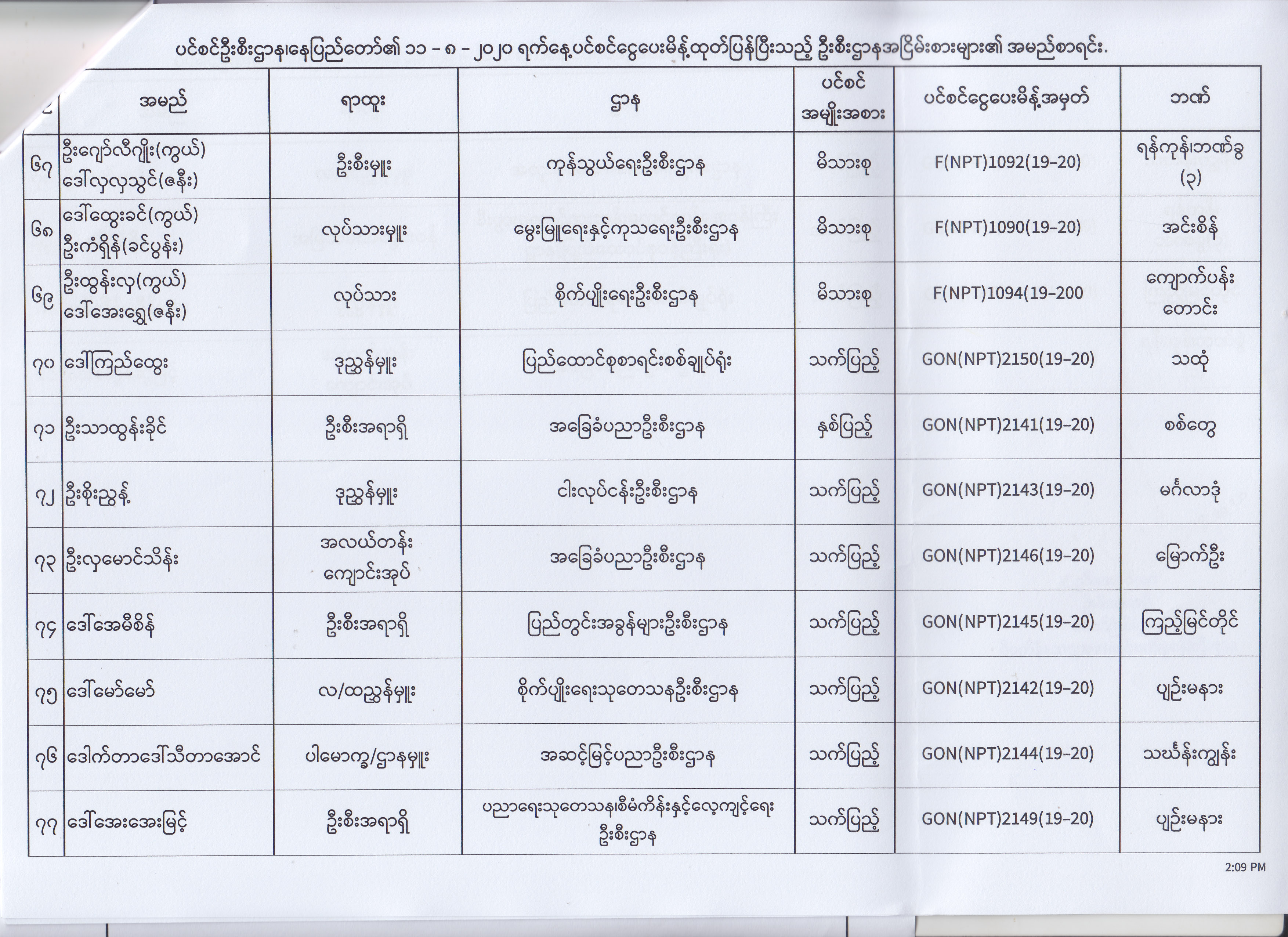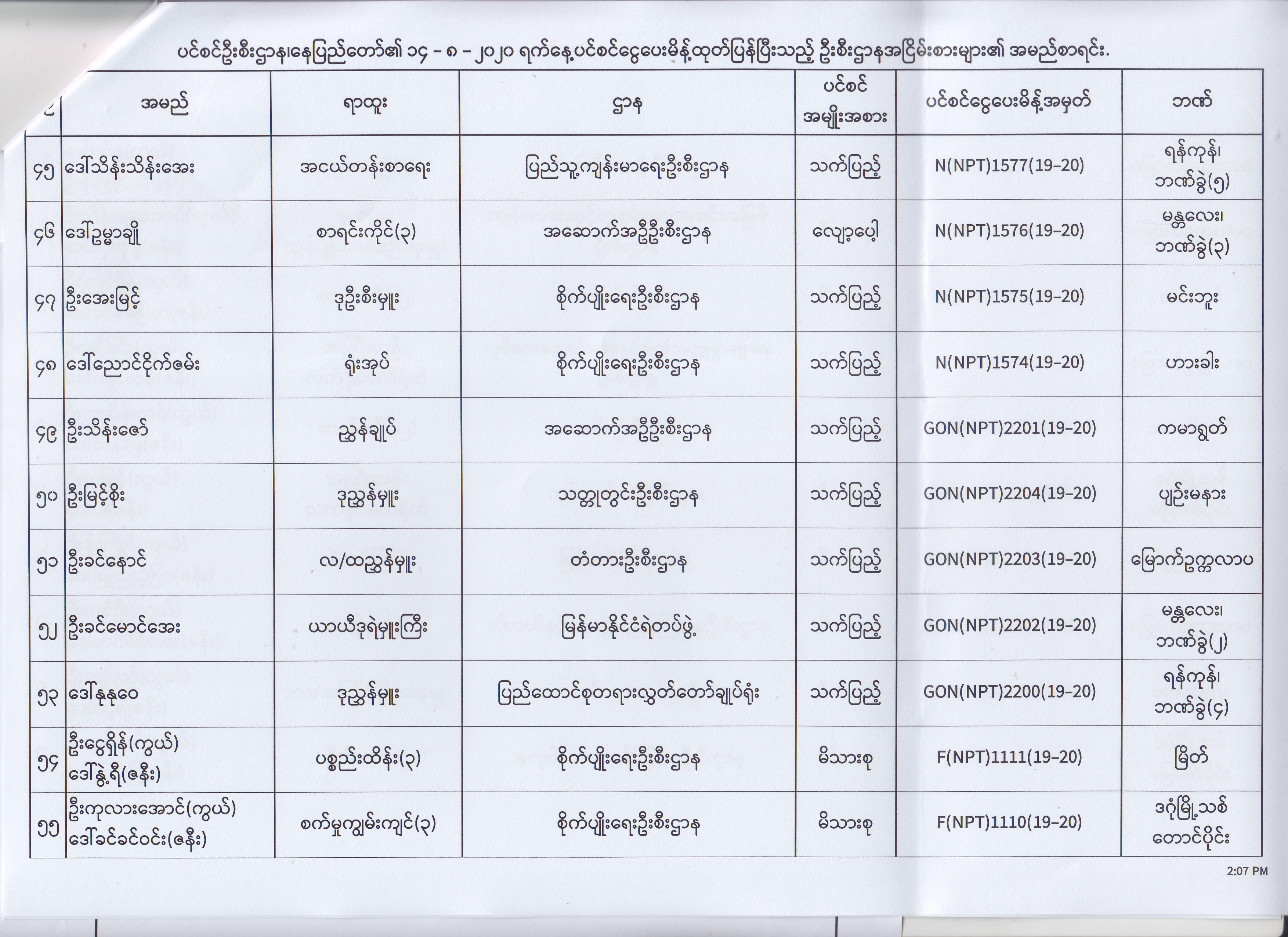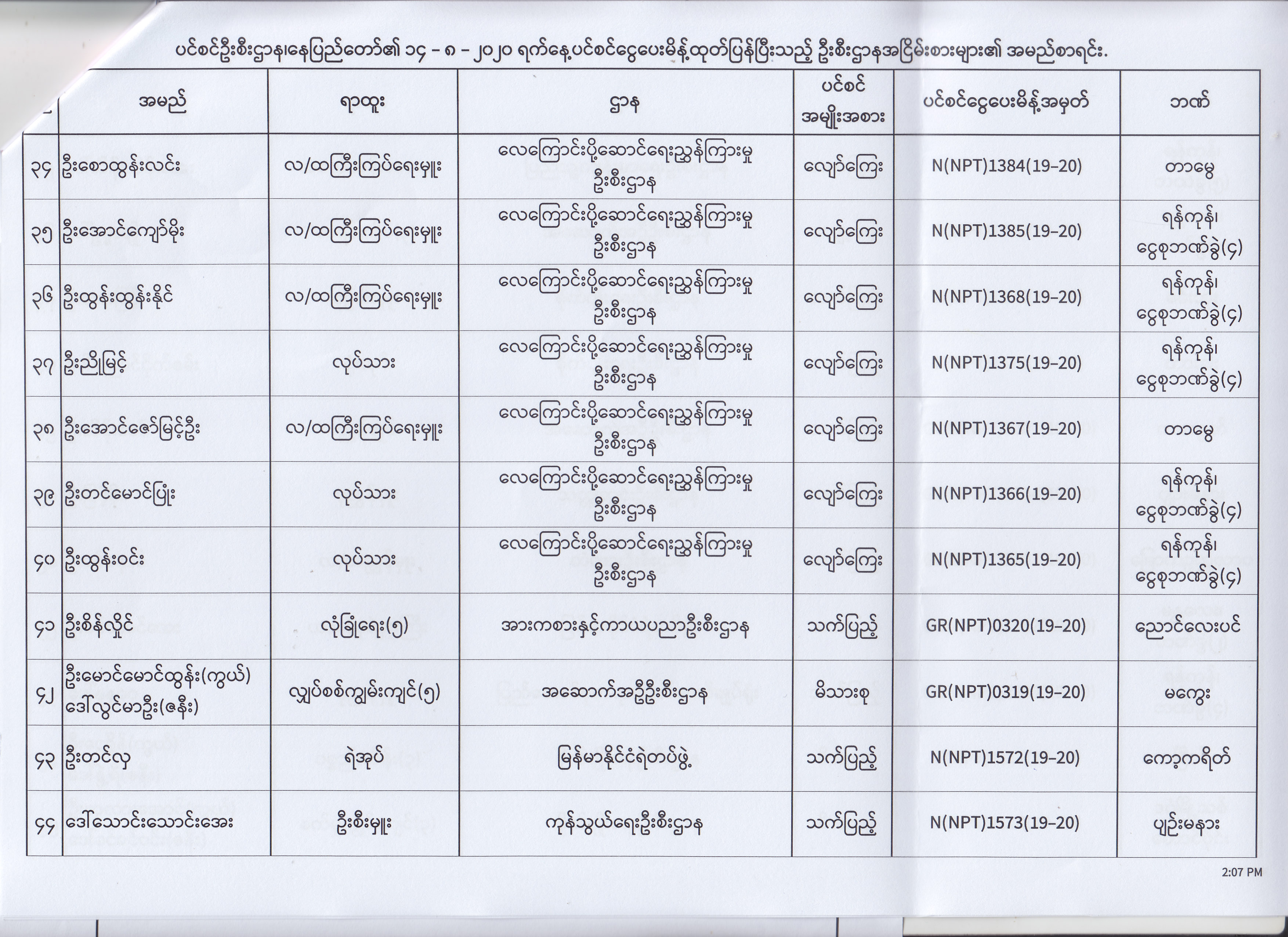 ပင်စင်ဦးစီးဌာန၊ နေပြည်တော်၏ (၁၀.၈.၂၀၂၀) မှ (၁၄.၈.၂၀၂၀) ရက်နေ့အထိ ပင်စင်ငွေပေးမိန့်ထုတ်ပြန်ပြီးသည့် ဦးစီးဌာနအငြိမ်းစားများ၏ အမည်စာရင်း