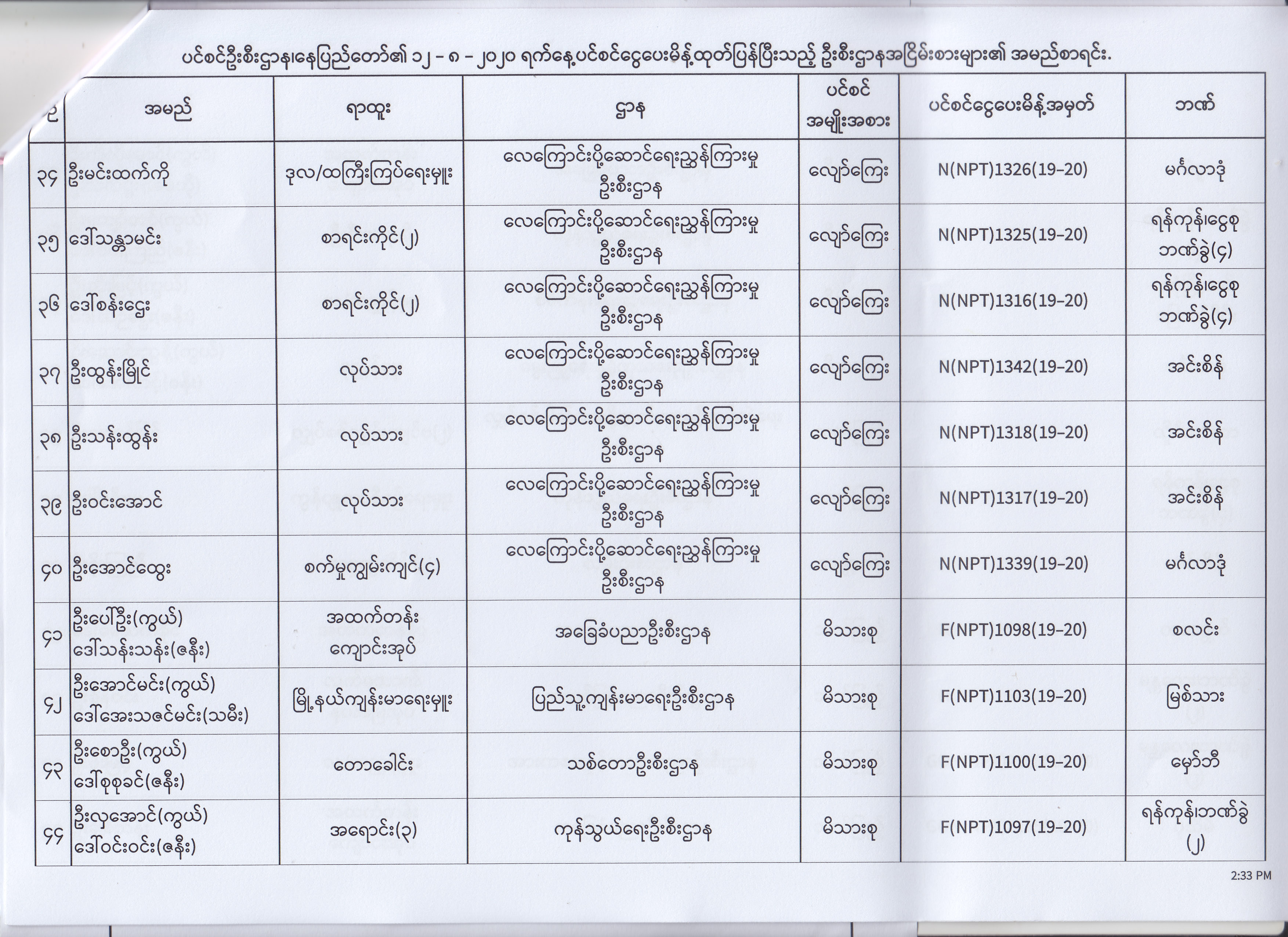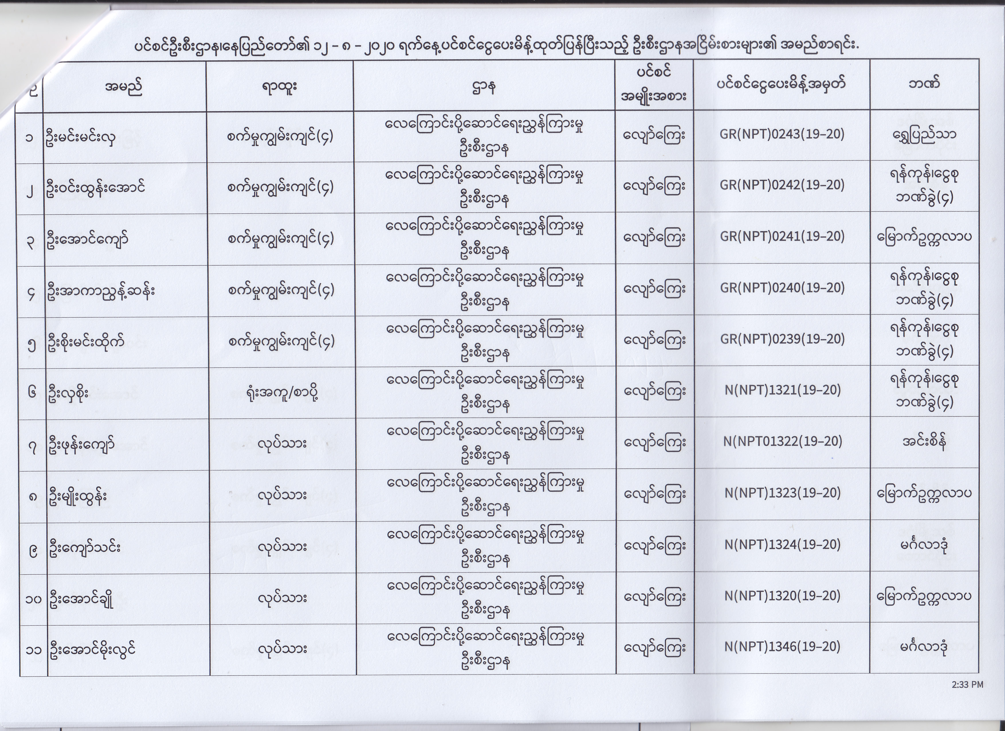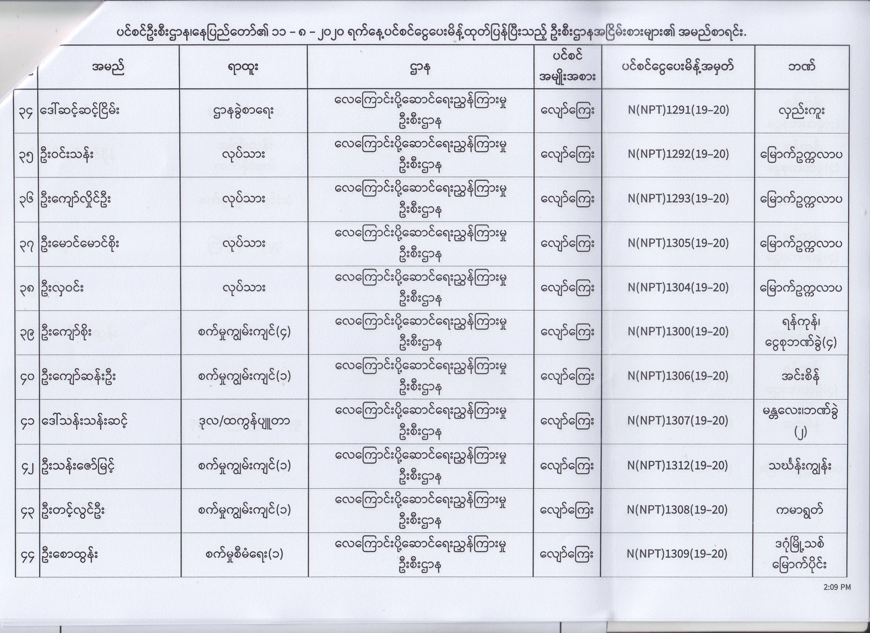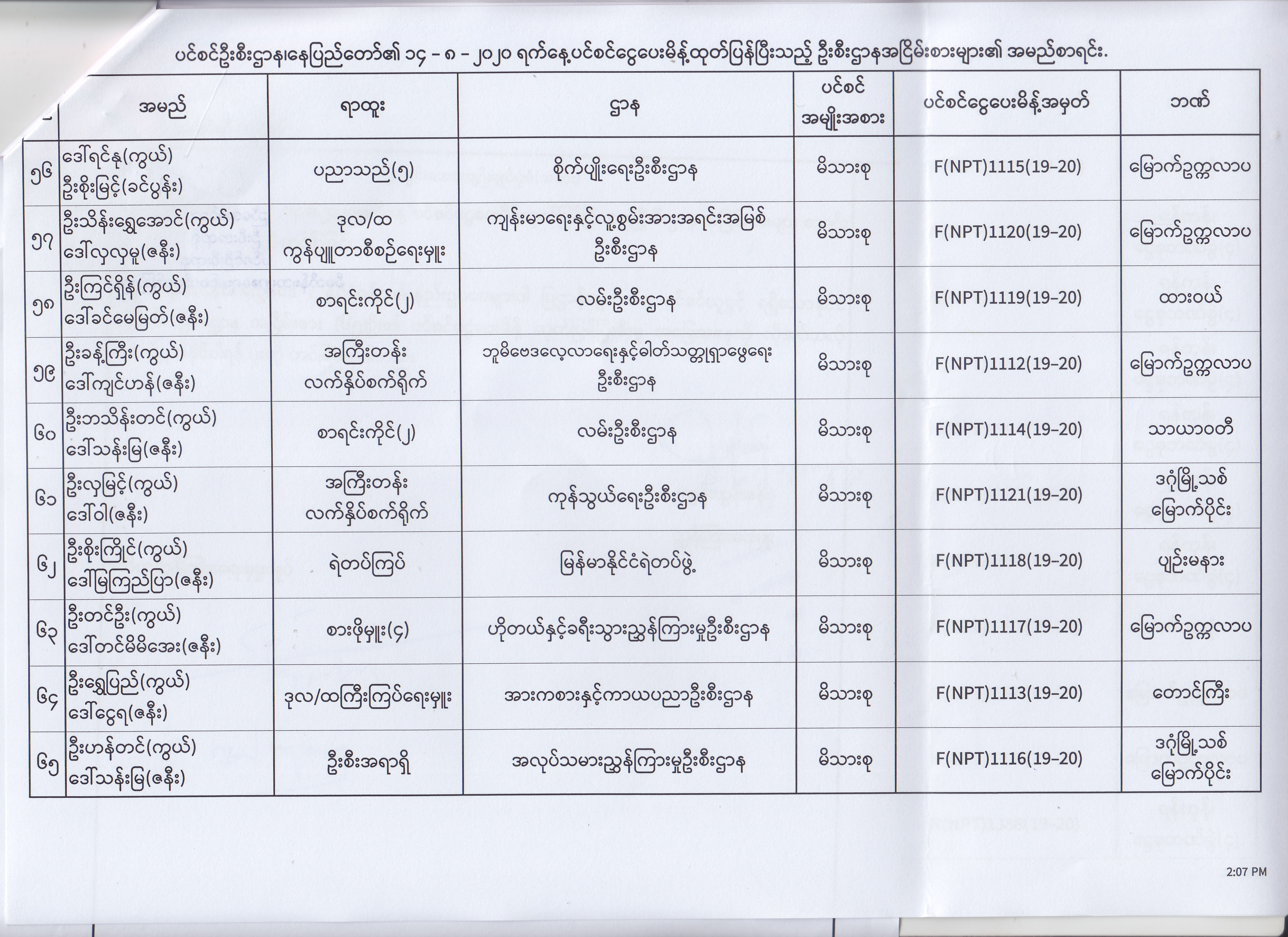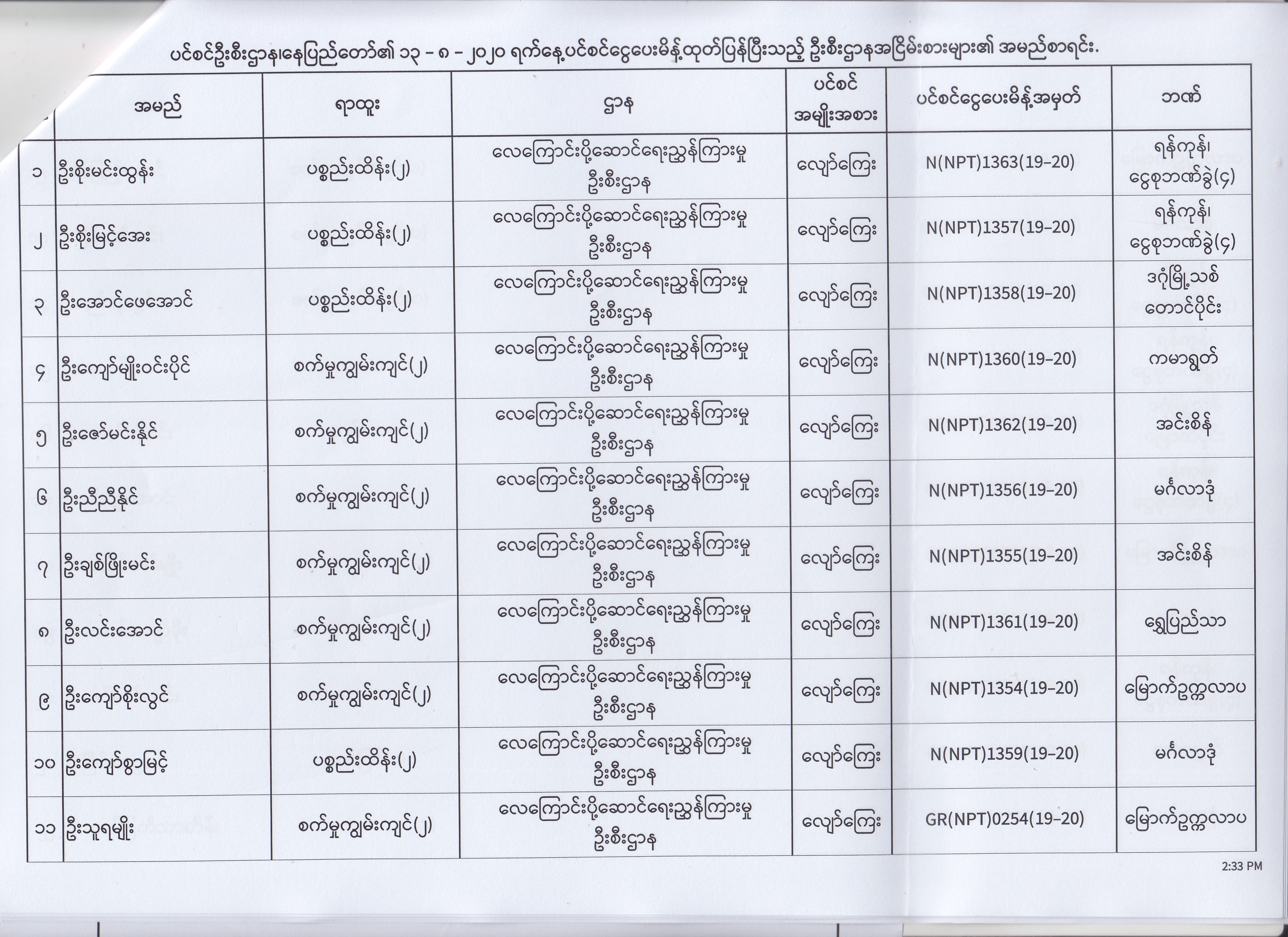 ပင်စင်ဦးစီးဌာန၊ နေပြည်တော်၏ (၁၀.၈.၂၀၂၀) မှ (၁၄.၈.၂၀၂၀) ရက်နေ့အထိ ပင်စင်ငွေပေးမိန့်ထုတ်ပြန်ပြီးသည့် ဦးစီးဌာနအငြိမ်းစားများ၏ အမည်စာရင်း