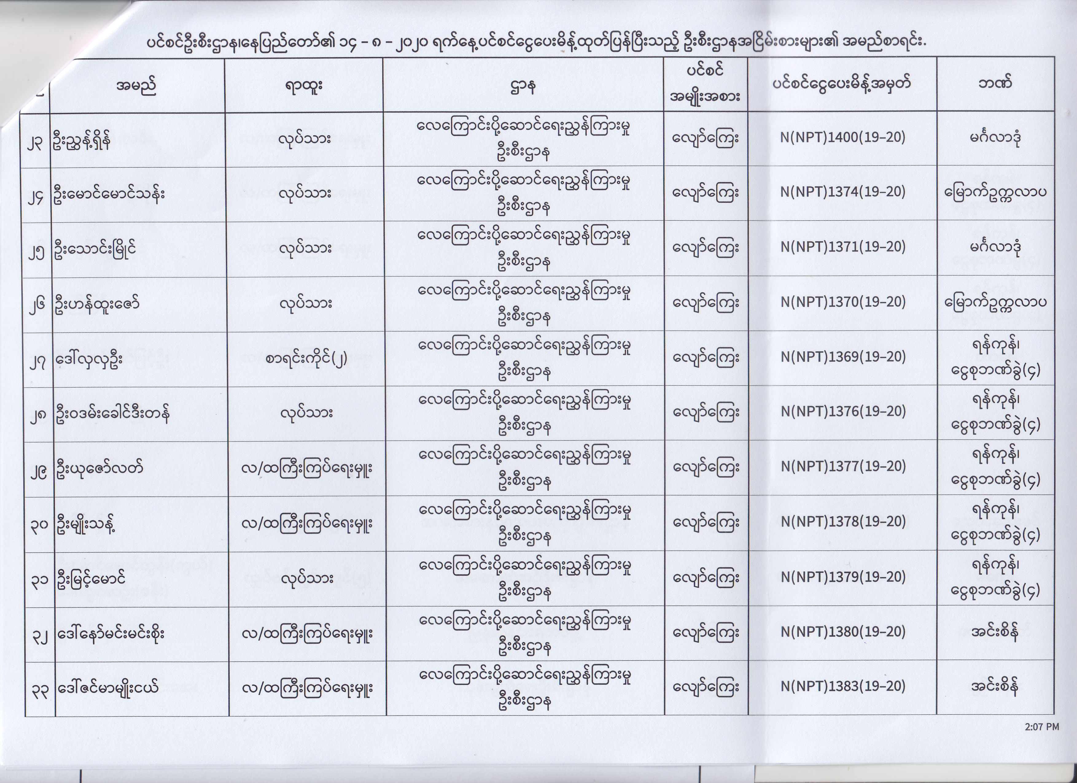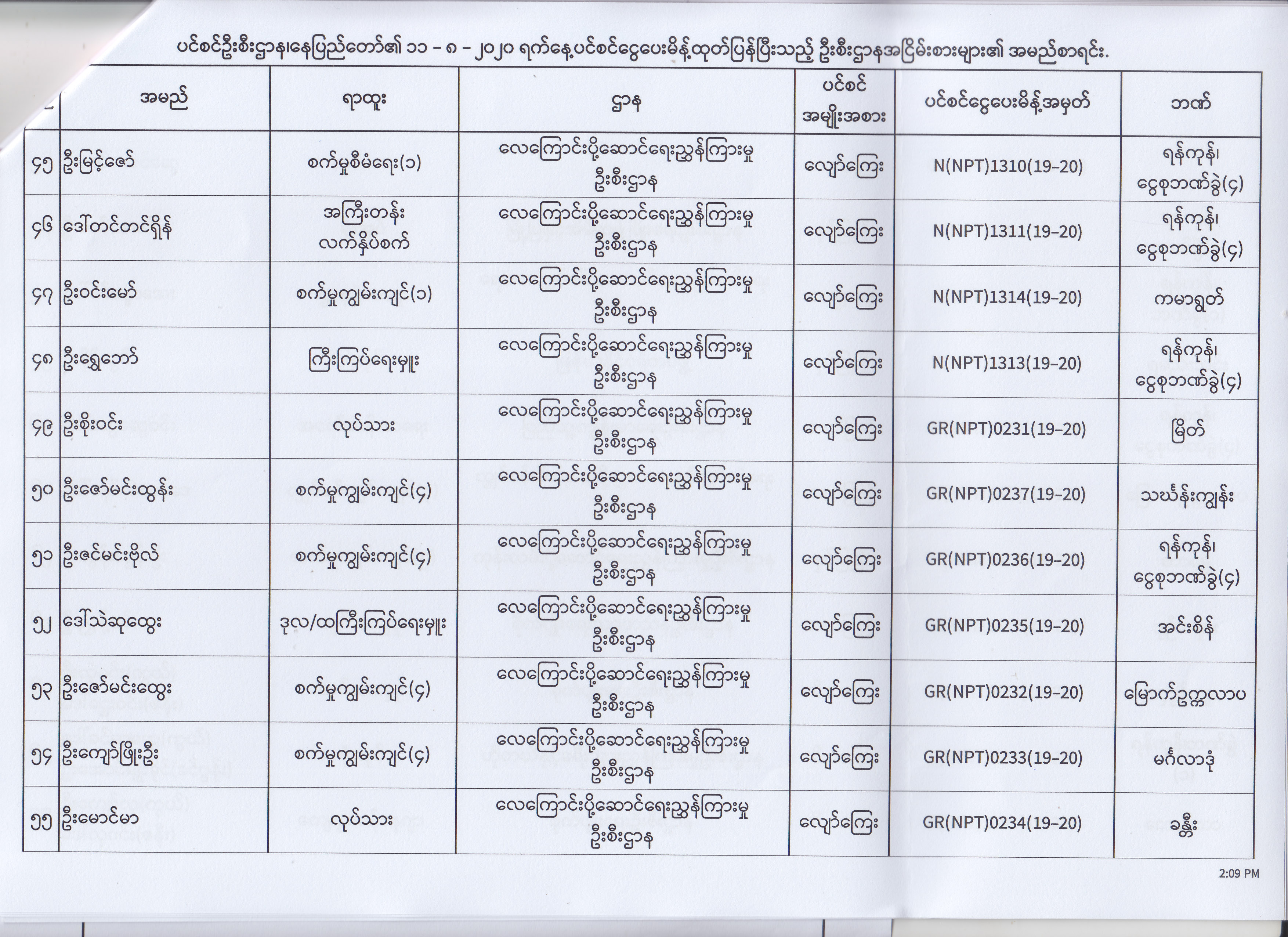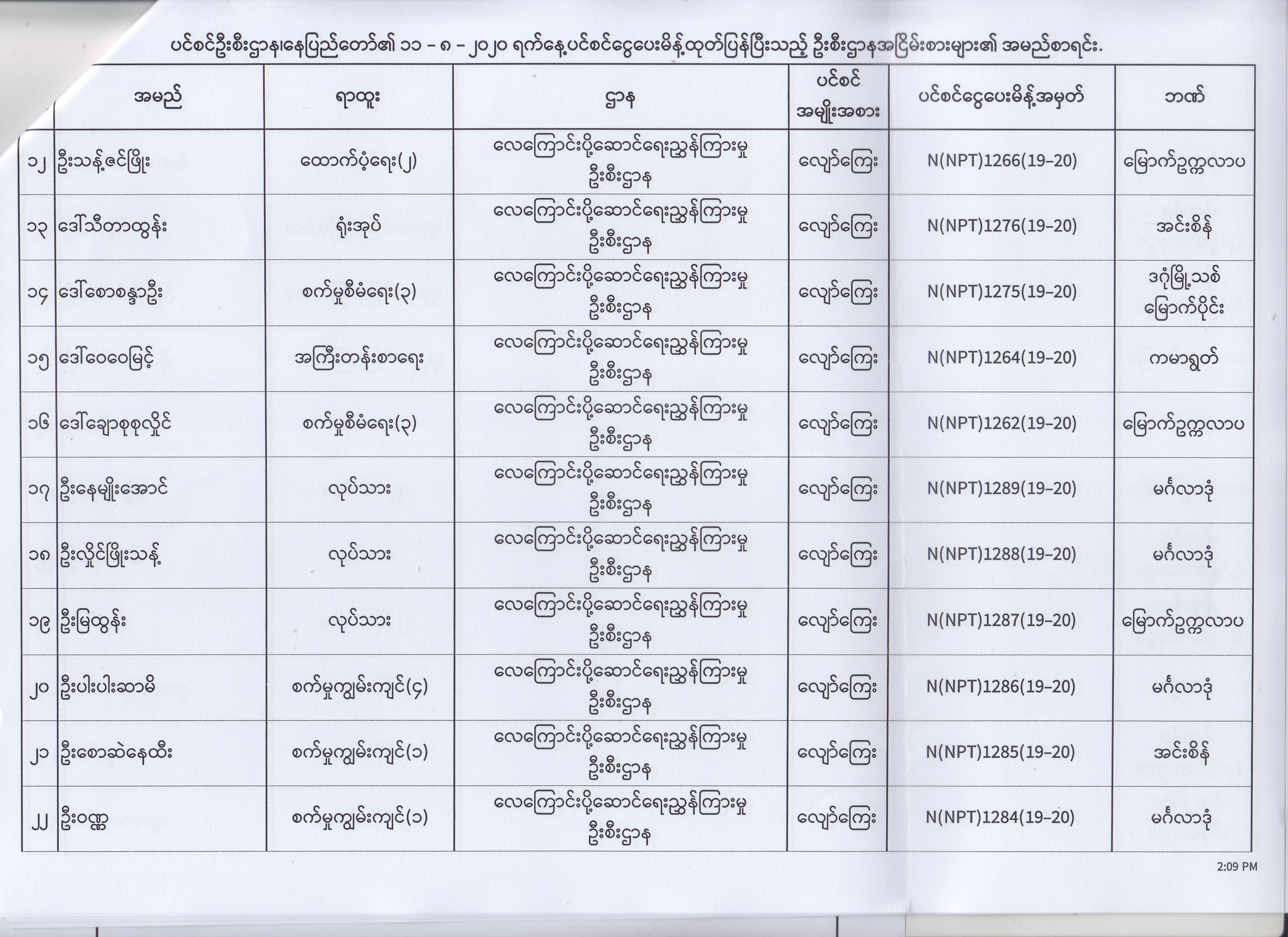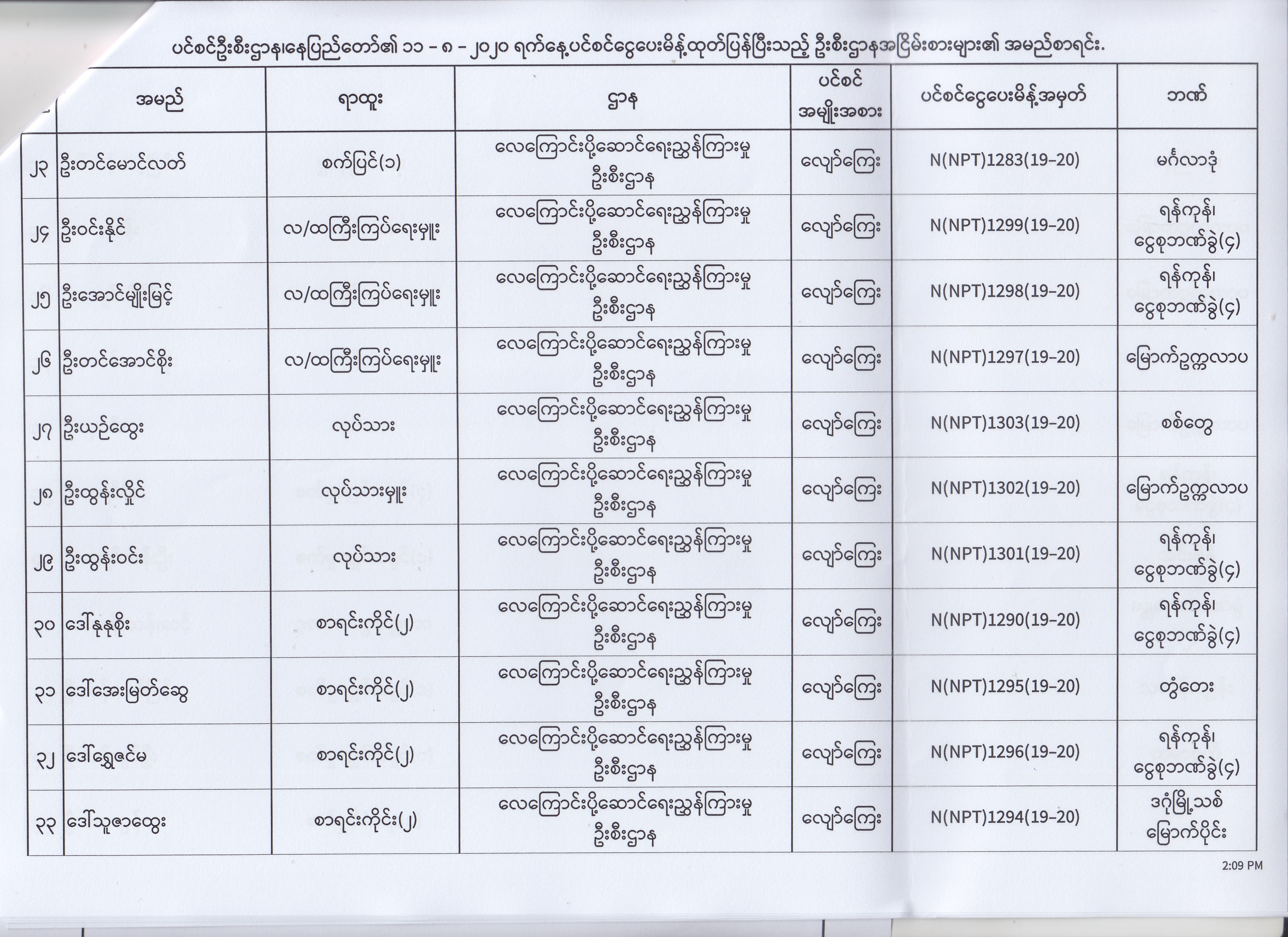 ပင်စင်ဦးစီးဌာန၊ နေပြည်တော်၏ (၁၀.၈.၂၀၂၀) မှ (၁၄.၈.၂၀၂၀) ရက်နေ့အထိ ပင်စင်ငွေပေးမိန့်ထုတ်ပြန်ပြီးသည့် ဦးစီးဌာနအငြိမ်းစားများ၏ အမည်စာရင်း