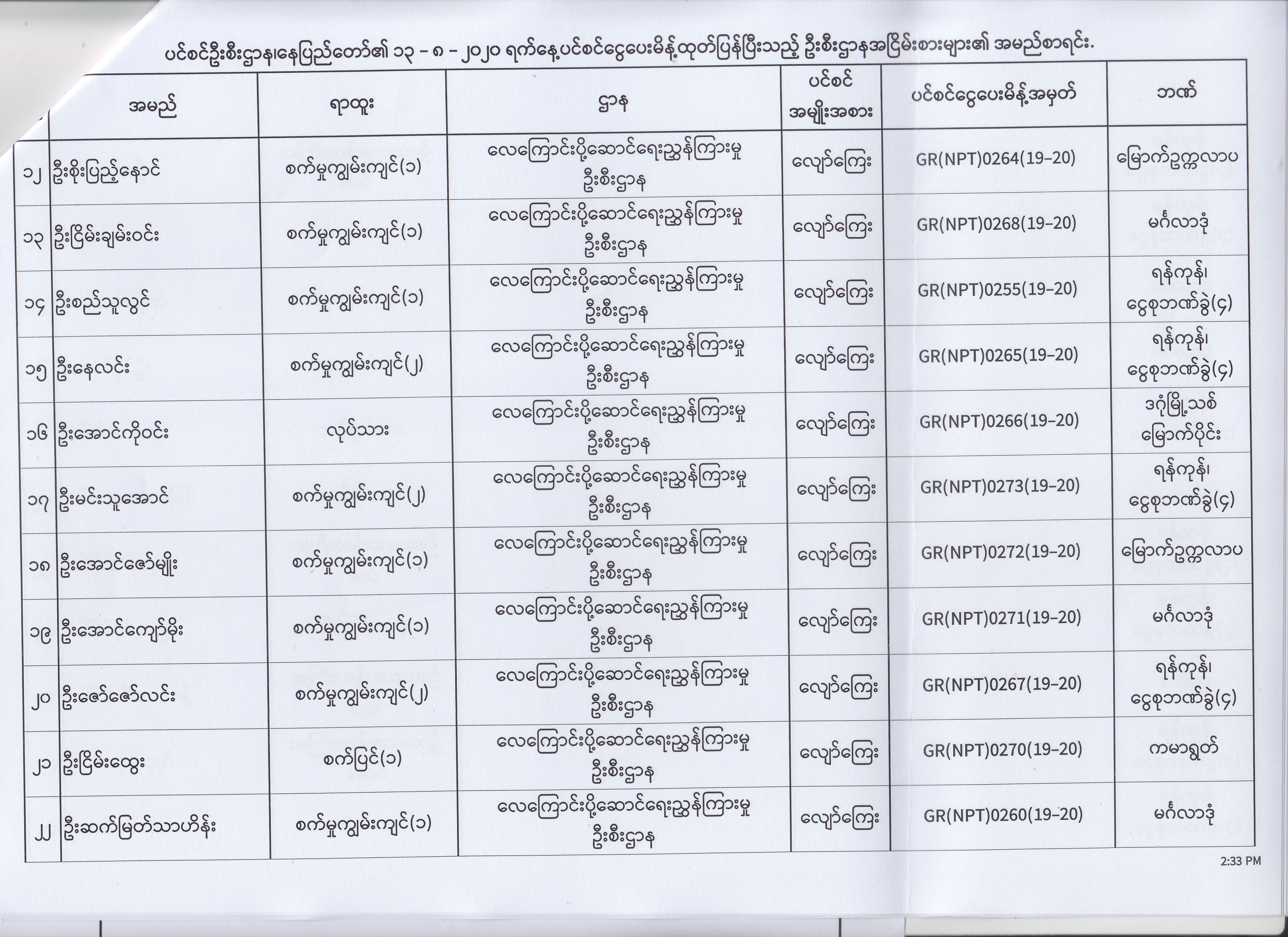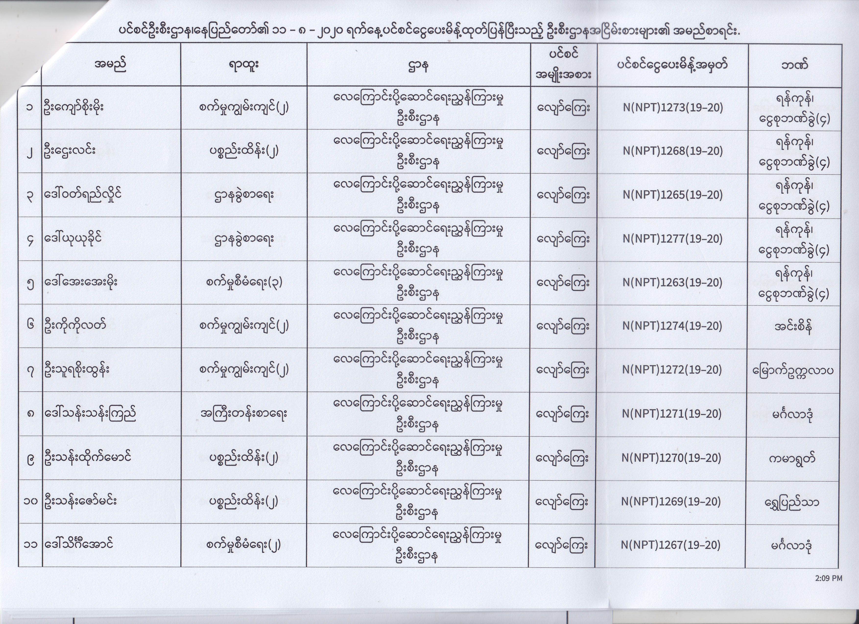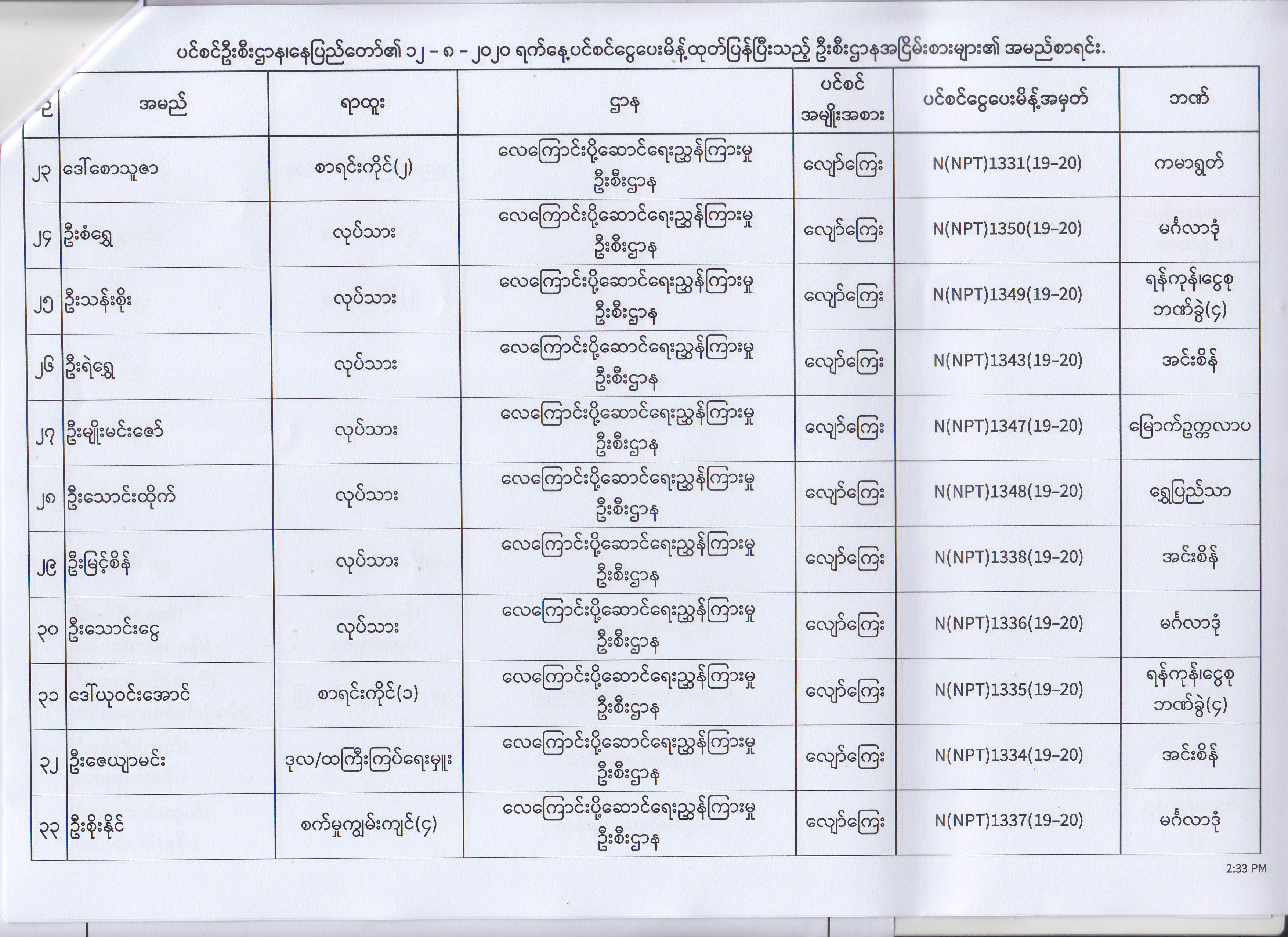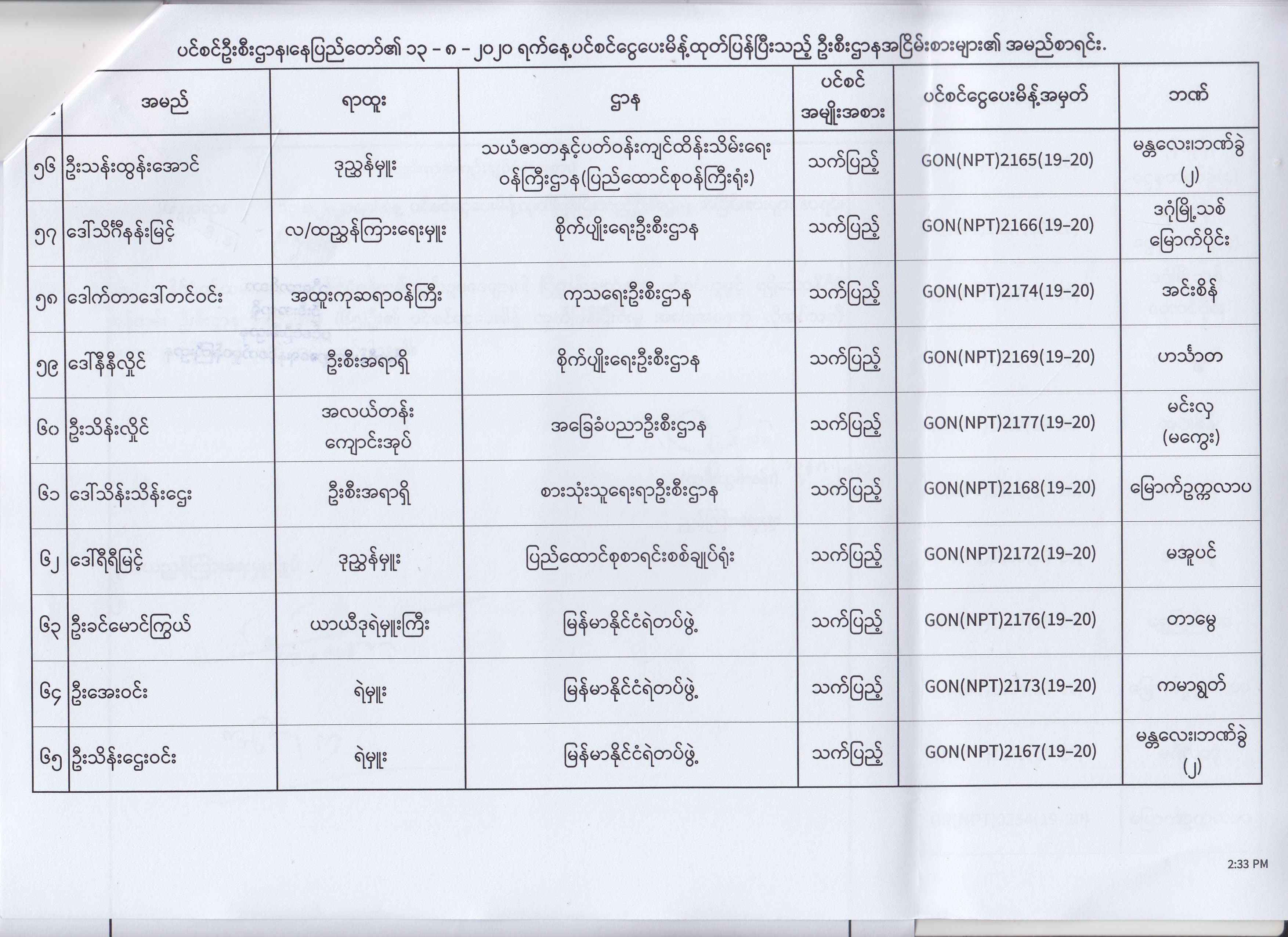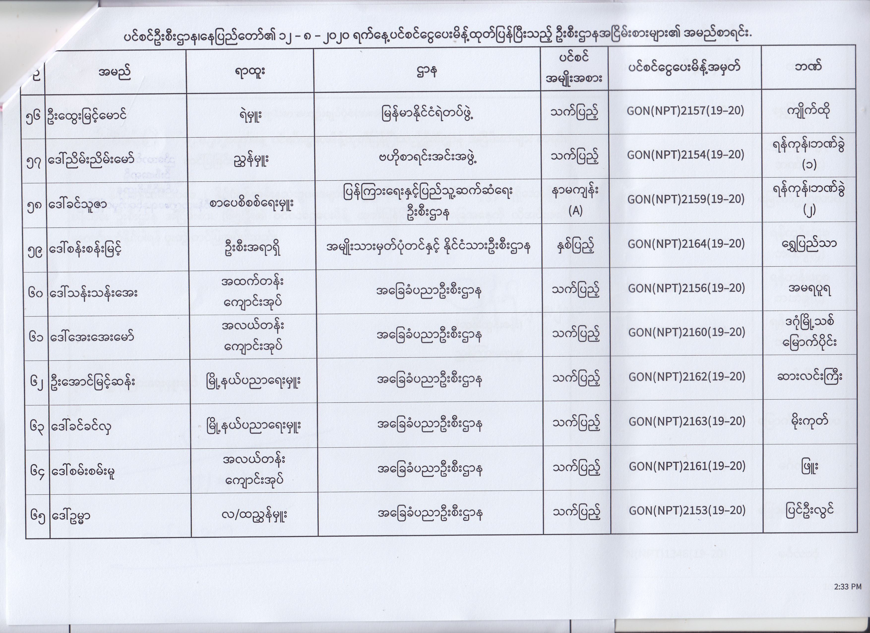 ပင်စင်ဦးစီးဌာန၊ နေပြည်တော်၏ (၁၀.၈.၂၀၂၀) မှ (၁၄.၈.၂၀၂၀) ရက်နေ့အထိ ပင်စင်ငွေပေးမိန့်ထုတ်ပြန်ပြီးသည့် ဦးစီးဌာနအငြိမ်းစားများ၏ အမည်စာရင်း