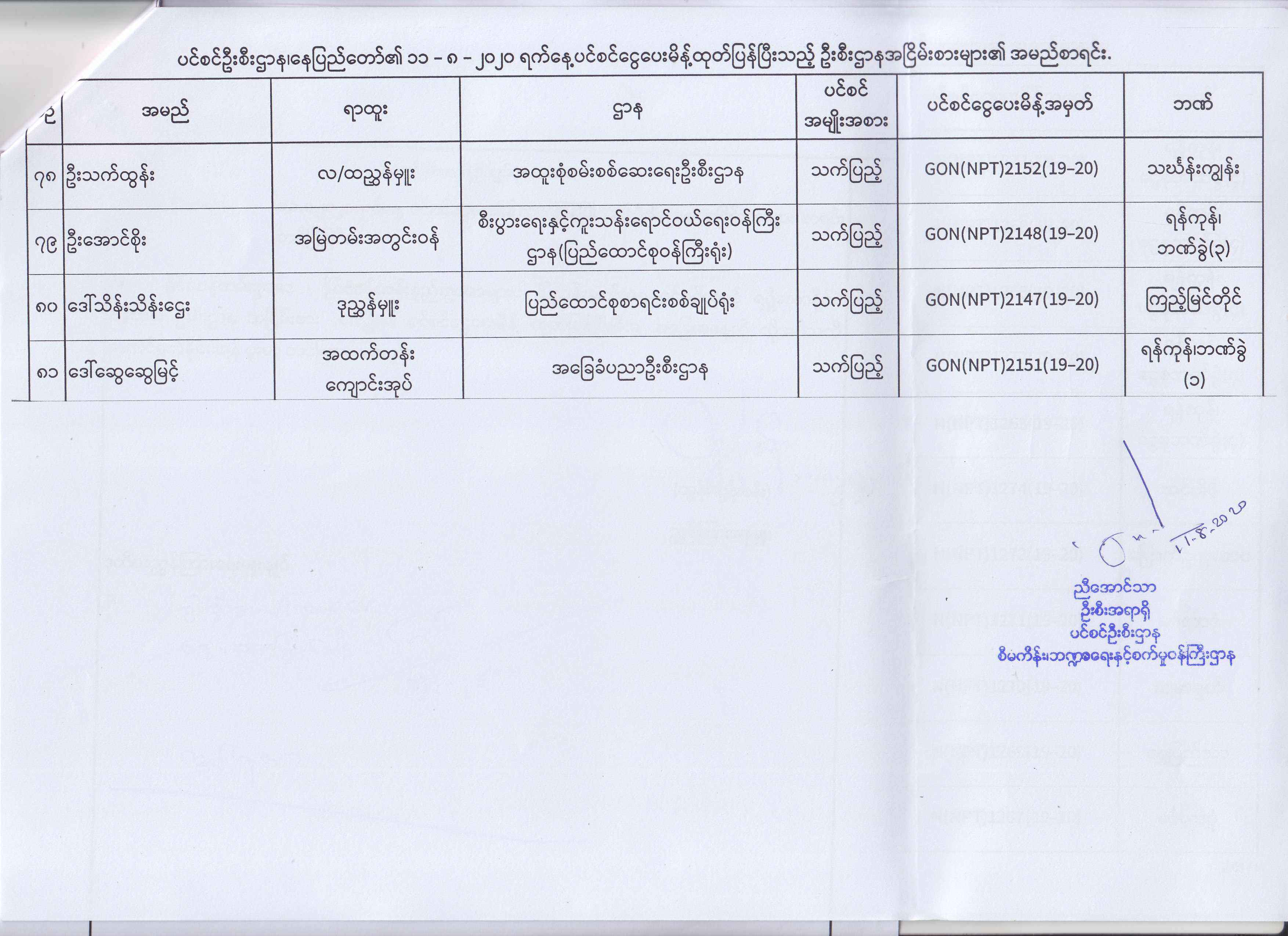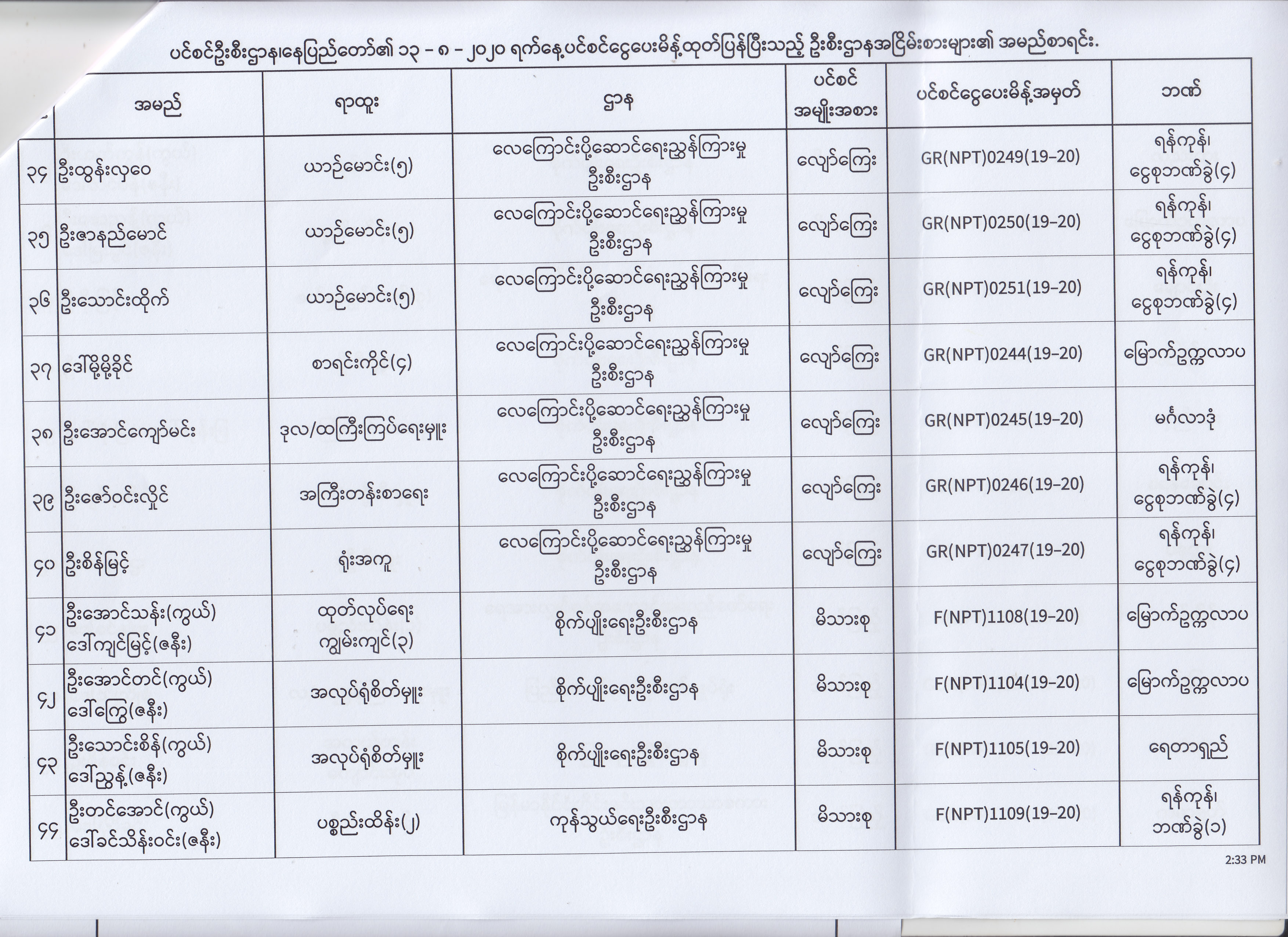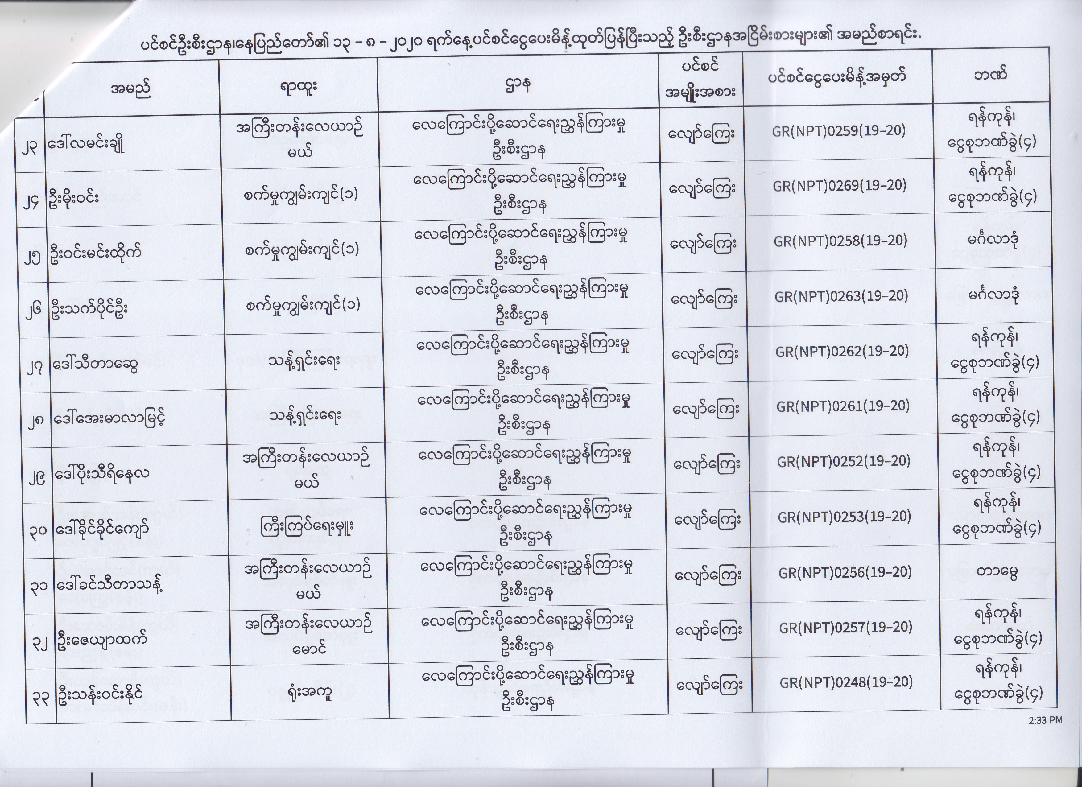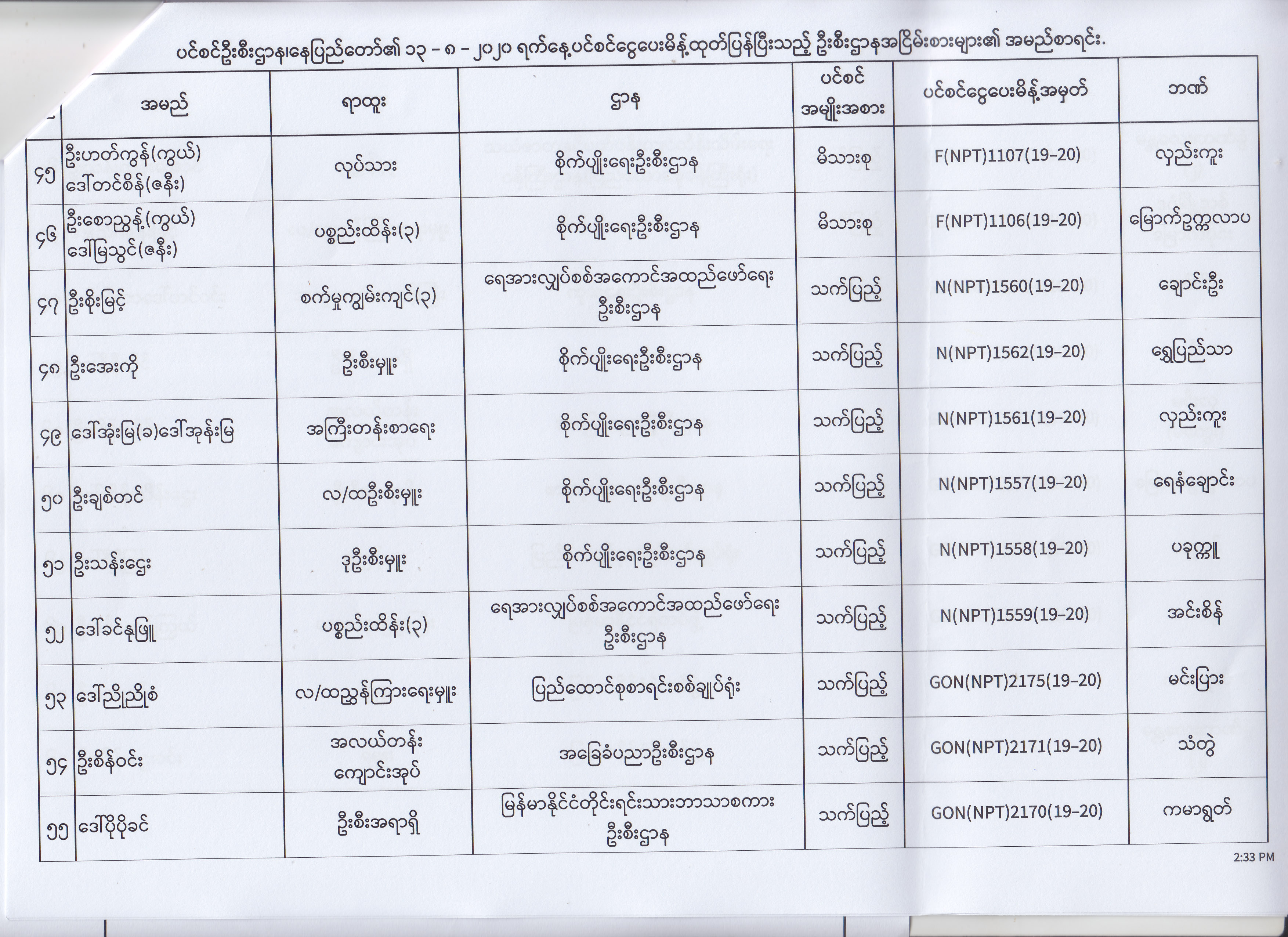 ပင်စင်ဦးစီးဌာန၊ နေပြည်တော်၏ (၁၀.၈.၂၀၂၀) မှ (၁၄.၈.၂၀၂၀) ရက်နေ့အထိ ပင်စင်ငွေပေးမိန့်ထုတ်ပြန်ပြီးသည့် ဦးစီးဌာနအငြိမ်းစားများ၏ အမည်စာရင်း