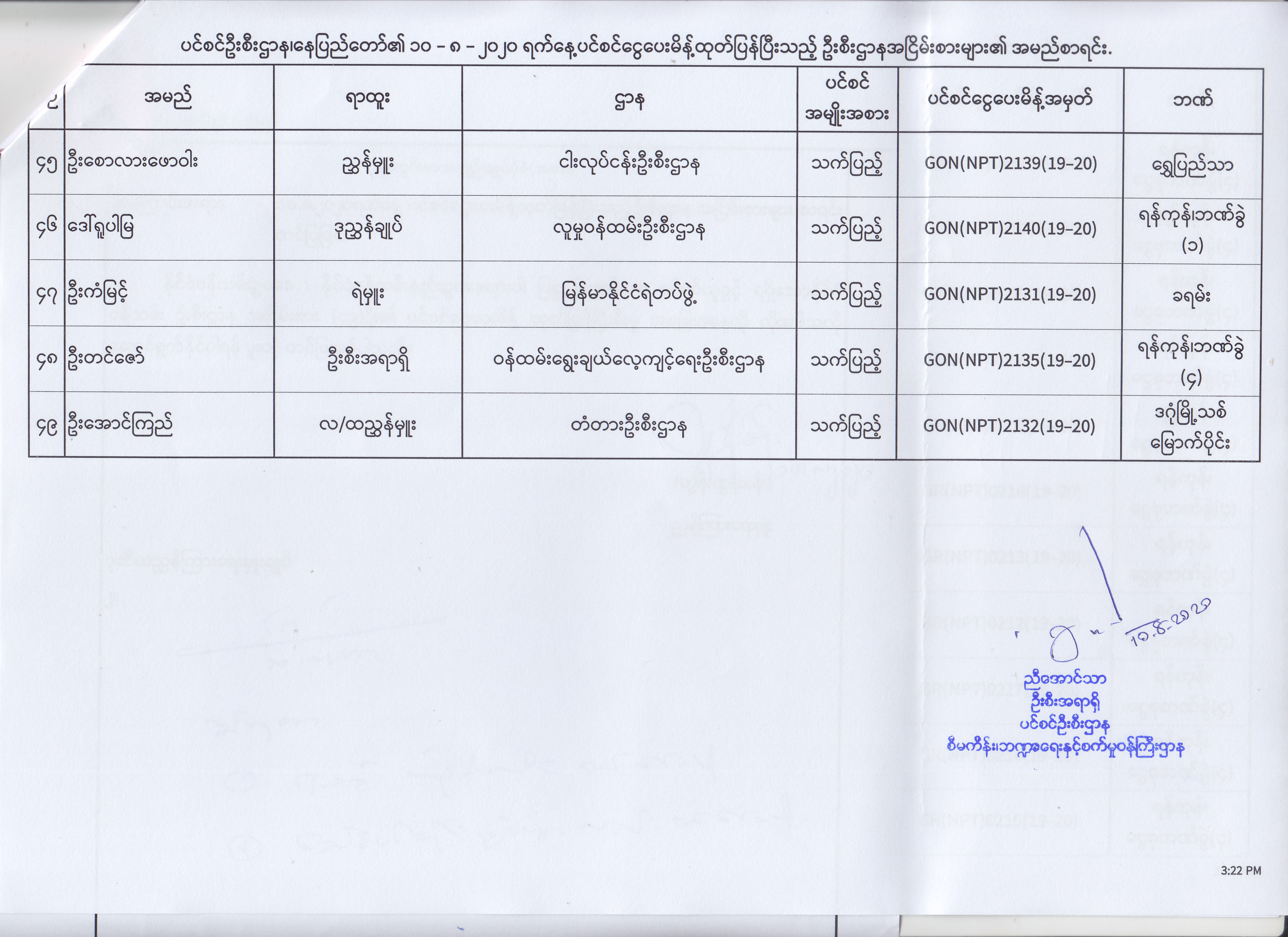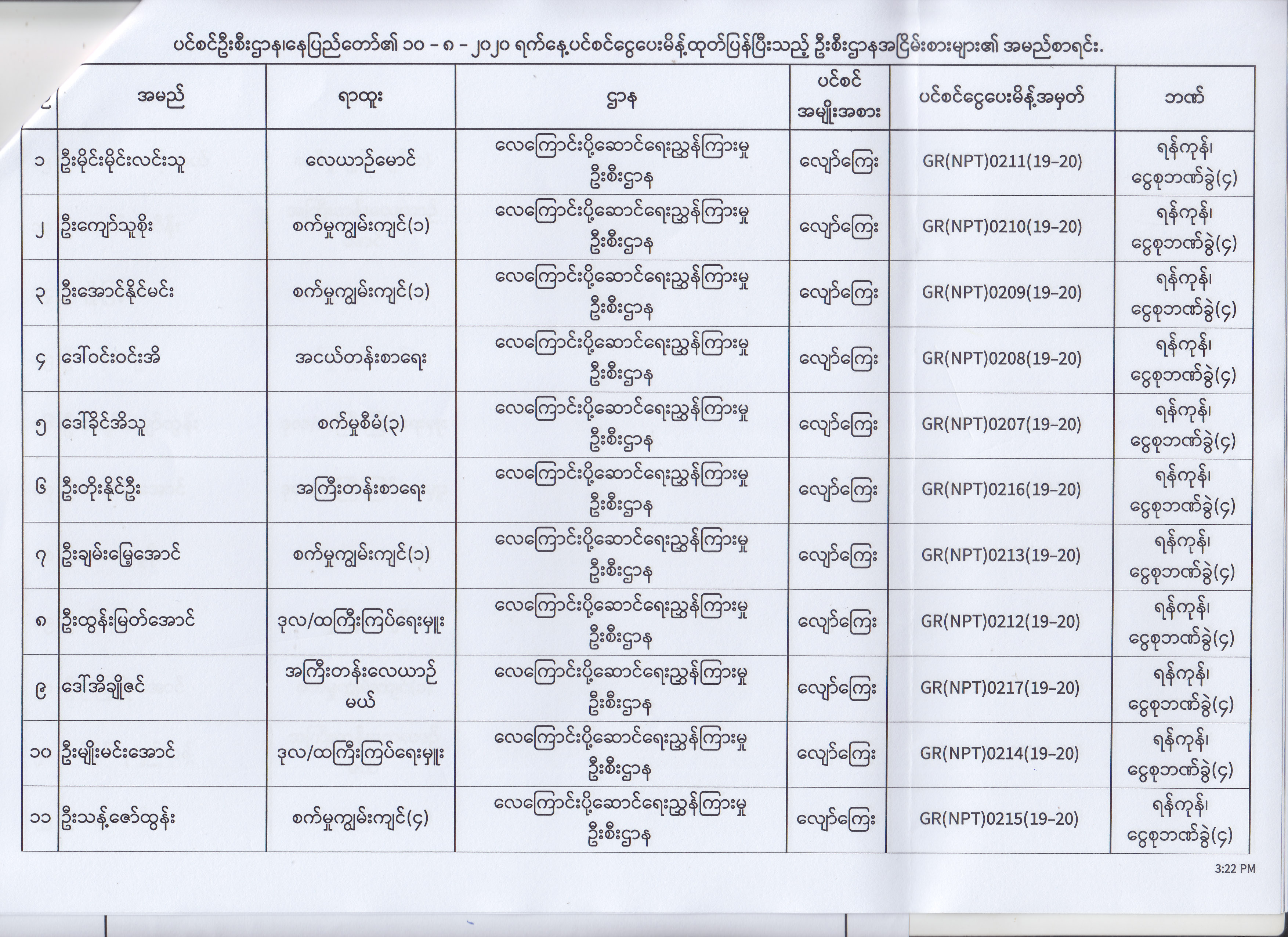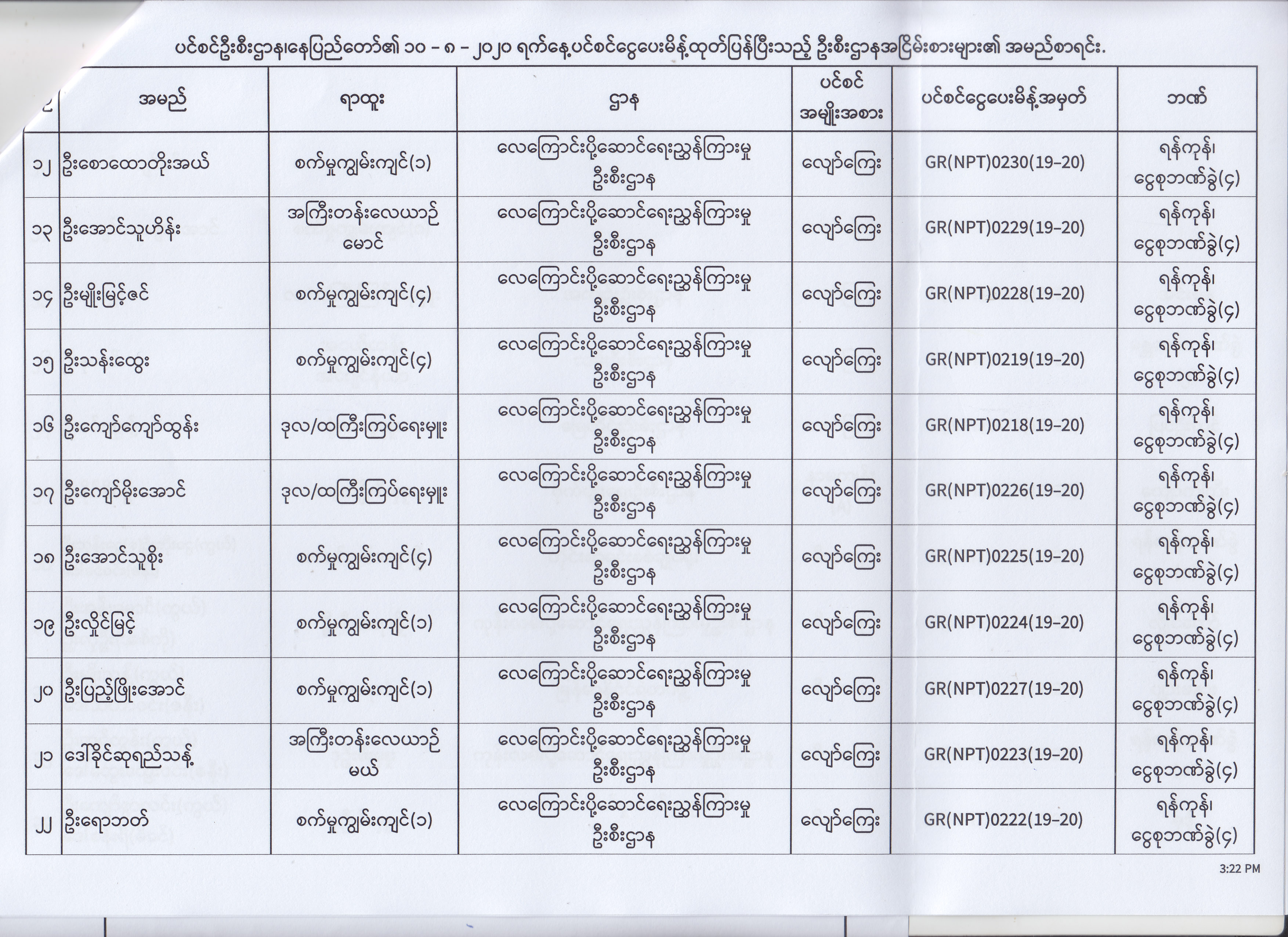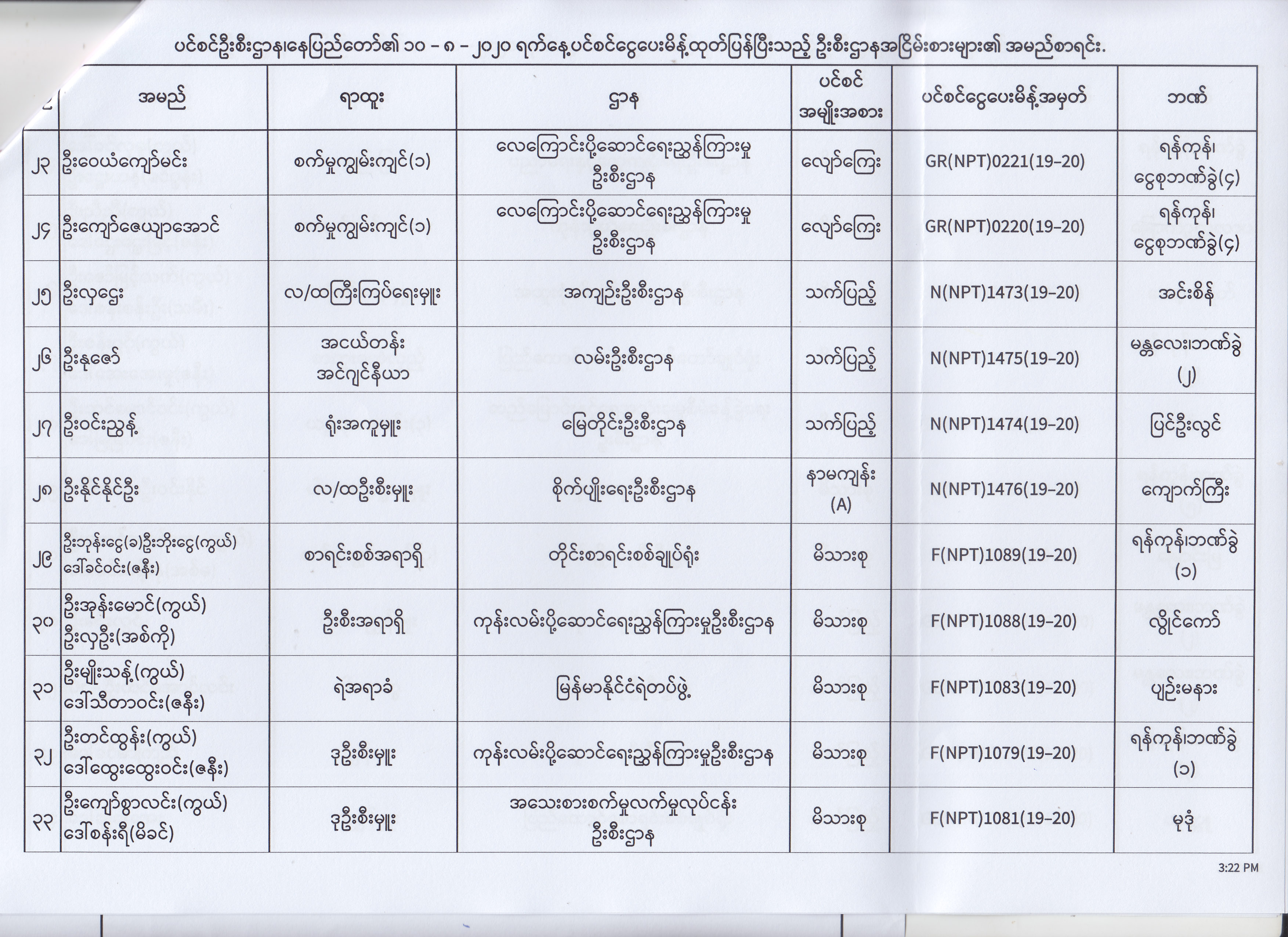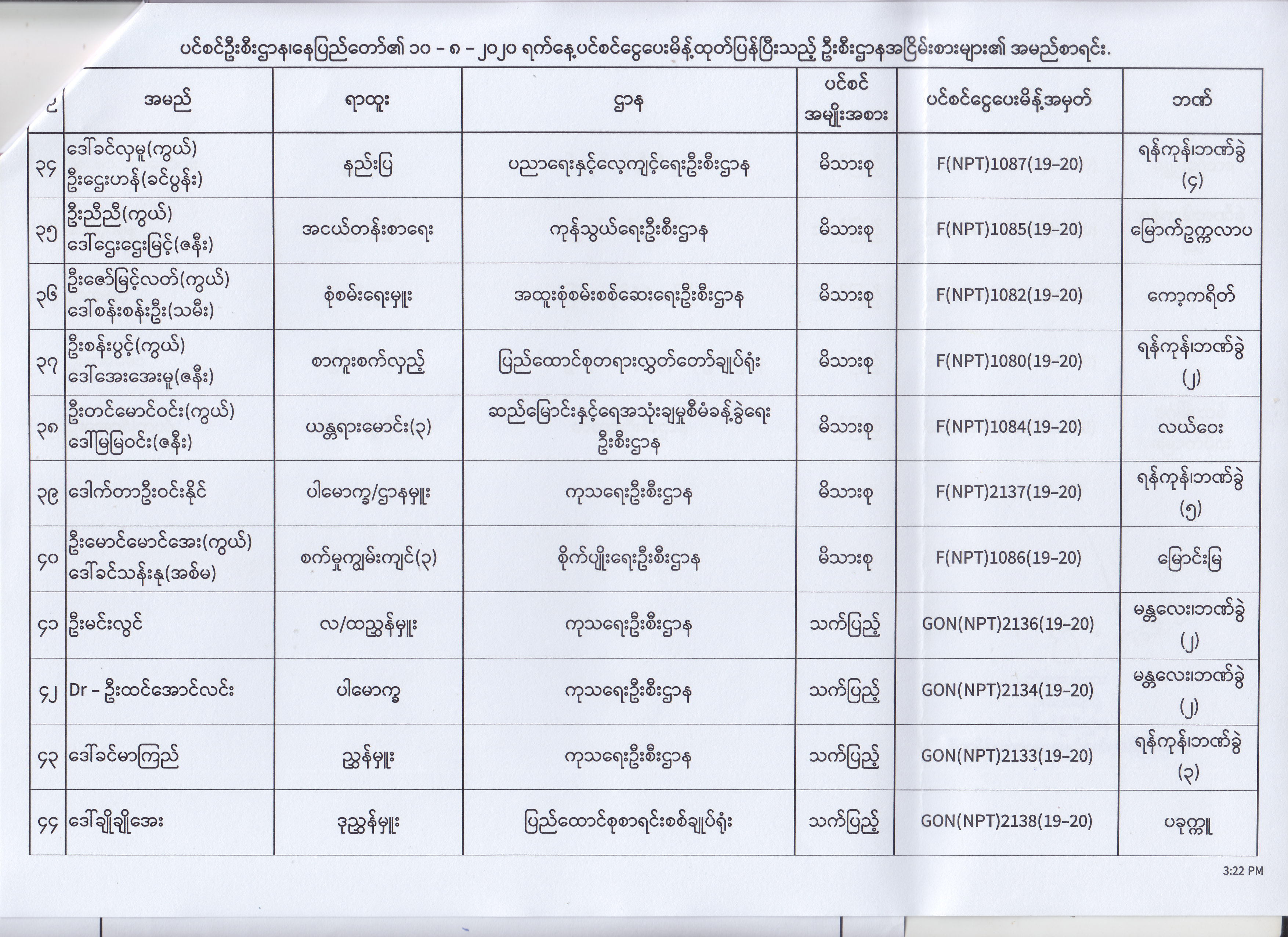 ပင်စင်ဦးစီးဌာန၊ နေပြည်တော်၏ (၁၀.၈.၂၀၂၀) မှ (၁၄.၈.၂၀၂၀) ရက်နေ့အထိ ပင်စင်ငွေပေးမိန့်ထုတ်ပြန်ပြီးသည့် ဦးစီးဌာနအငြိမ်းစားများ၏ အမည်စာရင်း