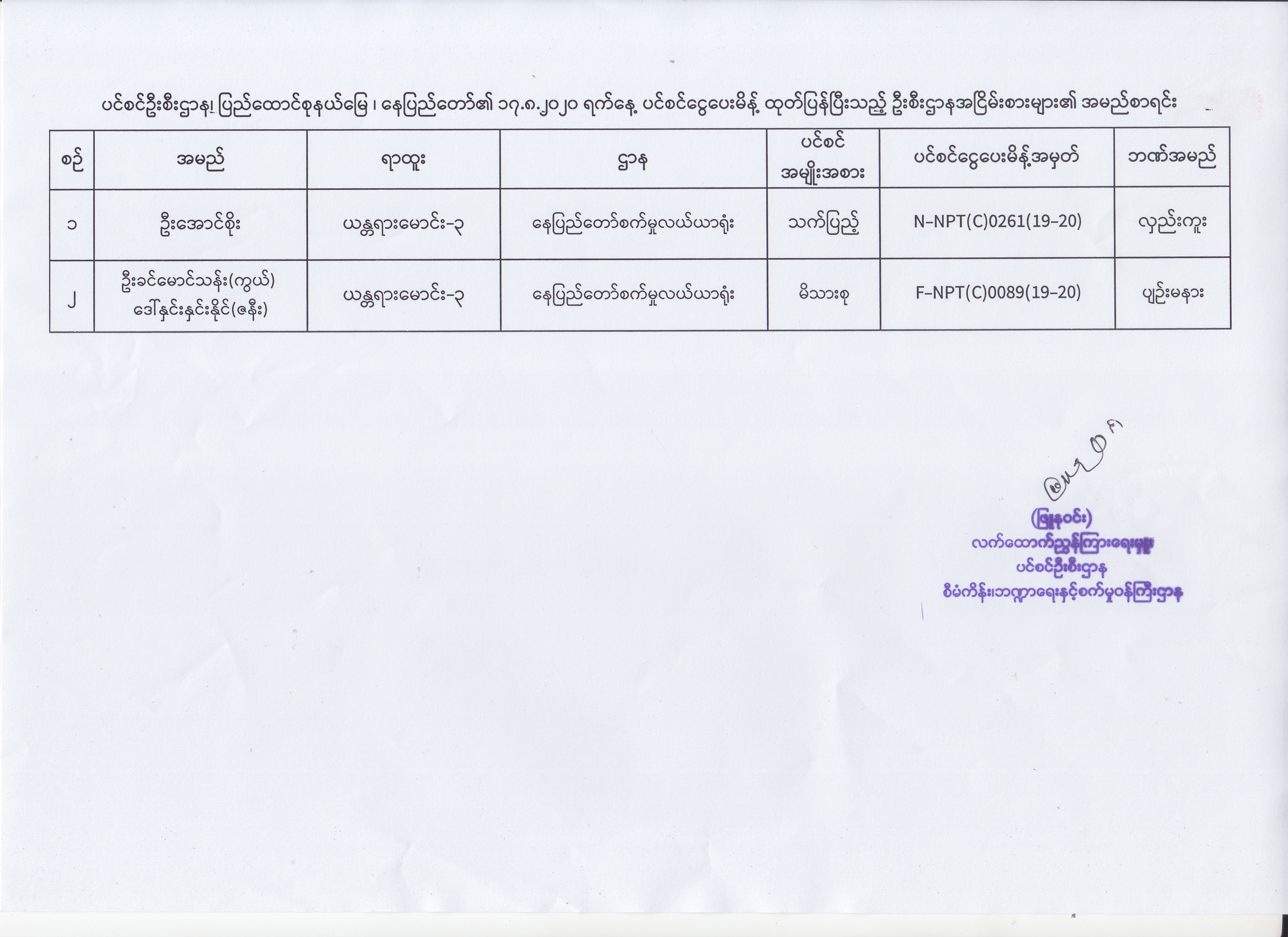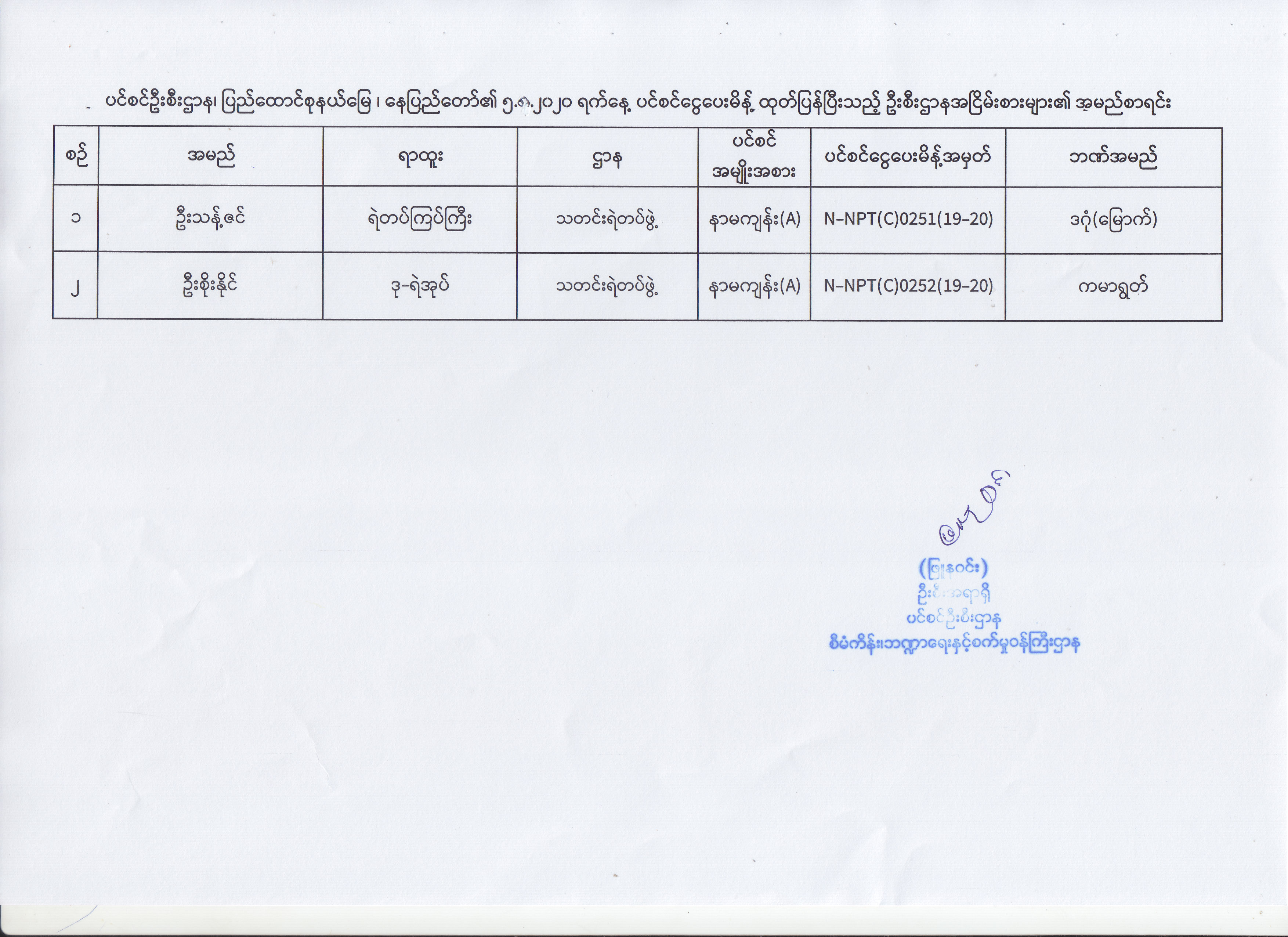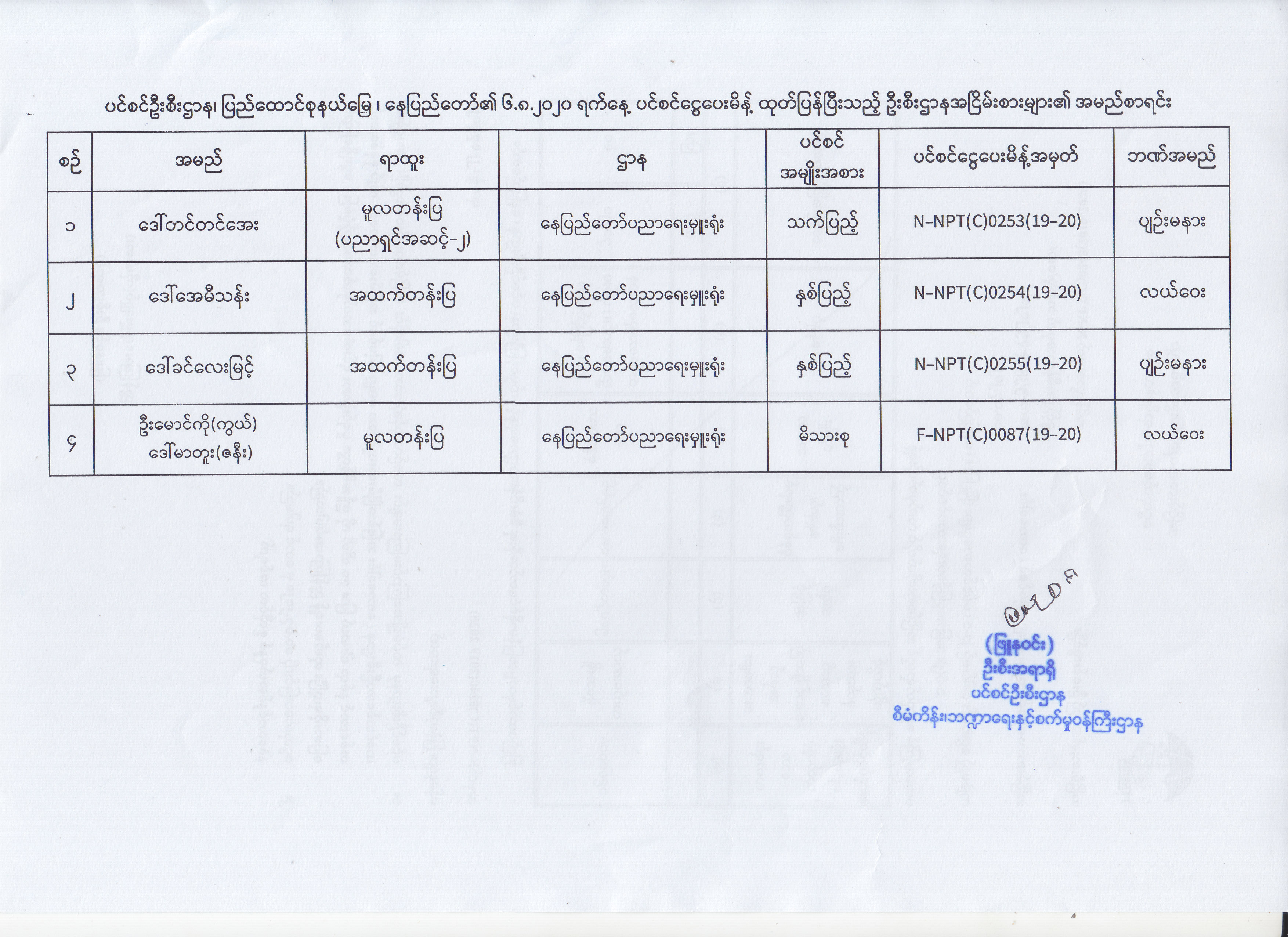 ပင်စင်ဦးစီးဌာန၊ နေပြည်တော်ကောင်စီနယ်မြေ၏ (၅.၈.၂၀၂၀) မှ (၂၇.၈.၂၀၂၀) ရက်နေ့အထိ ပင်စင်ငွေပေးမိန့်ထုတ်ပြန်ပြီးသည့် ဦးစီးဌာန အငြိမ်းစားများ၏ အမည်စာရင်း pdfinance_editor Thu, 09/03/2020 - 10:52