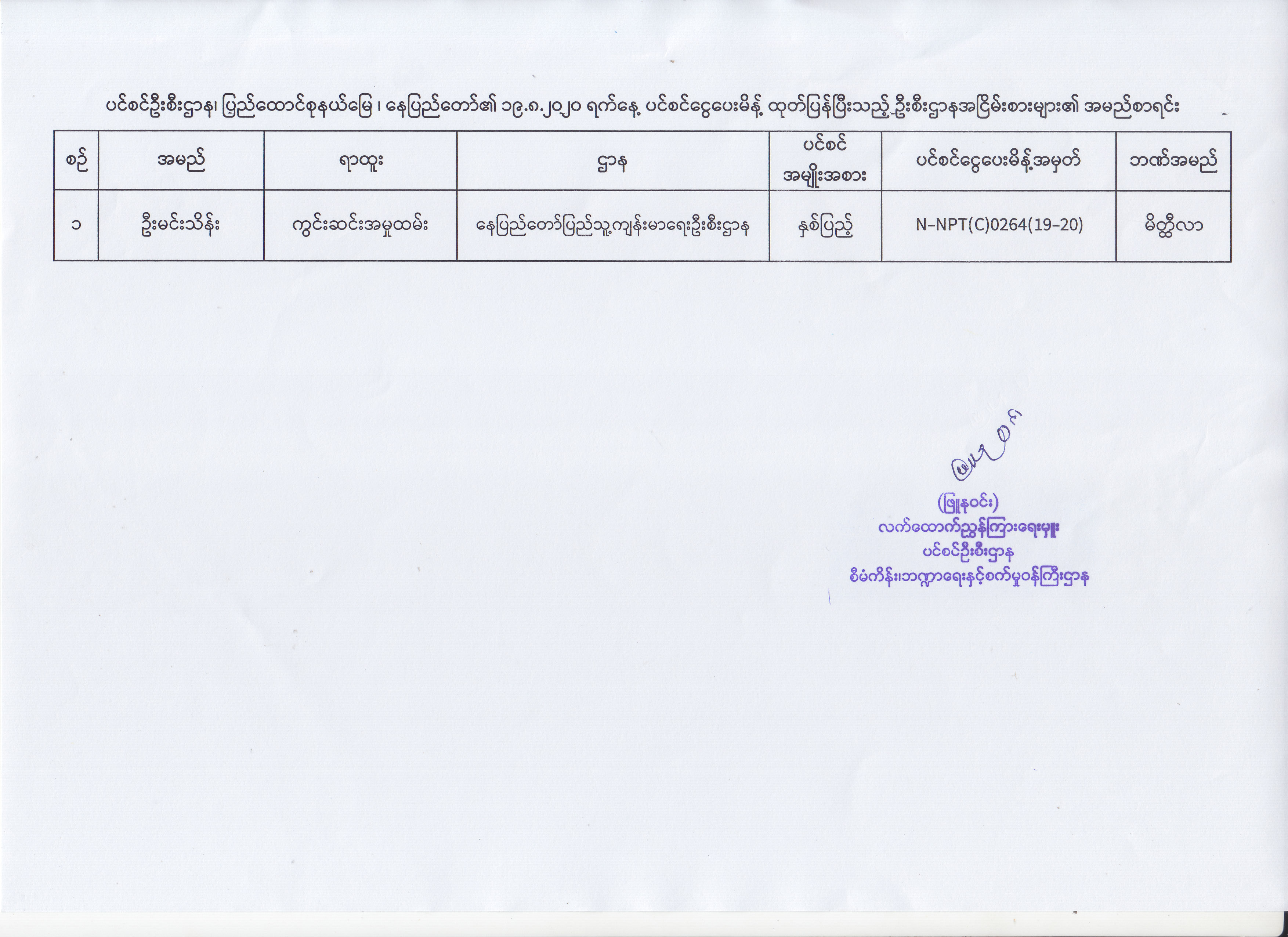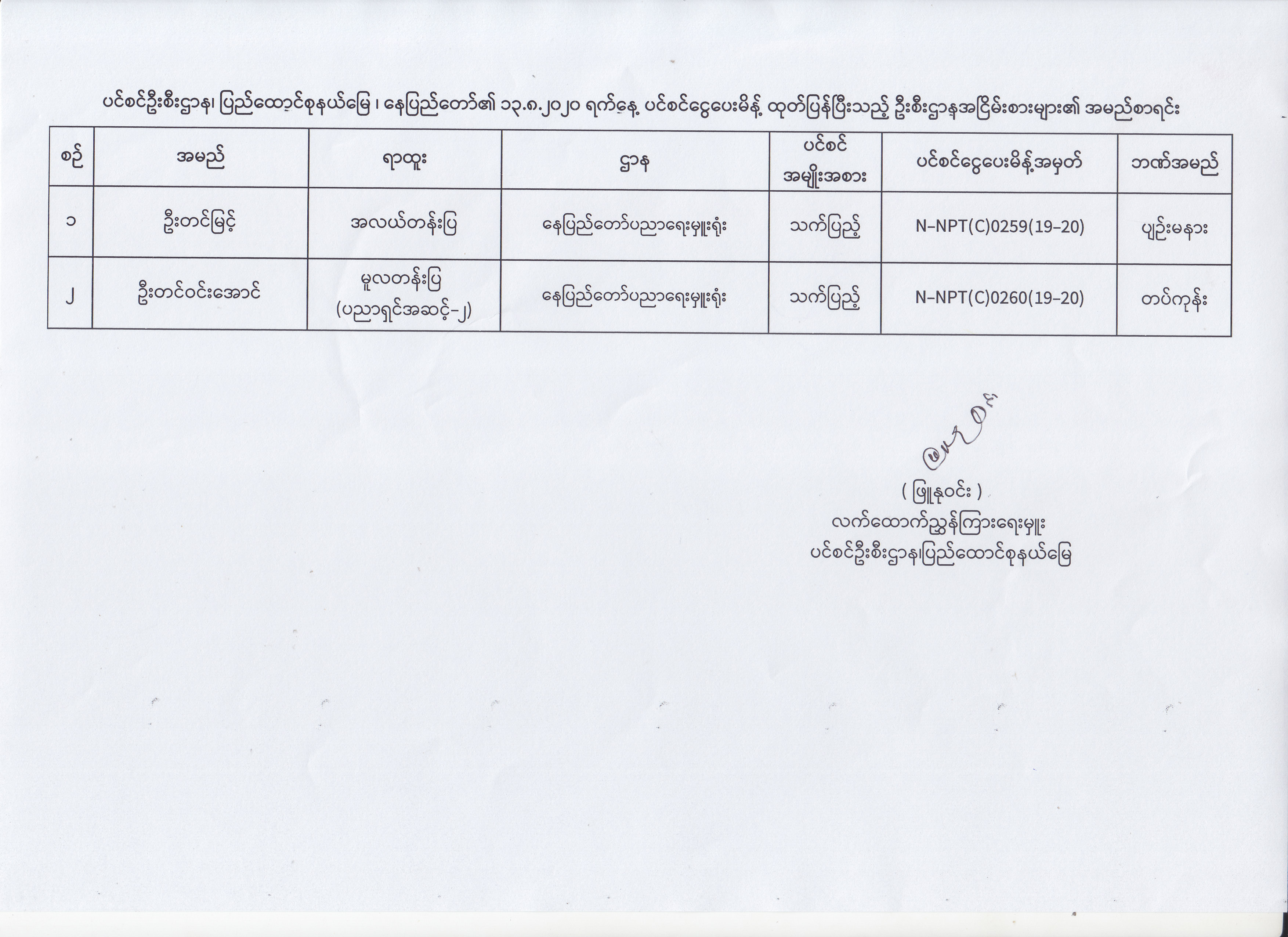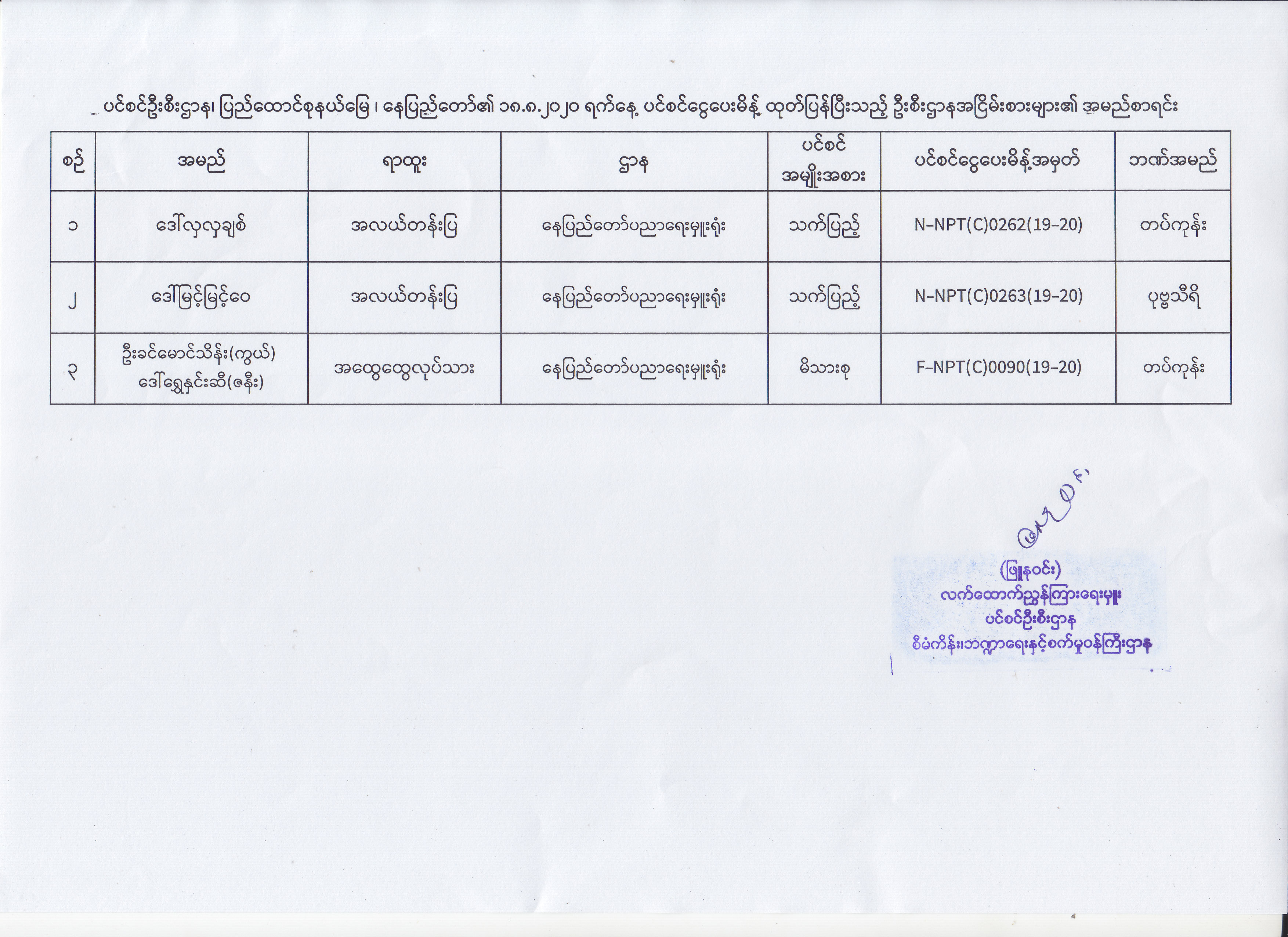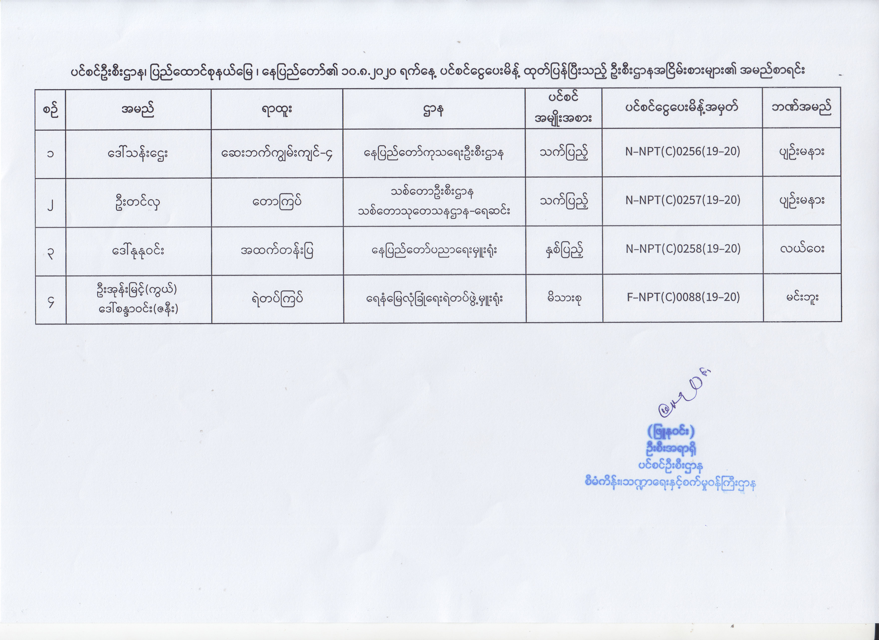 ပင်စင်ဦးစီးဌာန၊ နေပြည်တော်ကောင်စီနယ်မြေ၏ (၅.၈.၂၀၂၀) မှ (၂၇.၈.၂၀၂၀) ရက်နေ့အထိ ပင်စင်ငွေပေးမိန့်ထုတ်ပြန်ပြီးသည့် ဦးစီးဌာန အငြိမ်းစားများ၏ အမည်စာရင်း pdfinance_editor Thu, 09/03/2020 - 10:52