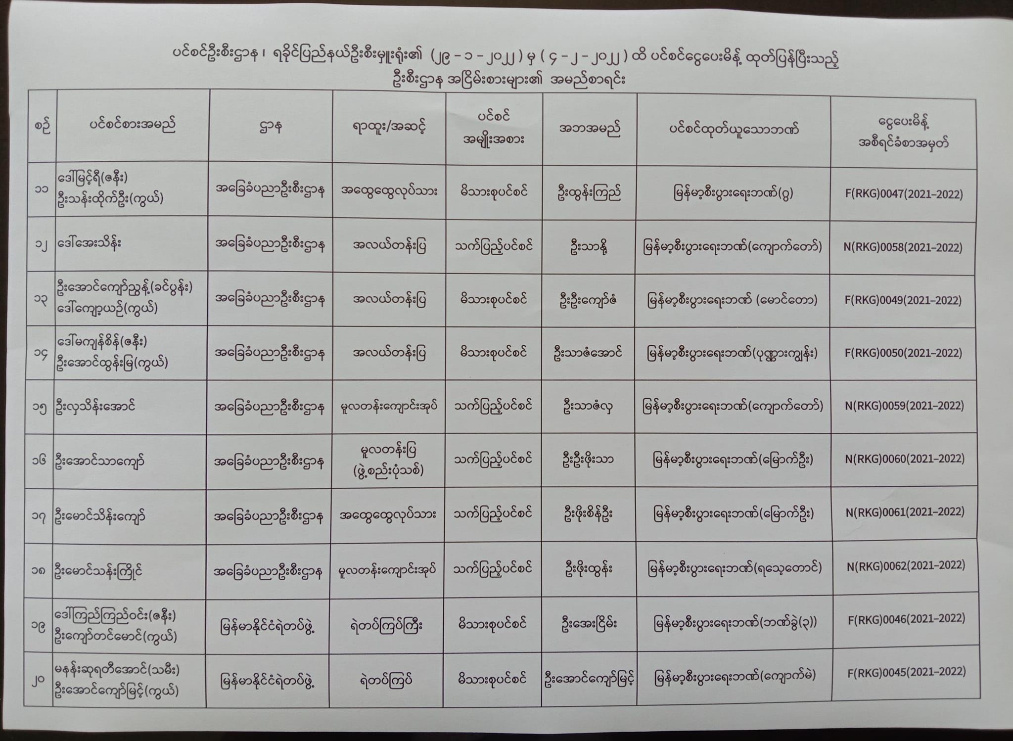 ပင်စင်ဦးစီးဌာန၊ ရခိုင်ပြည်နယ်ဦးစီးမှူးရုံး၏ ငွေပေးမိန့်ထုတ်ပြန်မှုစာရင်း (၂၉-၁-၂၀၂၂ မှ ၄-၂-၂၀၂၂)