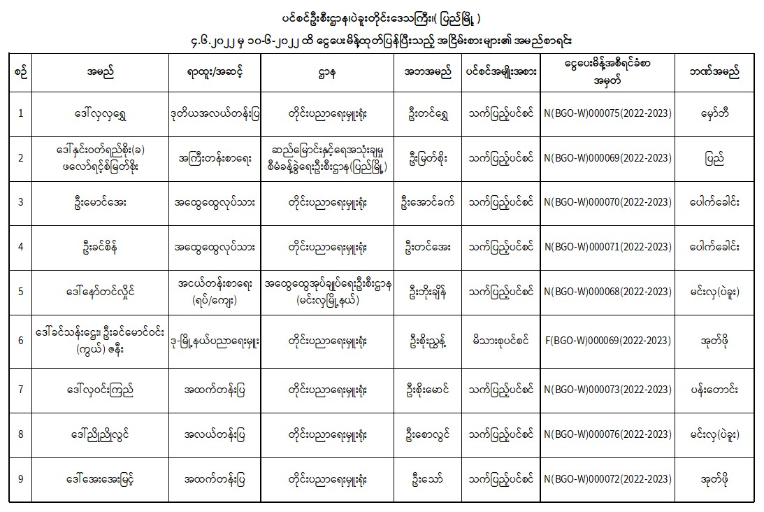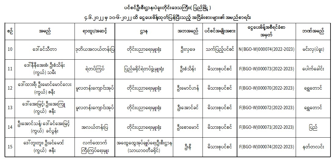 ပင်စင်ဦးစီးဌာန၊ ပဲခူးတိုင်းဒေသကြီး (ပြည်)၏ ငွေပေးမိန့်ထုတ်ပြန်မှုစာရင်း (၄-၆-၂၀၂၂ မှ ၁၀-၆-၂၀၂၂) pdfinance_editor Thu, 06/09/2022 - 15:53