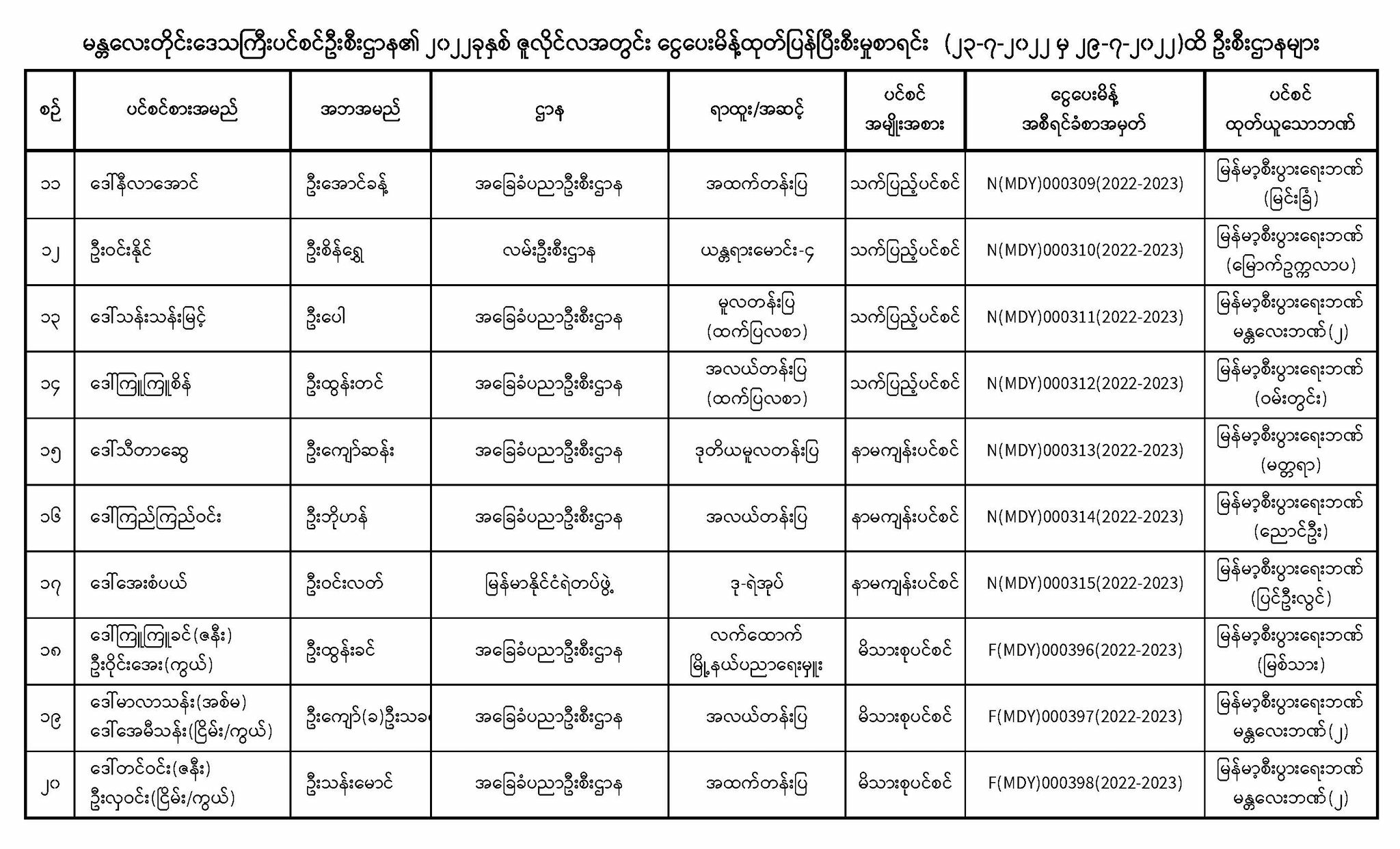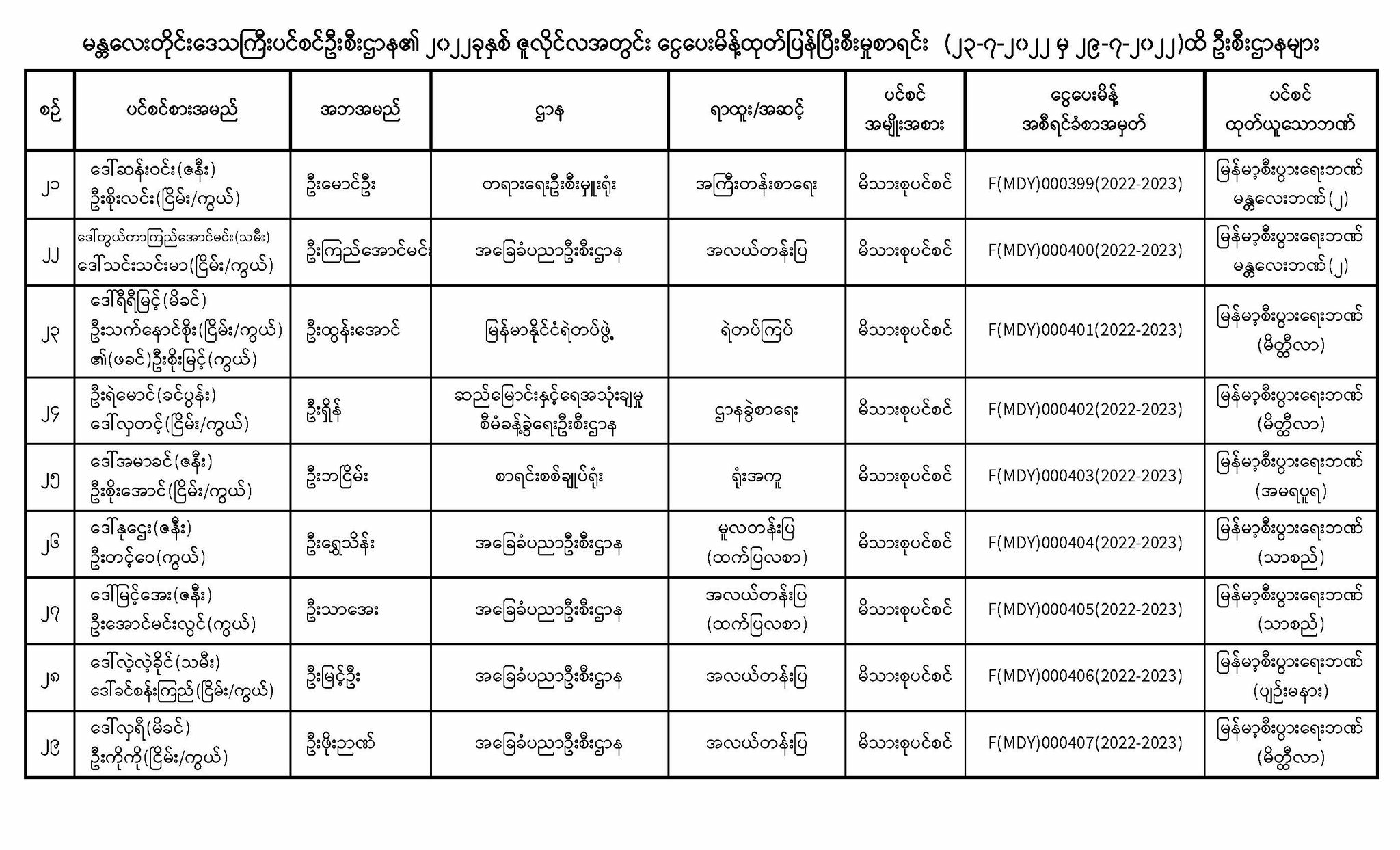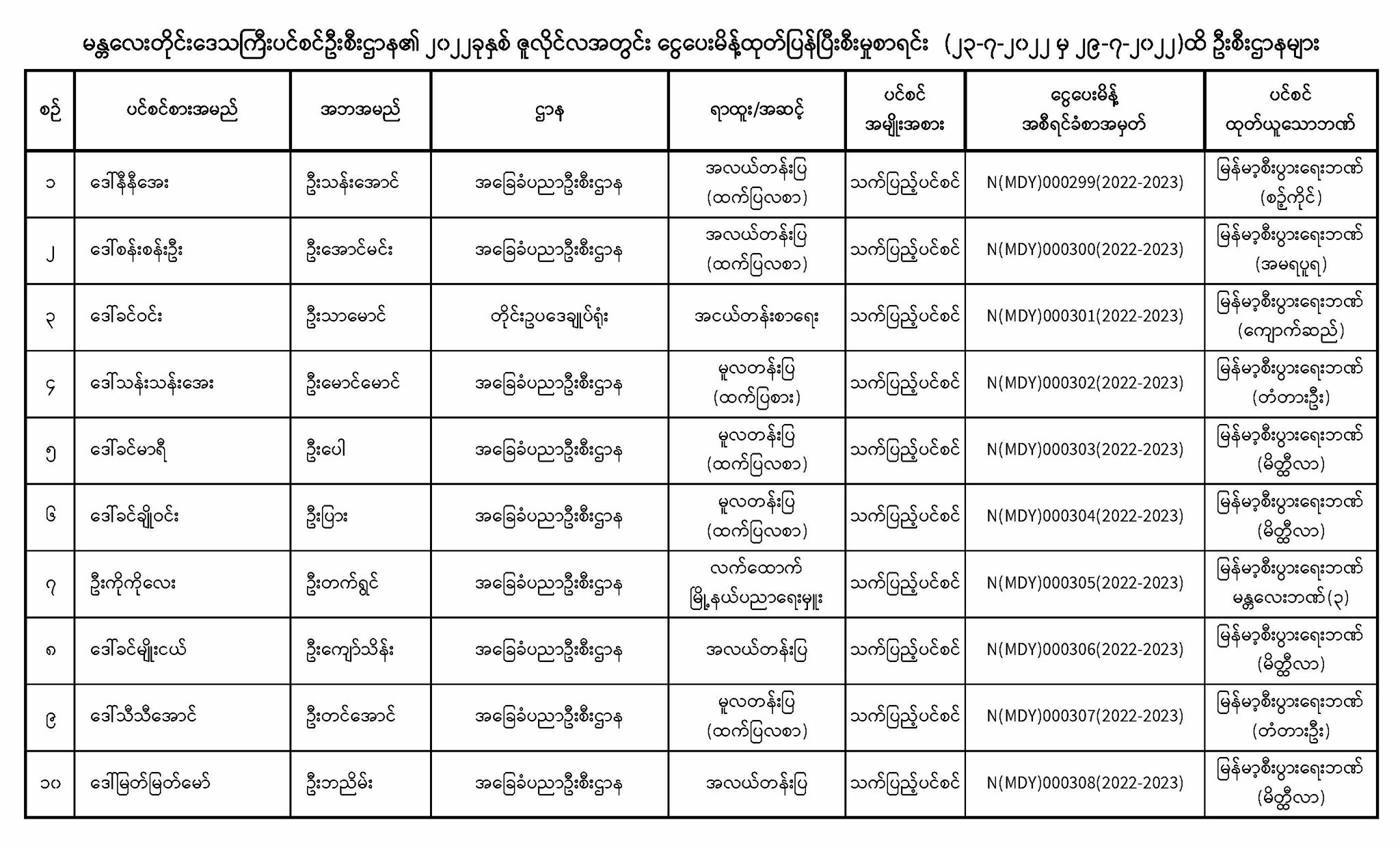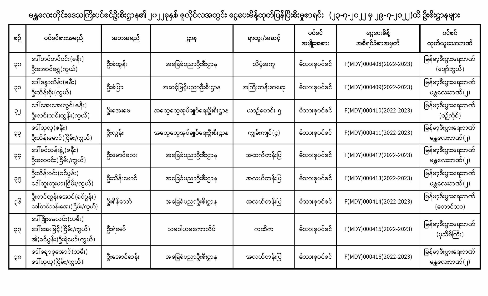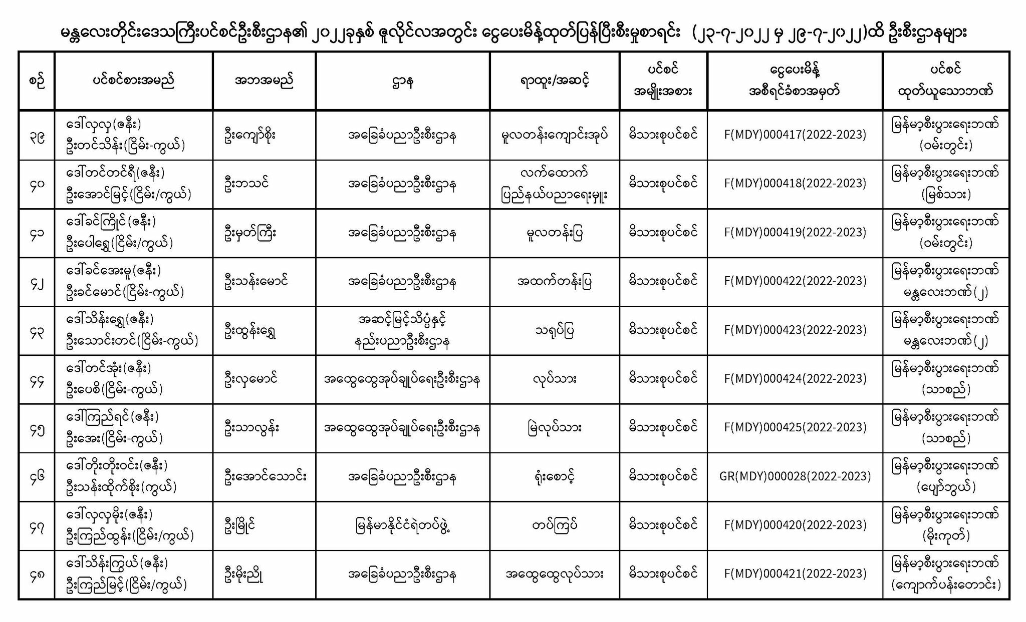ပင်စင်ဦးစီးဌာန၊မန္တလေးတိုင်းဒေသကြီး၏ငွေပေးမိန့်ထုတ်ပြန်မှုစာရင်း (၂၃-၇-၂၀၂၂ မှ ၂၉-၇-၂၀၂၂) pdfinance_editor Mon, 08/01/2022 - 13:46
