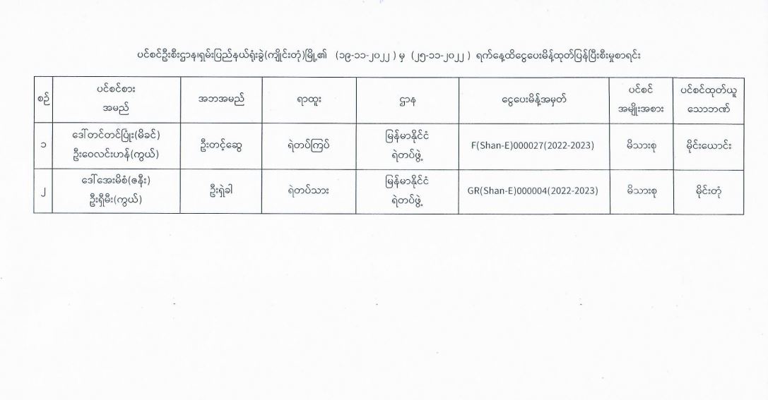ပင်စင်ဦးစီးဌာန၊ ရှမ်းပြည်နယ်ရုံးခွဲ(ကျိုင်းတုံမြို့)၏ ငွေပေးမိန့်ထုတ်ပြန်မှုစာရင်း (၁၉-၁၁-၂၀၂၂ မှ ၂၅-၁၁-၂၀၂၂) pdfinance_editor Fri, 11/25/2022 - 14:42