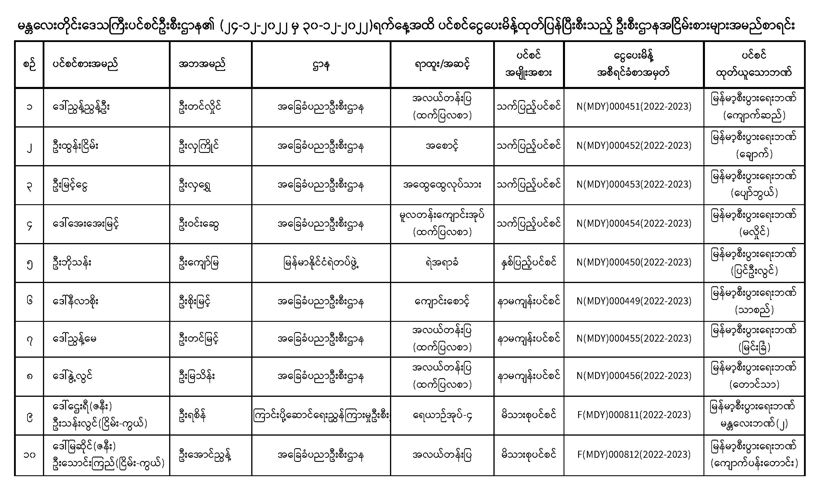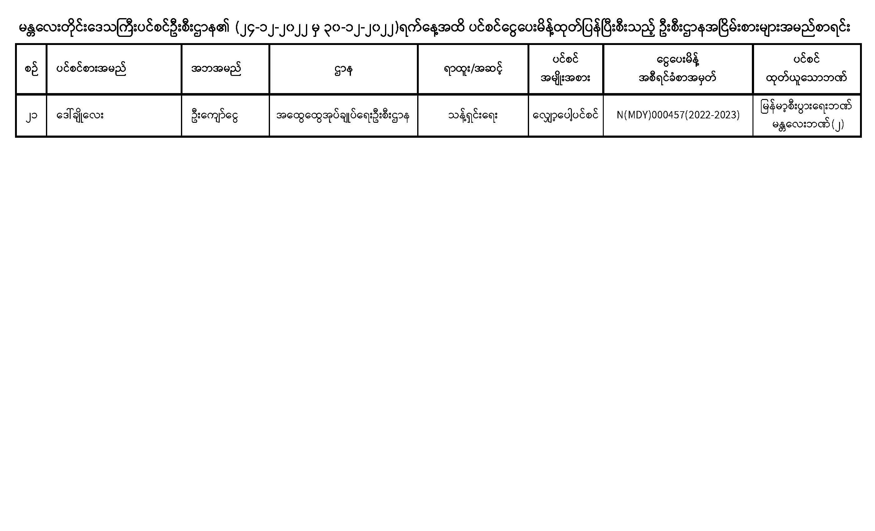 မန္တလေးတိုင်းဒေသကြီးပင်စင်ဦးစီးဌာန၏ (၂၄-၁၂-၂၀၂၂ မှ ၃၀-၁၂-၂၀၂၂)ရက်နေ့အထိ ပင်စင်ငွေပေးမိန့်ထုတ်ပြန်ပြီးစီးသည့် ဦးစီးဌာနအငြိမ်းစားများအမည်စာရင်း pdfinance_editor Mon, 01/02/2023 - 11:19