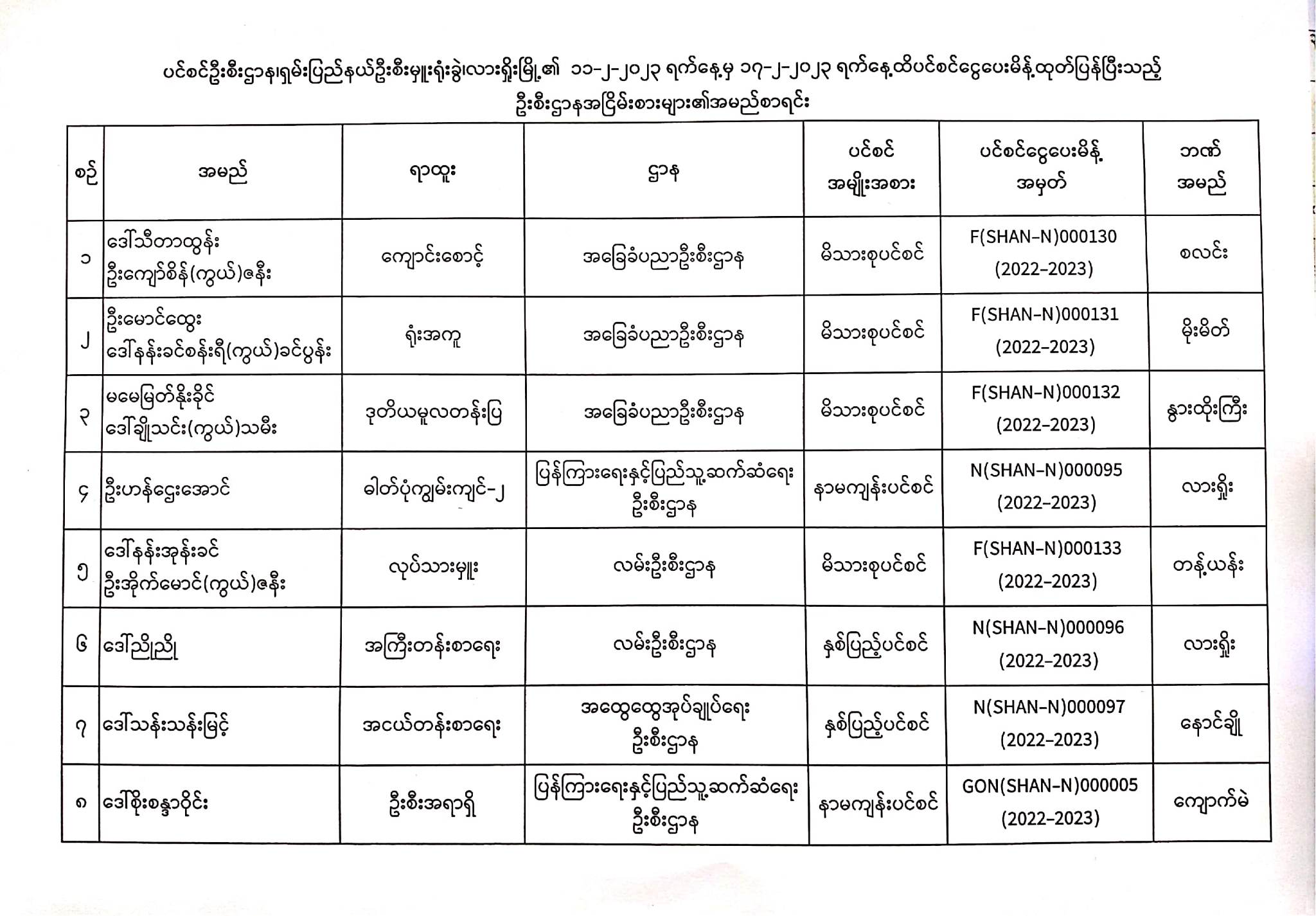 ပင်စင်ဦးစီးဌာန၊ရှမ်းပြည်နယ်(လားရှိုးမြို့)၏ငွေပေးမိန့်ထုတ်ပြန်မှုစာရင်း(၁၁-၂-၂၀၂၃ မှ ၁၇-၂-၂၀၂၃) pdfinance_editor Thu, 02/16/2023 - 13:17