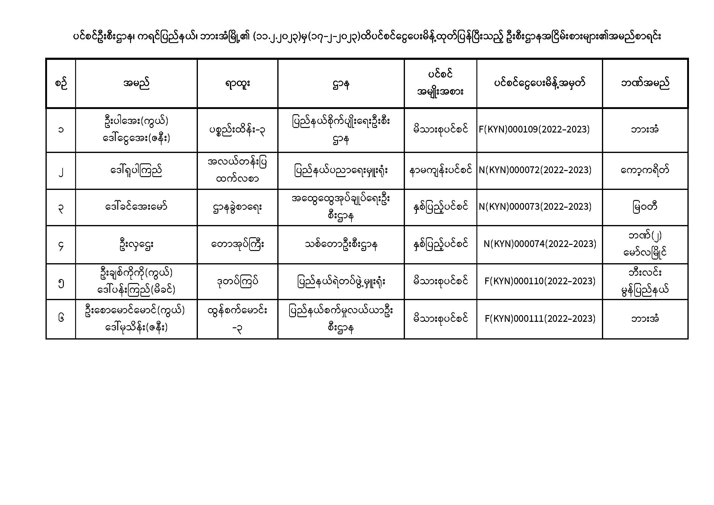 ပင်စင်ဦးစီးဌာန၊ကရင်ပြည်နယ်၏ငွေပေးမိန့်ထုတ်ပြန်မှုစာရင်း(၁၁-၂-၂၀၂၃ မှ ၁၇-၂-၂၀၂၃)) pdfinance_editor Thu, 02/16/2023 - 15:18