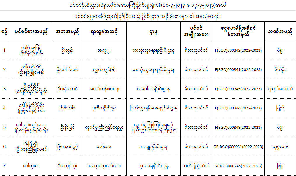 ပင်စင်ဦးစီးဌာန၊ ပဲခူးတိုင်းဒေသကြီးဦးစီးမှူးရုံး၏ ငွေပေးမိန့်ထုတ်ပြန်မှုစာရင်း (၁၁-၃-၂၀၂၃ မှ ၁၇-၃-၂၀၂၃) pdfinance_editor Mon, 04/03/2023 - 14:55