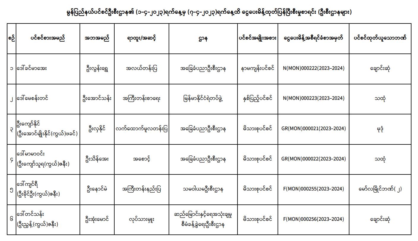 ပင်စင်ဦးစီးဌာန၊ မွန်ပြည်နယ်ဦးစီးမှူးရုံး၏ ငွေပေးမိန့်ထုတ်ပြန်မှုစာရင်း (၁-၄-၂၀၂၃ မှ ၇-၄-၂၀၂၃) pdfinance_editor Fri, 04/07/2023 - 09:56