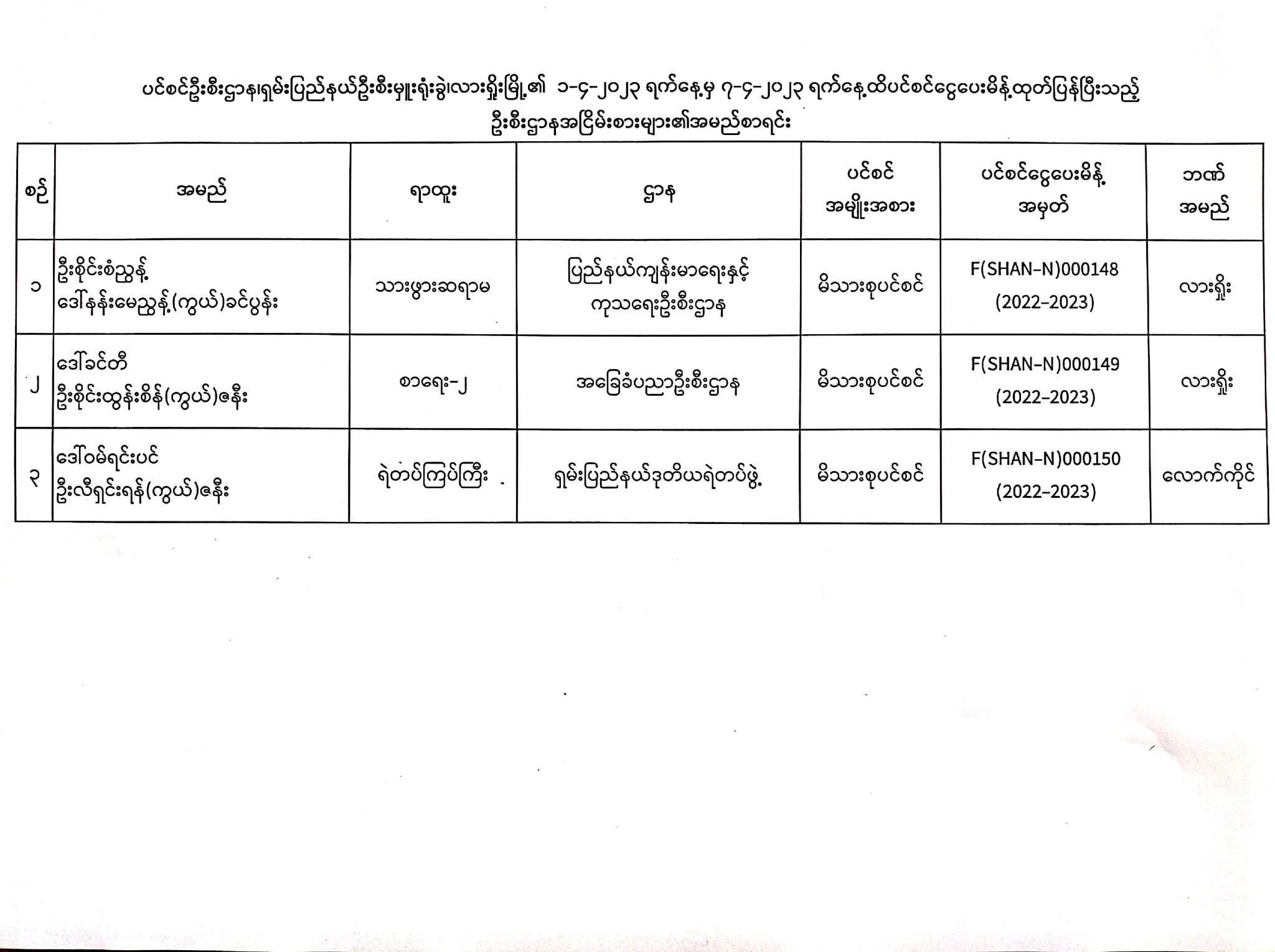ပင်စင်ဦးစီးဌာန၊ ရှမ်းပြည်နယ်ရုံးခွဲ(လားရှိုးမြို့)၏ ငွေပေးမိန့်ထုတ်ပြန်မှုစာရင်း (၁-၄-၂၀၂၃ မှ ၇-၄-၂၀၂၃) pdfinance_editor Fri, 04/07/2023 - 12:48