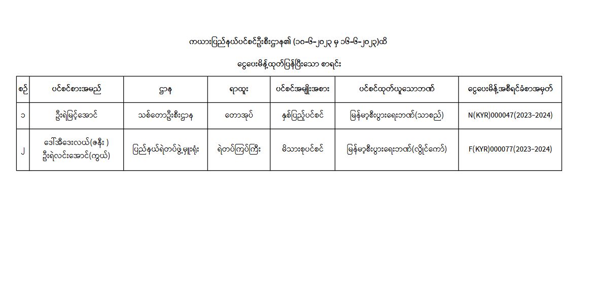 ပင်စင်ဦးစီးဌာန၊ ကယားပြည်နယ်ဦးစီးမှူးရုံး၏ ငွေပေးမိန့်ထုတ်ပြန်မှုစာရင်း (၁၀-၆-၂၀၂၃ မှ ၁၆-၆-၂၀၂၃) pdfinance_editor Wed, 06/21/2023 - 15:49