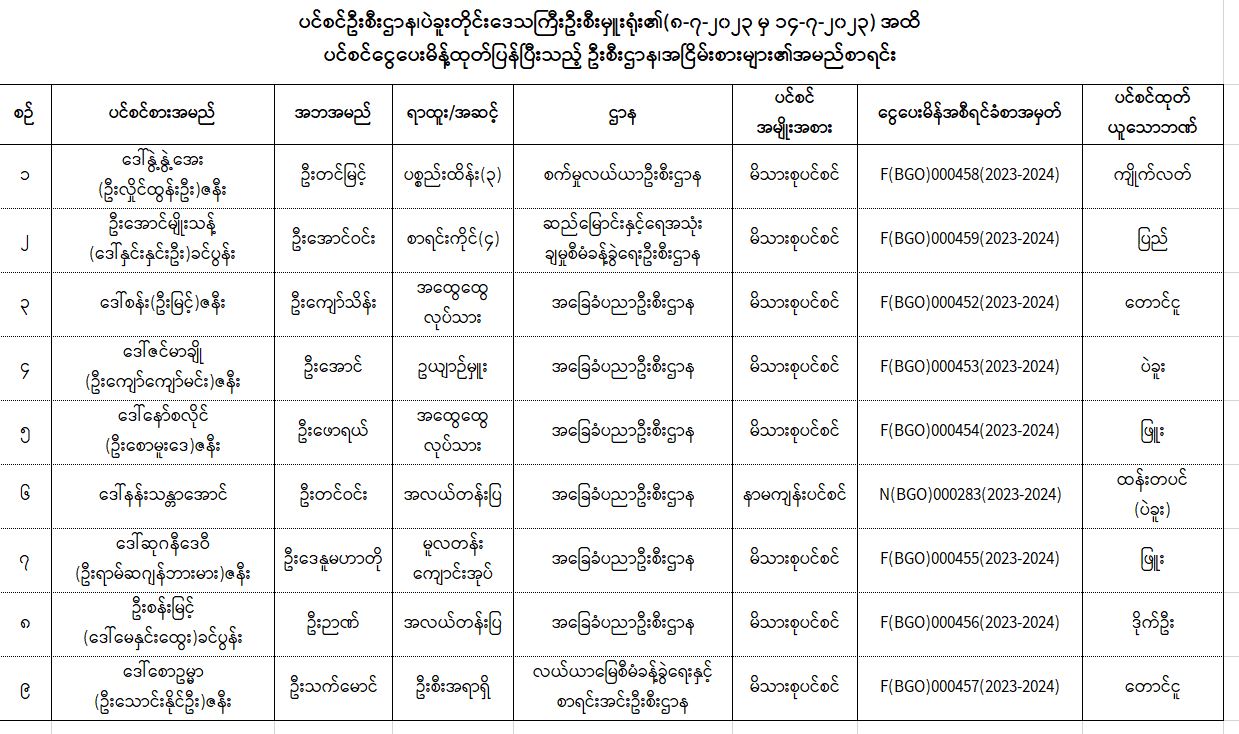 ပင်စင်ဦးစီးဌာန၊ ပဲခူးတိုင်းဒေသကြီးဦးစီးမှူးရုံး၏ ငွေပေးမိန့်ထုတ်ပြန်မှုစာရင်း (၈-၇-၂၀၂၃ မှ ၁၄-၇-၂၀၂၃)