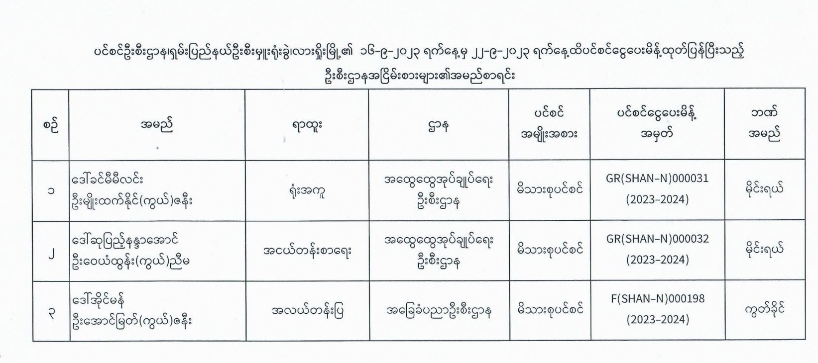 ပင်စင်ဦးစီးဌာန၊ ရှမ်းပြည်နယ်ရုံးခွဲ(လားရှိုးမြို့)၏ ငွေပေးမိန့်ထုတ်ပြန်မှုစာရင်း (၁၆-၉-၂၀၂၃ မှ ၂၂-၉ -၉-၂၀၂၃)