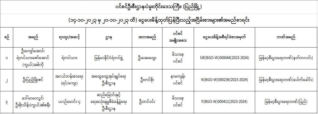 ပင်စင်ဦးစီးဌာန၊ ပဲခူးတိုင်းရုံးခွဲ(ပြည်မြို့)၏ ငွေပေးမိန့်ထုတ်ပြန်မှုစာရင်း (၁၄-၁၀-၂၀၂၃ မှ ၂၀-၁၀-၂၀၂၃) pdfinance_editor Fri, 10/20/2023 - 16:23