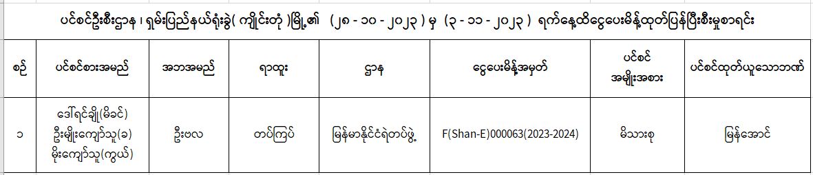 ပင်စင်ဦးစီးဌာန၊ ရှမ်းပြည်နယ်ရုံးခွဲ(ကျိုင်းတုံမြို့)၏ ငွေပေးမိန့်ထုတ်ပြန်မှုစာရင်း (၂၈-၁၀-၂၀၂၃ မှ ၃-၁၁-၂၀၂၃) pdfinance_editor Mon, 11/06/2023 - 15:42