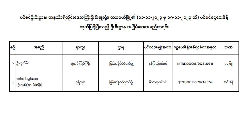ပင်စင်ဦးစီးဌာန၊ တနင်္သာရီတိုင်းဒေသကြီးဦးစီးမှူးရုံး၏ ငွေပေးမိန့်ထုတ်ပြန်မှုစာရင်း (၁၁-၁၁-၂၀၂၃ မှ ၁၇-၁၁-၂၀၂၃) pdfinance_editor Fri, 11/17/2023 - 11:15