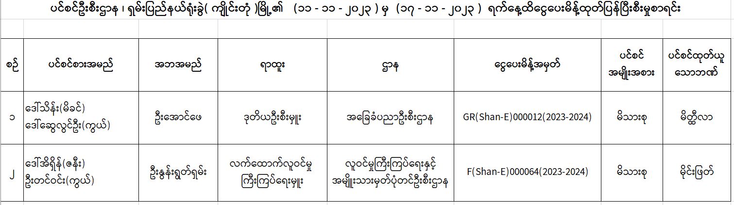 ပင်စင်ဦးစီးဌာန၊ ရှမ်းပြည်နယ်ရုံးခွဲ(ကျိုင်းတုံမြို့)၏ ငွေပေးမိန့်ထုတ်ပြန်မှုစာရင်း (၁၁-၁၁-၂၀၂၃ မှ ၁၇-၁၁-၂၀၂၃)
